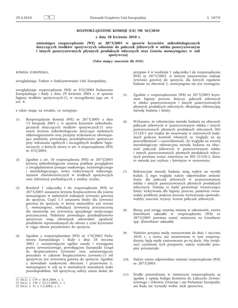 29.4.2010 PL Dziennik Urzędowy Unii Europejskiej L 107/9 ROZPORZĄDZENIE KOMISJI (UE) NR 365/2010 z dnia 28 kwietnia 2010 r. zmieniające rozporządzenie (WE) nr 2073/2005 w sprawie kryteriów mikrobiologicznych dotyczących środków spożywczych odnośnie do pałeczek jelitowych w mleku pasteryzowanym i innych pasteryzowanych płynnych produktach mlecznych oraz Listeria monocytogenes w soli spożywczej (Tekst mający znaczenie dla EOG) przypisu 4 w rozdziale 1 załącznika I do rozporządzenia (WE) nr 2073/2005, w którym ustanowiono rodzaje żywności gotowej do spożycia, dla których regularne badanie na obecność L. monocytogenes nie jest wymagane. KOMISJA EUROPEJSKA, uwzględniając Traktat o funkcjonowaniu Unii Europejskiej, uwzględniając rozporządzenie (WE) nr 852/2004 Parlamentu Europejskiego i Rady z dnia 29 kwietnia 2004 r. w sprawie higieny środków spożywczych (1), w szczególności jego art. 4 ust. 4, (5) Zgodnie z rozporządzeniem (WE) nr 2073/2005 kryte rium higieny procesu dotyczy pałeczek jelitowych w mleku pasteryzowanym i innych pasteryzowanych płynnych produktach mlecznych, obejmując referencyjną metodę badania i limity. (6) Wykazano, że referencyjna metoda badania na obecność pałeczek jelitowych w pasteryzowanym mleku i innych pasteryzowanych płynnych produktach mlecznych ISO 21528-1 jest trudna do stosowania w rutynowych bada niach podczas kontroli własnych ze względu na jej pracochłonność i czasochłonność. Ze względu na rozwój metodologiczny referencyjna metoda badania na obec ność pałeczek jelitowych w pasteryzowanym mleku i innych pasteryzowanych płynnych produktach mlecz nych powinna zostać zmieniona na ISO 21528-2, która to metoda jest szybsza i łatwiejsza w stosowaniu. (7) Referencyjne metody badania mają wpływ na wyniki badań. Z tego względu należy odpowiednio zmienić limity dla pałeczek jelitowych w pasteryzowanym mleku i innych pasteryzowanych płynnych produktach mlecznych. Zmiana ta nadal gwarantuje wystarczające limity wykrywania dla higieny procesu, ponieważ ewen tualne problemy podczas procesu wytwarzania spowodo wałyby znacznie wyższy wzrost pałeczek jelitowych. (8) Biorąc pod uwagę ostatnią zmianę w taksonomii, nazwa Enterobacter sakazakii w rozporządzeniu (WE) nr 2073/2005 powinna zostać zmieniona na Cronobacter spp. (Enterobacter sakazakii). (9) Niektóre przepisy miały zastosowanie do dnia 1 stycznia 2010 r., a nowe, już ustanowione w tym rozporzą dzeniu, będą miały zastosowanie po tej dacie. Aby zwięk szyć czytelność tych przepisów, należy wykreślić prze pisy przestarzałe. (10) Należy zatem odpowiednio zmienić rozporządzenie (WE) nr 2073/2005. (11) Środki przewidziane w niniejszym rozporządzeniu są zgodne z opinią Stałego Komitetu ds. Łańcucha Żywno ściowego i Zdrowia Zwierząt i ani Parlament Europejski, ani Rada nie wyraziły wobec nich sprzeciwu, a także mając na uwadze, co następuje: (1) Rozporządzenie Komisji (WE) nr 2073/2005 z dnia 15 listopada 2005 r. w sprawie kryteriów mikrobiolo gicznych dotyczących środków spożywczych (2) usta nawia kryteria mikrobiologiczne dotyczące niektórych mikroorganizmów oraz przepisy wykonawcze obowiązu jące podmioty prowadzące przedsiębiorstwo spożywcze przy wdrażaniu ogólnych i szczególnych środków higie nicznych, o których mowa w art. 4 rozporządzenia (WE) nr 852/2004. (2) Zgodnie z art. 10 rozporządzenia (WE) nr 2073/2005 kryteria mikrobiologiczne zostaną poddane przeglądowi z uwzględnieniem postępu naukowego, technologicznego i metodologicznego, nowo wykrywanych mikroorga nizmów chorobotwórczych w środkach spożywczych oraz informacji pochodzących z analizy ryzyka. (3) (4) Rozdział 1 załącznika I do rozporządzenia (WE) nr 2073/2005 ustanawia kryteria bezpieczeństwa dla Listeria monocytogenes w niektórych rodzajach żywności gotowej do spożycia. Część 1.3 ustanawia limity dla żywności gotowej do spożycia, w której niemożliwy jest wzrost L. monocytogenes, niebędącej żywnością przeznaczoną dla niemowląt ani żywnością specjalnego medycznego przeznaczenia. Podmioty prowadzące przedsiębiorstwo spożywcze mają obowiązek udowodnić zgodność produktów wprowadzanych do obrotu z tymi kryteriami w ciągu okresu przydatności do spożycia. Zgodnie z rozporządzeniem (WE) nr 178/2002 Parla mentu Europejskiego i Rady z dnia 28 stycznia 2002 r. ustanawiającym ogólne zasady i wymagania prawa żywnościowego, powołującym Europejski Urząd ds. Bezpieczeństwa Żywności oraz ustanawiającym procedury w zakresie bezpieczeństwa żywności (3) sól spożywcza jest żywnością gotową do spożycia. Zgodnie z dowodami naukowymi obecność i przetrwanie L. monocytogenes w soli są w normalnych warunkach mało prawdopodobne. Sól spożywczą należy zatem dodać do (1) Dz.U. L 139 z 30.4.2004, s. 1. (2) Dz.U. L 338 z 22.12.2005, s. 1. (3) Dz.U. L 31 z 1.2.2002, s. 1. L 107/10 PL Dziennik Urzędowy Unii Europejskiej 29.4.2010 PRZYJMUJE NINIEJSZE ROZPORZĄDZENIE: Artykuł 1 W załączniku I do rozporządzenia (WE) nr 2073/2005 wprowadza się następujące zmiany: 1) w rozdziale 1 wprowadza się następujące zmiany: a) pozycja 1.5 otrzymuje brzmienie: „1.5. Mielone mięso Salmonella i produkty z mięsa drobiowego przezna czone do spożycia po obróbce termicznej 5 0 Nieobecne w 25 g EN/ISO 6579 Produkty wprowadzane do obrotu w ciągu okresu przydatności do spożycia” 5 0 Nieobecne w 25 g EN/ISO 6579 Produkty wprowadzane do obrotu w ciągu okresu przydatności do spożycia” 30 0 Nieobecne w 10 g ISO/TS 22964 Produkty wprowadzane do obrotu w ciągu okresu przydatności do spożycia” b) pozycja 1.9 otrzymuje brzmienie: „1.9. Produkty z mięsa Salmonella drobiowego, przezna czone do spożycia po obróbce termicznej c) pozycja 1.24 otrzymuje brzmienie: „1.24. Preparaty w proszku do początkowego żywienia niemowląt i żywność dietetyczna w proszku specjalnego przeznaczeni