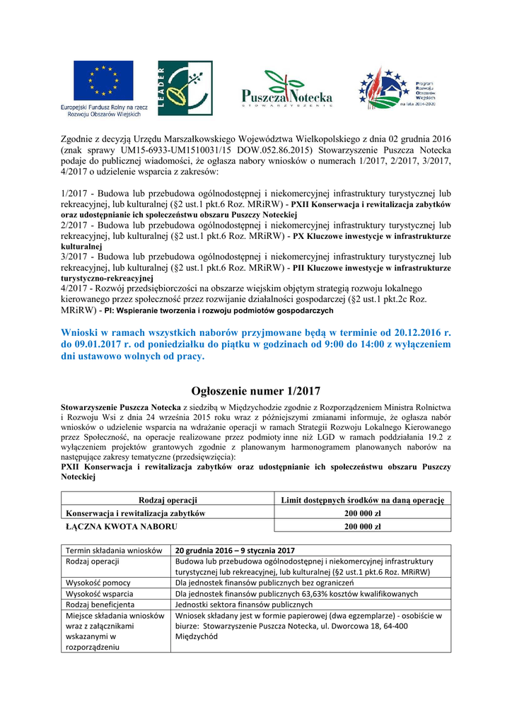 Zgodnie z decyzją Urzędu Marszałkowskiego Województwa Wielkopolskiego z dnia 02 grudnia 2016 (znak sprawy UM15-6933-UM1510031/15 DOW.052.86.2015) Stowarzyszenie Puszcza Notecka podaje do publicznej wiadomości, że ogłasza nabory wniosków o numerach 1/2017, 2/2017, 3/2017, 4/2017 o udzielenie wsparcia z zakresów: 1/2017 - Budowa lub przebudowa ogólnodostępnej i niekomercyjnej infrastruktury turystycznej lub rekreacyjnej, lub kulturalnej (§2 ust.1 pkt.6 Roz. MRiRW) - PXII Konserwacja i rewitalizacja zabytków oraz udostępnianie ich społeczeństwu obszaru Puszczy Noteckiej 2/2017 - Budowa lub przebudowa ogólnodostępnej i niekomercyjnej infrastruktury turystycznej lub rekreacyjnej, lub kulturalnej (§2 ust.1 pkt.6 Roz. MRiRW) - PX Kluczowe inwestycje w infrastrukturze kulturalnej 3/2017 - Budowa lub przebudowa ogólnodostępnej i niekomercyjnej infrastruktury turystycznej lub rekreacyjnej, lub kulturalnej (§2 ust.1 pkt.6 Roz. MRiRW) - PII Kluczowe inwestycje w infrastrukturze turystyczno-rekreacyjnej 4/2017 - Rozwój przedsiębiorczości na obszarze wiejskim objętym strategią rozwoju lokalnego kierowanego przez społeczność przez rozwijanie działalności gospodarczej (§2 ust.1 pkt.2c Roz. MRiRW) - PI: Wspieranie tworzenia i rozwoju podmiotów gospodarczych Wnioski w ramach wszystkich naborów przyjmowane będą w terminie od 20.12.2016 r. do 09.01.2017 r. od poniedziałku do piątku w godzinach od 9:00 do 14:00 z wyłączeniem dni ustawowo wolnych od pracy. Ogłoszenie numer 1/2017 Stowarzyszenie Puszcza Notecka z siedzibą w Międzychodzie zgodnie z Rozporządzeniem Ministra Rolnictwa i Rozwoju Wsi z dnia 24 września 2015 roku wraz z późniejszymi zmianami informuje, że ogłasza nabór wniosków o udzielenie wsparcia na wdrażanie operacji w ramach Strategii Rozwoju Lokalnego Kierowanego przez Społeczność, na operacje realizowane przez podmioty inne niż LGD w ramach poddziałania 19.2 z wyłączeniem projektów grantowych zgodnie z planowanym harmonogramem planowanych naborów na następujące zakresy tematyczne (przedsięwzięcia): PXII Konserwacja i rewitalizacja zabytków oraz udostępnianie ich społeczeństwu obszaru Puszczy Noteckiej Rodzaj operacji Limit dostępnych środków na daną operację Konserwacja i rewitalizacja zabytków 200 000 zł ŁĄCZNA KWOTA NABORU 200 000 zł Termin składania wniosków Rodzaj operacji Wysokość pomocy Wysokość wsparcia Rodzaj beneficjenta Miejsce składania wniosków wraz z załącznikami wskazanymi w rozporządzeniu 20 grudnia 2016 – 9 stycznia 2017 Budowa lub przebudowa ogólnodostępnej i niekomercyjnej infrastruktury turystycznej lub rekreacyjnej, lub kulturalnej (§2 ust.1 pkt.6 Roz. MRiRW) Dla jednostek finansów publicznych bez ograniczeń Dla jednostek finansów publicznych 63,63% kosztów kwalifikowanych Jednostki sektora finansów publicznych Wniosek składany jest w formie papierowej (dwa egzemplarze) - osobiście w biurze: Stowarzyszenie Puszcza Notecka, ul. Dworcowa 18, 64-400 Międzychód Forma wsparcia Minimalne wymagania Wskaźnik realizacji naboru Lokalna Strategia Rozwoju, Procedury i kryteria wyboru operacji Informacje dodatkowe Formularze wniosku o udzielenie wsparcia, wniosku o płatność i umowy Oraz w wersji elektronicznej nagrany na nośniku elektronicznym (na płycie CD/DVD) lub w formie dokumentu elektronicznego poprzez stronę www.puszczanotecka.org Dotacja bez prefinansowania Spełnienie warunków dostępu do programu, zgodności z celami ogólny, szczegółowymi oraz wskaźnikami w LSR oraz uzyskanie co najmniej 40 punktów podczas oceny zgodnie z kryteriami oceny 28. liczba zabytków poddanych pracom konserwatorskim lub restauratorskim w wyniku wsparcia otrzymanego w ramach strategii – 1 szt. Dostępne na stronie: www.puszczanotecka.org Informacji udziela biuro Stowarzyszenia Puszcza Notecka – Dworcowa 18, 64-400 Międzychód osobiście po uprzednim kontakcie telefonicznym 506 087 607 lub mailowo [email protected] Strona UMWW Departament PROW: http://www.prow.umww.pl/index.php?option=com_content&view=article&i d=877&Itemid=266 oraz www.puszczanotecka.org Ogłoszenie numer 2/2017 Stowarzyszenie Puszcza Notecka z siedzibą w Międzychodzie zgodnie z Rozporządzeniem Ministra Rolnictwa i Rozwoju Wsi z dnia 24 września 2015 roku wraz z późniejszymi zmianami informuje, że ogłasza nabór wniosków o udzielenie wsparcia na wdrażanie operacji w ramach Strategii Rozwoju Lokalnego Kierowanego przez Społeczność, na operacje realizowane przez podmioty inne niż LGD w ramach poddziałania 19.2 z wyłączeniem projektów grantowych zgodnie z planowanym harmonogramem planowanych naborów na następujące zakresy tematyczne (przedsięwzięcia): PX Kluczowe inwestycje w infrastrukturze kulturalnej Rodzaj operacji Inwestycje w infrastrukturze kulturalnej ŁĄCZNA KWOTA NABORU Termin składania wniosków Rodzaj operacji Wysokość pomocy Wysokość wsparcia Rodzaj beneficjenta Miejsce składania wniosków wraz z załącznikami wskazanymi w rozporządzeniu Forma wsparcia Minimalne wymagania Wskaźnik realizacji naboru Lokalna Strategia Rozwoju, Procedury i kryteria wyboru operacji Limit dostępnych środków na daną operację 503 404 zł 503 404 zł 20 grudnia 2016 – 9 stycznia 2017 Budowa lub przebudowa ogólnodostępnej i niekomercyjnej infrastruktury turystycznej lub rekreacyjnej, lub kulturalnej (§2 ust.1 pkt.6 Roz. MRiRW) Dla jednostek finansów publicznych bez ograniczeń Dla jednostek finansów publicznych 63,63% kosztów kwalifikowanych Jednostki sektora finansów publicznych Wniosek składany jest w formie papierowej (dwa egzemplarze) - osobiście w biurze: Stowarzyszenie Puszcza Notecka, ul. Dworcowa 18, 64-400 Międzychód Oraz w wersji elektronicznej nagrany na nośniku elektronicznym (na płycie CD/DVD) lub w formie dokumentu elektronicznego poprzez stronę www.puszczanotecka.org Dotacja bez prefinansowania Spełnienie warunków dostępu do programu, zgodności z celami ogó