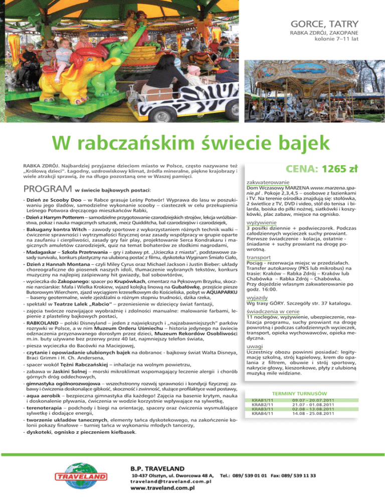 W rabczańskim świecie bajek 1265 zł w świecie bajkowych postaci: - Dzień ze Scooby Doo – w Rabce grasuje Leśny Potwór! Wyprawa do lasu w poszukiwaniu jego śladów, samodzielne wykonanie scooby – ciasteczek w celu przekupienia Leśnego Potwora dręczącego mieszkańców Rabki, - Dzień z Harrym Potterem – samodzielne przygotowanie czarodziejskich strojów, lekcja wróżbiarstwa, pokaz i nauka magicznych sztuczek, mecz Quidditcha, bal czarodziejów i czarodziejek, - Bakugany kontra Witch – zawody sportowe z wykorzystaniem różnych technik walki – ćwiczenie sprawności i wytrzymałości fizycznej oraz zasady współpracy w grupie oparte na zaufaniu i cierpliwości, zasady gry fair play, projektowanie Serca Kondrakaru i magicznych amuletów czarodziejek, quiz na temat bohaterów ze słodkimi nagrodami, - Madagaskar – Szkoła Przetrwania – gry i zabawy pt. „Ucieczka z miasta”, podstawowe zasady survivalu, konkurs plastyczny na ulubioną postać z filmu, dyskoteka Wyginam Śmiało Ciało, - Dzień z Hannah Montana – czyli Miley Cyrus oraz Michael Jackson i Justin Bieber: układy choreograficzne do piosenek naszych idoli, tłumaczenie wybranych tekstów, konkurs muzyczny na najlepiej zaśpiewany hit gwiazdy, bal sobowtórów, - wycieczka do Zakopanego: spacer po Krupówkach, cmentarz na Pęksowym Brzyzku, skocznie narciarskie: Mała i Wielka Krokiew, wjazd kolejką linową na Gubałówkę, przejście piesze Butorowym Wierchem, zjazd wyciągiem krzesełkowym do Kościeliska, pobyt w AQUAPARKU – baseny geotermalne, wiele zjeżdżalni o różnym stopniu trudności, dzika rzeka, - spektakl w Teatrze Lalek „Rabcio” – przeniesienie w dziecięcy świat fantazji, - zajęcia twórcze rozwijające wyobraźnię i zdolności manualne: malowanie farbami, lepienie z plasteliny bajkowych postaci, - RABKOLAND – polski Disneyland – jeden z największych i „najzabawniejszych” parków rozrywki w Polsce, a w nim Muzeum Orderu Uśmiechu – historia jedynego na świecie odznaczenia przyznawanego dorosłym przez dzieci, Muzeum Rekordów Osobliwości m.in. buty używane bez przerwy przez 40 lat, najmniejszy telefon świata, Dom Wczasowy MARZENA www.marzena.spanie.pl . Pokoje 2,3,4,5 – osobowe z łazienkami i TV. Na terenie ośrodka znajdują się: stołówka, 2 świetlice z TV, DVD i video, stół do tenisa i bilarda, boiska do piłki nożnej, siatkówki i koszykówki, plac zabaw, miejsce na ognisko. 3 posiłki dziennie + podwieczorek. Podczas całodziennych wycieczek suchy prowiant. Pierwsze świadczenie - kolacja, ostatnie śniadanie + suchy prowiant na drogę powrotną. Pociąg - rezerwacja miejsc w przedziałach. Transfer autokarowy (PKS lub mikrobus) na trasie: Kraków – Rabka Zdrój – Kraków lub Chabówka – Rabka Zdrój – Chabówka. Przy dojeździe własnym zakwaterowanie po godz. 16:00. Wg trasy GÓRY. Szczegóły str. 37 katalogu. 11 noclegów, wyżywienie, ubezpieczenie, realizacja programu, suchy prowiant na drogę powrotną i podczas całodziennych wycieczek, transport, opieka wychowawców, opieka medyczna. - piesza wycieczka do Bacówki na Maciejowej, - czytanie i opowiadanie ulubionych bajek na dobranoc - bajkowy świat Walta Disneya, Braci Grimm i H. Ch. Andersena, - spacer wokół Tężni Rabczańskiej – inhalacje na wolnym powietrzu, - zabawa w Jaskini Solnej – morski mikroklimat wspomagający leczenie alergii i chorób górnych dróg oddechowych, Uczestnicy obozu powinni posiadać: legitymację szkolną, strój kąpielowy, krem do opalania z filtrem, obuwie i strój sportowy, nakrycie głowy, kieszonkowe, płyty z ulubioną muzyką mile widziane. - gimnastyka ogólnorozwojowa – wszechstronny rozwój sprawności i kondycji fizycznej: zabawy i ćwiczenia doskonalące gibkość, skoczność i zwinność, służące profilaktyce wad postawy, - aqua aerobik – bezpieczna gimnastyka dla każdego! Zajęcia na basenie krytym, nauka i doskonalenie pływania, ćwiczenia w wodzie korzystnie wpływające na sylwetkę, TERMINY TURNUSÓW - terenoterapia – podchody i biegi na orientację, spacery oraz ćwiczenia wysmuklające sylwetkę i dodające energii, - tworzenie układów tanecznych, elementy tańca dyskotekowego, na zakończenie kolonii pokazy finałowe – turniej tańca w wykonaniu młodych tancerzy, - dyskoteki, ognisko z pieczeniem kiełbasek. www.wakacjezprzygoda.pl 29