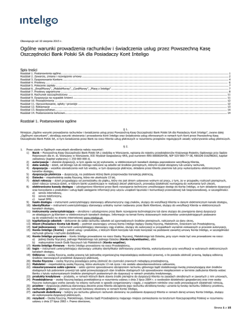 Obowiązuje od 10 sierpnia 2015 r. Ogólne warunki prowadzenia rachunków i świadczenia usług przez Powszechną Kasę Oszczędności Bank Polski SA dla Posiadaczy Kont Inteligo Spis treści Rozdział Rozdział Rozdział Rozdział Rozdział Rozdział Rozdział Rozdział Rozdział Rozdział Rozdział Rozdział Rozdział Rozdział 1. Postanowienia ogólne .............................................................................................................................................................................................................. 1 2. Zawarcie, zmiana i rozwiązanie umowy .................................................................................................................................................................................... 2 3. Dysponowanie Kontem ............................................................................................................................................................................................................ 4 4. Przelewy...... ......................................................................................................................................................................................................................... 6 5. Polecenie zapłaty .................................................................................................................................................................................................................... 7 6. „EmailMoney”, „MobileMoney”, „CardMoney”, „Płacę z Inteligo” ................................................................................................................................................ 7 7. Przelewy zagraniczne .............................................................................................................................................................................................................. 8 8. Rachunek oszczędnościowy ................................................................................................................................................................................................... 11 9. Dyspozycja na wypadek śmierci ............................................................................................................................................................................................. 11 10. Powiadomienia .................................................................................................................................................................................................................... 12 11. Oprocentowanie, opłaty i prowizje ....................................................................................................................................................................................... 12 12. Reklamacje ........................................................................................................................................................................................................................ 13 13. Bezpieczeństwo ................................................................................................................................................................................................................... 14 14. Postanowienia końcowe ....................................................................................................................................................................................................... 14 Rozdział 1. Postanowienia ogólne § 1. Niniejsze „Ogólne warunki prowadzenia rachunków i świadczenia usług przez Powszechną Kasę Oszczędności Bank Polski SA dla Posiadaczy Kont Inteligo”, zwane dalej „Ogólnymi warunkami”, określają warunki otwierania i prowadzenia Kont Inteligo oraz świadczenia usług oferowanych w ramach tych Kont przez Powszechną Kasę Oszczędności Bank Polski SA, w tym świadczenia przez Bank na rzecz Klienta usług płatniczych w rozumieniu przepisów regulujących zasady wykonywania usług płatniczych. 1. § 2. Przez użyte w Ogólnych warunkach określenia należy rozumieć: 1) Bank – Powszechną Kasę Oszczędności Bank Polski SA z siedzibą w Warszawie, wpisaną do rejestru przedsiębiorców Krajowego Rejestru Sądowego przy Sądzie Rejonowym dla m. st. Warszawy w Warszawie, XIII Wydział Gospodarczy KRS, pod numerem KRS 0000026438, NIP 525-000-77-38, REGON 016298263, kapitał zakładowy (kapitał wpłacony) 1 250 000 000 zł, 2) autoryzacja – złożenie dyspozycji, w tym zgoda na jej wykonanie, w elektronicznych kanałach dostępu poprzedzone weryfikacją Klienta, 3) data waluty – dzień, od którego lub do którego naliczane są odsetki od środków pieniężnych, którymi został obciążony lub uznany rachunek, 4) dyspozycja – wszelkie oświadczenia woli lub wiedzy, w tym dyspozycje płatnicze, składane przez Klienta pisemnie lub przy wykorzystaniu elektronicznych kanałów dostępu, 5) dyspozycja płatnicza – dyspozycję, na podstawie której Bank przeprowadza transakcję płatniczą, 6) Dziecko – niepełnoletnią osobę fizyczną, która nie ukończyła 13 lat, 7) dzień roboczy – dzień przypadający od poniedziałku do piątku, który nie jest dniem ustawowo wolnym od pracy, z tym, że w przypadku rozliczeń pieniężnych, dzień roboczy oznacza dzień, w którym banki uczestniczące w realizacji zleceń płatniczych, prowadzą działalność wymaganą do wykonania tych zleceń, 8) elektroniczne kanały dostępu – udostępnione Klientowi przez Bank rozwiązania techniczne umożliwiające dostęp do Konta Inteligo, w tym składanie dyspozycji oraz korzystanie z produktów i usług bądź zasięganie informacji przy użyciu urządzeń łączności i komunikacji przewodowej lub bezprzewodowej, w szczególności: a) serwis internetowy, b) serwis telefoniczny, c) kanał SMS, 9) hasło dostępu – instrument uwier