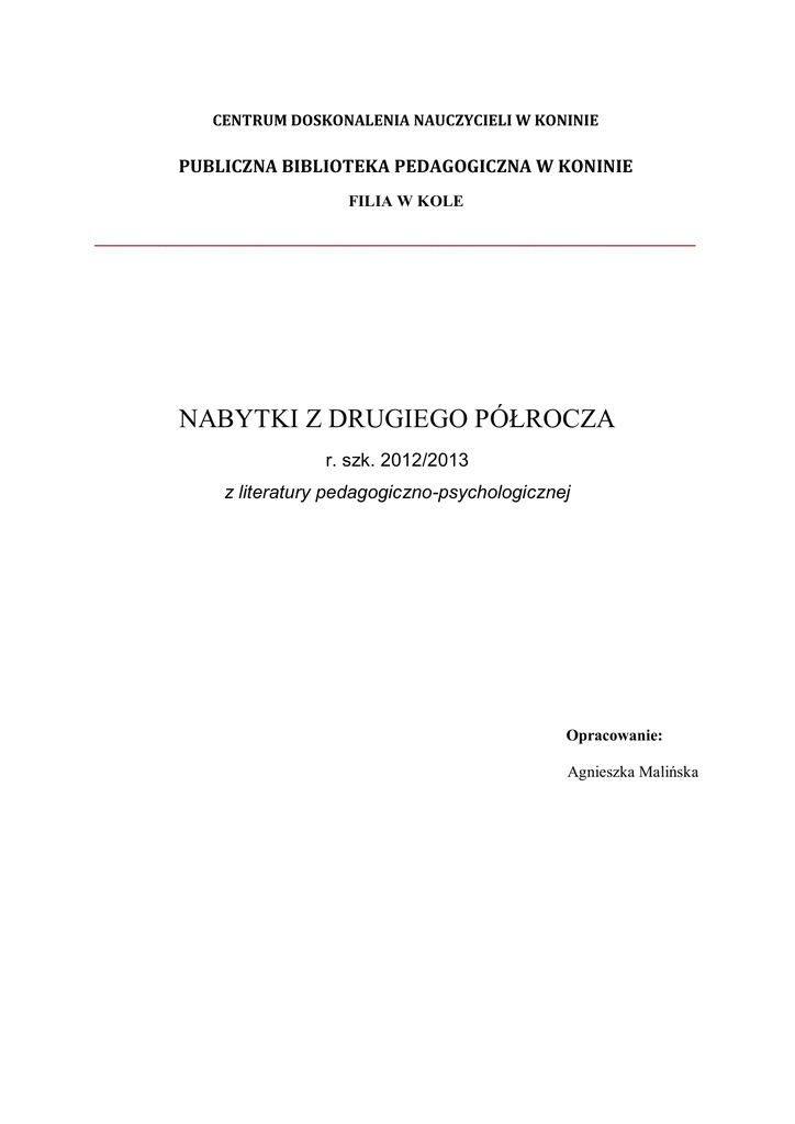 CENTRUM DOSKONALENIA NAUCZYCIELI W KONINIE PUBLICZNA BIBLIOTEKA PEDAGOGICZNA W KONINIE FILIA W KOLE ___________________________________________________________________________ NABYTKI Z DRUGIEGO PÓŁROCZA r. szk. 2012/2013 z literatury pedagogiczno-psychologicznej Opracowanie: Agnieszka Malińska 1. Alkoholizm : przewodnik po terapii / Michał Kurdziej.- Sosnowiec : Wydawnictwo Projekt-Kom, 2007. Sygnatura: 37701 2. Biblioteki pedagogiczne wobec wyzwań współczesnej oświaty : materiały konferencji naukowej, Kalisz 11-12 maja 2006 / pod red. Danuty Wańki.- Kalisz : Kaliskie Towarzystwo Przyjaciół Nauk, 2008. Sygnatura: 37642 3. Człowiek niepełnosprawny w otoczeniu społecznym / red. nauk. Hanna Kubiak, Anna Jakoniuk-Diallo.- Warszawa : Difin, 2011. Sygnatura: 37634 4. Dowód : prawdziwa historia neurochirurga, który przekroczył granicę śmierci i odkrył niebo / Eben Alexander.- Kraków : Znak Litera Nova, 2013. Sygnatura: 37683 5. Dzieci i młodzież z niepełnosprawnością intelektualną w systemie edukacji / pod red. Marzeny Buchnat, Beaty Tylewskiej-Nowak.- Warszawa : Difin, 2012. Sygnatura: 37619 6. Dzieci krzywdzone i wykorzystywane seksualnie : poradnik dla nauczycieli, pedagogów i pracowników socjalnych / Izabela Kałka.- Sosnowiec : Wydawnictwo Projekt-Kom, 2007. Sygnatura: 35659 , 37699 7. Dzieci krzywdzone i wykorzystywane seksualnie dla rodziców : poradnik dla rodziców i opiekunów / Izabela Kałka.- Sosnowiec : Wydawnictwo Projekt-Kom, 2007. Sygnatura: 37700 8. Geniusz dzieci Indygo : nowe dzieci nie z tego świata / P. M. H. Atwater.- Białystok : Studio Astropsychologii, 2008. Sygnatura: 37711 9. Geopolityka emocji : jak kultury strachu, upokorzenia, nadziei przeobrażają świat / Dominique Moisi.- Warszawa : Wydawnictwo Naukowe PWN, 2012. Sygnatura: 37591 10. Jak być jeszcze lepszym? : ewaluacja w edukacji / pod red. Grzegorza Mazurkiewicza.- Kraków : Wydawnictwo Uniwersytetu Jagiellońskiego, 2012. Sygnatura: 37614 , 37615 11. Jak mądrze kochać dzieci : poradnik dla zagubionych rodziców / Barbara Jakubowska.- Wyd. 2.- Warszawa : Wydawnictwo W.A.B., 2007. Sygnatura: 37714 12. Jak pracować z uczniem zdolnym? : poradnik nauczyciela matematyki : praca zbiorowa / pod red. Małgorzaty Mikołajczyk ; [aut. Jacek Dymel i in. ; Ośrodek Rozwoju Edukacji].- Warszawa : Ośrodek Rozwoju Edukacji, 2012. Sygnatura: 37668 , 37669 , 37670 13. Jak pracować ze zdolnymi? : poradnik dla nauczycieli i rodziców / Marcin Braun, Maria Mach.- Warszawa : Ośrodek Rozwoju Edukacji, [2012]. Sygnatura: 37606 , 37607 , 37608 14. Jak wspierać rozwój i zdrowie młodzieży : pakiet edukacyjny zgodny z koncepcją i metodami pracy szkoły promującej zdrowie / Ian Young.- Warszawa : Ośrodek Rozwoju Edukacji, 2011. Sygnatura: 37663 15. Jak wychować szczęśliwe dziecko / John Medina.- Kraków : Wydawnictwo Literackie, 2012. Sygnatura: 37707 16. Jak wychowywać dziecko, aby umiało się bronić / Debbie i Mike Gardner. - Białystok : Studio Astropsychologii, 2005. Sygnatura: 37713 17. Jak zainteresować uczniów astronomią w szkole podstawowej, gimnazjum i szkole ponadgimnazjalnej? : poradnik dla nauczycieli edukacji wczesnoszkolnej, przyrody, fizyki i geografii / Krzysztof Gołębiowski [i in.].- Warszawa : Ośrodek Rozwoju Edukacji, 2012. Sygnatura: 37597 , 37598 , 37599 18. Koło matematyczne w gimnazjum : (tematycznie ułożone zadania godne zainteresowania) / Zbigniew Bobiński, Piotr Nodzyński, Mirosław Uscki ; [Towarzystwo Upowszechniania Wiedzy i Nauk Matematycznych].- Toruń : Wydawnictwo Aksjomat Piotr Nodzyński, 2010. Sygnatura: 37697 19. Komunikacja poprzez ruch : Ruch Rozwijający Sherborne - dążenie do poszerzania perspektyw / Cyndi Hill.- Warszawa : Centrum Szkoleniowo-Wydawnicze Arteer Elżbieta Rybicka, 2013. Sygnatura: 37684 20. Liga zadaniowa : zbiór zadań dla uczniów zainteresowanych matematyką / Zbigniew Bobiński, Piotr Nodzyński, Mirosław Uscki.- Wyd. 2 popr. i uzup.- Toruń : Wydawnictwo Aksjomat, 2004. Sygnatura: 37698 21. Nie musisz tego słuchać / Arthur H. Bell.- Poznań : Dom Wydawniczy "Rebis", 2006. Sygnatura: 37678 22. Niepełnosprawność - w zwierciadle dorosłości / red. nauk. Remigiusz J. Kijak.Kraków : Oficyna Wydawnicza "Impuls", 2012. Sygnatura: 94923 , 94676 , 37623 23. Nierówność szans edukacyjnych - przyczyny, skutki, koncepcje zmian : praca zbiorowa / pod red. Wiktora Żłobickiego i Beaty Maj.- Kraków : Oficyna Wydawnicza "Impuls", 2012. Sygnatura: 37624 24. Obniżanie poziomu przemocy i lęku młodzieży gimnazjalnej / Agnieszka LewickaZelent.- Lublin : Wydawnictwo Uniwersytetu Marii Curie-Skłodowskiej, 2012. Sygnatura: 37625 25. Organizacja i realizacja edukacji zdrowotnej w szkole : poradnik dla dyrektorów szkół i nauczycieli gimnazjum : praca zbiorowa / pod red. Barbary Woynarowskiej.Warszawa : Ośrodek Rozwoju Edukacji, 2012. Sygnatura: 37658 26. Organizacja i realizacja edukacji zdrowotnej w szkole : poradnik dla dyrektorów szkół i nauczycieli szkół podstawowych : praca zbiorowa / pod red. Barbary Woynarowskiej.Warszawa : Ośrodek Rozwoju Edukacji, 2012. Sygnatura: 37613 27. Organizacja i realizacja edukacji zdrowotnej w szkole : poradnik dla dyrektorów szkół i nauczycieli szkół ponadgimnazjalnych : praca zbiorowa / pod red. Barbary Woynarowskiej.- Warszawa : Ośrodek Rozwoju Edukacji, 2012. Sygnatura: 37612 28. Pedagogika : kluczowe zagadnienia : podręcznik akademicki / Friedrich W. Kron.Sopot : Gdańskie Wydawnictwo Psychologiczne, 2012. Sygnatura: 37626 29. Pedagogika muzyki : teoretyczne podstawy powszechnego kształcenia muzycznego / Wiesława Aleksandra Sacher.- Kraków : Oficyna Wydawnicza "Impuls", 2012. Sygnatura: 37627 30. Pedagogika porównawcza : podstawy międzynarodowych badań oświatowych : podręcznik akademicki / Jan Průcha ; red. nauk. Bogusław Śliwerski. - Warszawa : Wydawnictwo Naukowe PWN, 2004. Sygnatura: 34124 , 37677 31. Płeć kulturowa nauczycieli : funkcjonowanie w