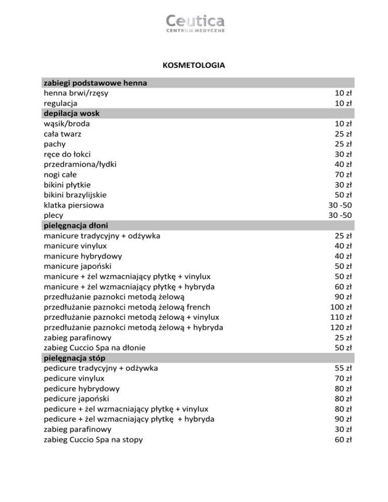 KOSMETOLOGIA zabiegi podstawowe henna henna brwi/rzęsy regulacja depilacja wosk wąsik/broda cała twarz pachy ręce do łokci przedramiona/łydki nogi całe bikini płytkie bikini brazylijskie klatka piersiowa plecy pielęgnacja dłoni manicure tradycyjny + odżywka manicure vinylux manicure hybrydowy manicure japoński manicure + żel wzmacniający płytkę + vinylux manicure + żel wzmacniający płytkę + hybryda przedłużanie paznokci metodą żelową przedłużanie paznokci metodą żelową french przedłużanie paznokci metodą żelową + vinylux przedłużanie paznokci metodą żelową + hybryda zabieg parafinowy zabieg Cuccio Spa na dłonie pielęgnacja stóp pedicure tradycyjny + odżywka pedicure vinylux pedicure hybrydowy pedicure japoński pedicure + żel wzmacniający płytkę + vinylux pedicure + żel wzmacniający płytkę + hybryda zabieg parafinowy zabieg Cuccio Spa na stopy 10 zł 10 zł 10 zł 25 zł 25 zł 30 zł 40 zł 70 zł 30 zł 50 zł 30 -50 30 -50 25 zł 40 zł 40 zł 50 zł 50 zł 60 zł 90 zł 100 zł 110 zł 120 zł 25 zł 50 zł 55 zł 70 zł 80 zł 80 zł 80 zł 90 zł 30 zł 60 zł zabiegi na twarz oczyszczanie manualne oczyszczanie na zimno Anny LOTAN peeling kawitacyjny/mikrodermabrazja+ampułka+maska algowa mesoestetic Energy C (peeling, ampułka, maska+masaż) mesoestetic Collagen 360 (peeling, ampułka, maska+masaż) mesoestetic Stem Cell (peeling, ampułka, maska+masaż) mesoestetic Radiance DNA (peeling, ampułka, maska+masaż) PAKIET 5 zabiegów (krem GRATIS) mesoestetic ENERGY C (peeling, ampułka, maska, masaż) PAKIET 5 zabiegów (krem GRATIS) mesoestetic COLLAGEN 360 (peeling, ampułka, maska, masaż) PAKIET 5 zabiegów (krem GRATIS) mesoestetic STEAM CELL (peeling, ampułka, maska, masaż) PAKIET 5 zabiegów (krem GRATIS) mesoestetic RADIANCE DNA (peeling, ampułka, maska, masaż) 80 zł 150 zł 100 zł 200 zł 250 zł 250 zł 300 zł 950 zł 1200 zł 1200 zł 1400 zł pH formuła C.R. (leczniczy resurfacing skóry naczyniowej) pH formuła V.I.T.A.C. retix C maska z 4% Retinolem retix C maska z 4% Retinolem + Mandel peel 50% 300 zł 200 zł 220 zł 300 zł EXUVIANCE pod oczy – zabieg liftingujący (BionicTonic kuracja złuszczająca +serum pro-kolagenowego zawierające komórki macierzyste + odmładzające płatki z Retinolem+masaż +intensywny krem naprawczy) 100 zł EXUVIANCE pod oczy OptiLight - zabieg rozjaśniający, liftingujący (Peeling rozświetlający z kwasem cytrynowym+BionicTonic kuracja złuszczająca+OptiLight serum rozświetlające + masaż + intensywny krem naprawczy) 150 zł EXUVIANCE zabieg likwidujący rumień (BionicTonic+kwas laktobionowy+ serum Antiredness Calmine + maska z glinki porcelanowej z wyciągiem z kasztanowca) 150 zł Zabieg SAKURA uszczelniający popękane naczynia i zmniejszający rumień (peeling enzymatyczny/kawitacja/mikrodermabrazja + łagodząca ampułka De-Stress+maska z ekstraktem z sakury 120/150 Sakura Sensitive Arkana + masaż limfatyczny) Zabieg LIFTING Effect ( peeling enzymatyczny/kawitacja/ mikrodermabrazja + ampułka napinająca Lifting efect + maska Lactobionic & vit. C z aloesem, kwasem laktobionowym, kwasem hialuronowym i witaminą C + masaż limfatyczny) Zabieg MELA rozjaśniający przebarwienia i niwelujący skutki fotoagingu (peeling/kawitacja/mikrodermabrazja +ampułka rozjaśniająca Melafidin + maska TXA&Pearl z kwasem traneksam owym po zabiegu depigmentacji + masaż) Zabieg DETOX-ALGA o działaniu bakteriostatycznym i przeciwzapalnym ( peeling/kawitacja/mikrodermabrazja + ampułka Normalizing + maska algowa z chlorofilem, algami brunatnymi i ziemią okrzemkową) Peelingi Medyczne Azelainowy FAST PEEL xylogic+maska kremowa Azelainowy FAST PEEL xylogic + kwas mlekowy+ maska algowa z rutyną/kremowa Migdałowy 50% xylogic + maska algowa/kremowa Pirogronowy Piruvex mesoestetic + maska kremowa Mandelic 50% mesoestetic+ maska kremowa Salicylowy mesoestetic + maska kremowa Mlekowy 30% mesoestetic Azelainowy + salicylowy 20% mesoestetic+ maska kremowa Mezoterapia mikroigłowa derma roller z koktajlem witaminowym Mesohyal derma roller z kwasem hialuronowym/NCTC 120/ 150 120/150 120/150 150 zł 150 zł 150 zł 170 zł 170 zł 170 zł 170 zł 170 zł 150 zł 250 zł makijaż permanentny kreska górna zagęszczająca linię rzęs 400 zł kreska górna dekoracyjna 500 zł kreska dolna 350 zł brwi metoda włoskowa 900 zł brwi metoda cieniowania 900 zł Microblading 900 zł Usta 900 zł ceny makijażu są podane wraz z 1 korektą po miesiącu. Każda kolejna korekta 30% ceny regularnej. zabiegi na ciało vacum masaż ( masaż próżniowy, ujędrniający ) vacum brzuch vacum uda pośladki vacum brzuch uda pośladki pakiet 4 zabiegów vacum brzuch pakiet 8 zabiegów vacum brzuch pakiet 4 zabiegów vacum uda+pośladki pakiet 8 zabiegów vacum uda+pośladki pakiet 4 zabiegów vacum brzuch+uda+pośladki pakiet 8 zabiegów vacum brzuch+uda+pośladki Bandaże AROSHA pakiet 4 zabiegów bandaży Arosha (peeling, bandaż, masaż vacum) pakiet 8 zabiegów bandaży Arosha (peeling, bandaż, masaż vacum/RF/ultradźwięki) Lipoliza Lipoliza mikroigłowa (dermaroller) uda +pośladki (L-Karnityna) Lipoliza iniekcyjna (fosfatydylocholina) (podbródek, brzuch, pośladki) 40 zł 60 zł 80 zł 140 zł 280 zł 200 zł 400 zł 300 zł 600 zł 750 zł 1350zł od 250 zł od 250 zł THERMLIFTING FALE RF/ULTRADŹWIĘKI Thermlifting RF twarz: odmładzanie, redukcja zmarszczek, nieinwazyjny lifting cena Okolice oczu 70 Szyja 100 Dekolt 100 Twarz/szyja 150 Twarz/szyja/dekolt 200 Thermlifting RF/ultradźwięki ciało: redukcja tkanki tłuszczowej+ ujędrnianie red. cellulitu cena Brzuch 100 Uda/pośladki 120 Brzuch/uda/pośladki 180 Ramiona 80 Pakiet 6 350 500 500 750 1000 Pakiet 6 500 600 900 400 DEPILACJA LASEROWA Laser diodowy 808 nm DEPILACJA laserowa Górna warga Broda Baki Ramiona/brzuch Tors Pachy Uda Łydki Uda/łydki Bikini płytkie Bikini głębokie cena 100 150 100 200 300 150 300 300 550 150 300 Pakiet 4 30
