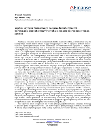 dr Jacek Rodzinka mgr Joanna Hady Wyższa Szkoła Informatyki i Zarządzania w Rzeszowie Wpływ kryzysu finansowego na sprzedaż ubezpieczeń – porównanie danych rzeczywistych z ocenami pośredników finansowych Analizując wskaźniki makroekonomiczne dla Polski, należy stwierdzić, iż ostatnie lata były dla naszego kraju czasem dużych zmian. Mający swój początek w 2007 r. kryzys na rynkach finansowych stał się niezaprzeczalnym faktem, a reperkusje spowodowane owym kryzysem są i będą odczuwalne jeszcze przez dłuższy czas. Z miesiąca na miesiąc liczba bezrobotnych w Polsce rośnie, a klimat panujący wśród przedsiębiorców i pracowników w ostatnich latach znacznie się pogorszył. Na ile są to jedynie wyniki medialnego szumu, a na ile realne tendencje w gospodarce przekonamy się w najbliższych miesiącach lub nawet latach. Nastroje ekonomiczne Polaków również ulegają zmianom. Badania TNS OBOP pokazują, iż w I kwartale 2009 r. wskaźnik nastrojów społecznych obniżył się o 17,9 pkt. w stosunku do ostatniego kwartału 2008 r. i wyniósł 88,3 pkt. Sytuacja uległa zmianie w III kwartale 2009 r. Odnotowano poprawę nastrojów konsumenckich, która świadczy pośrednio o polepszaniu się niekorzystnej sytuacji społeczno-ekonomicznej gospodarstw domowych 1 obserwowaną od IV kwartału 2008 r. . W kwietniu 2010 r. CBOS przeprowadził badanie na reprezentatywnej grupie 1056 dorosłych Polaków dotyczące aktualnych problemów i wydarzeń. Po raz pierwszy od dwóch lat więcej Polaków twierdzi, iż sytuacja w kraju zmierza w dobrym kierunku2. Kryzys dotknął w różnym stopniu wiele branż i sektorów. Z całą pewnością, sytuacja gospodarcza wzmocniła zapotrzebowanie na skutecznych handlowców, wykwalifikowanych pracowników oraz inżynierów. Podobnie doświadczenie w branży IT równie skutecznie może chronić przed negatywnymi skutkami kryzysu. Co więcej, kryzys na światowym rynku finansowym rodzi naturalną skłonność konsumentów do poszukiwania rozwiązań finansowych, które gwarantować będą bezpieczeństwo, dlatego też należy spodziewać się rosnącej wśród Polaków skłonności do powszechnego ubezpieczania się. Można tu wymienić produkty, na które rośnie popyt, tzn. ubezpieczenia od utraty pracy, od utraty wartości nieruchomości itp. Andrzej Maciążek – członek zarządu Polskiej Izby Ubezpieczeń – zaznacza, iż w ostatnich latach zaobserwowano silny wzrost zainteresowania polisami na życie, co wpłynęło na dynamiczny wzrost zbieranych przez towarzystwa składek. Uważa on, iż wzrost przypisu składki powinien zostać zachowany, można co najwyżej spodziewać się spadku dynamiki – podobna sytuacja może mieć miejsce wśród produktów typu bancassurance, których sprzedaż jest wprost uzależniona od sprzedaży usług bankowych. Natomiast w odniesieniu do polis majątkowych w segmencie ubezpieczeń dla klientów indywidualnych należy spodziewać się stabilnego wzrostu. Wśród produktów dla firm nie należy oczekiwać większych zmian, podobnie jak w ubezpieczeniach komunikacyjnych, aczkolwiek w przypadku spadku sprzedaży nowych aut możliwe jest zmniejszenie dynamiki przypisu składki z tytułu polis AC3. Jaki wpływ na rynek ubezpieczeń ma obecna sytuacja gospodarcza? Jakie tendencje dominują na polskim rynku ubezpieczeniowym? I jak na to wszystko patrzą i reagują pośrednicy finansowi? W dalszej części artykułu podjęto próbę analizy najnowszych wyników polskiego rynku ubezpie1 http://www.stat.gov.pl. http://www.tns-global.pl. 3 http://www.ubezpieczenie.com.pl. 2 64 Finansowy Kwartalnik Internetowy „e-Finanse” 2010, vol. 6, nr 2 www.e-finanse.com Wyższa Szkoła Informatyki i Zarządzania w Rzeszowie Ul. Sucharskiego 2 35-225 Rzeszów czeń z uwzględnieniem elementów świadczących o kryzysie na rynkach finansowych oraz zaprezentowano wyniki badań dotyczących pracy pośredników finansowych w dobie kryzysu finansowego. Rynek ubezpieczeń w dobie kryzysu Rynek finansowy w Polsce, oprócz krajowych źródeł ryzyka, jest narażony na dodatkowe ryzyko, którego źródłem są rynki globalne. To właśnie dzięki globalizacji rynków kryzys może powstać w wyniku tzw. contingency effect (efektu zakażenia). Źródłem kryzysu finansowego w Polsce (podobnie jak w innych krajach) była zła sytuacja na amerykańskim rynku kredytów hipotecznych. Kryzys amerykański „zarażał” kolejno rynki krajów europejskich (zwłaszcza krajów UE) i azjatyckich. Mimo iż w ciągu ostatnich 40 lat kryzysów było wiele, to obecny odczuwalny jest bardzo dotkliwie, gdyż pojawił się po okresie 25-letniej koniunktury. Rozwój rynku ubezpieczeniowego uległ znacznemu spowolnieniu, a nawet zatrzymaniu w momencie pojawienia się kryzysu finansowego. Według danych KNF, wynik netto ubezpieczycieli na koniec 2009 r. wyniósł 6,57 mld zł, co oznacza wzrost o 13,6% w stosunku do analogicznego okresu roku poprzedniego4. Na wynik finansowy netto złożył się wynik ubezpieczeń na życie (dział I) – 3, 99 mld zł (wzrost w stosunku do roku 2008 o 1,48 mld zł) i towarzystw pozostałych ubezpieczeń majątkowych i osobowych (dział II) – 2,58 mld zł (o 699 mln zł mniejszy niż na koniec roku 2008)5. Składka przypisana brutto ubezpieczeń na życie na koniec roku 2009 wyniosła 30,28 mld zł, co stanowi spadek o 22,3% w ujęciu rocznym. Z kolei składka przypisana brutto działu II na koniec roku 2009 wyniosła 21,06 mld zł (wzrost o 3,7% w ujęciu rocznym). Powodem spadku zbioru składki w ubezpieczeniach działu I był spadek zainteresowania ubezpieczeniami grupy 3 (ubezpie6 czenia na życie z funduszem kapitałowym) . W 2009 r. odszkodowania i świadczenia brutto wypłacone wzrosły ogółem o 62,4% w stosunku do 2008 r., z tego w ubezpieczeniach na życie o 87,2%, w pozostałych ubezpieczeniach osobowych i majątkowych o 23,9%. Odszkodowania i świadczenia wypłacone na udziale własnym wyniosły