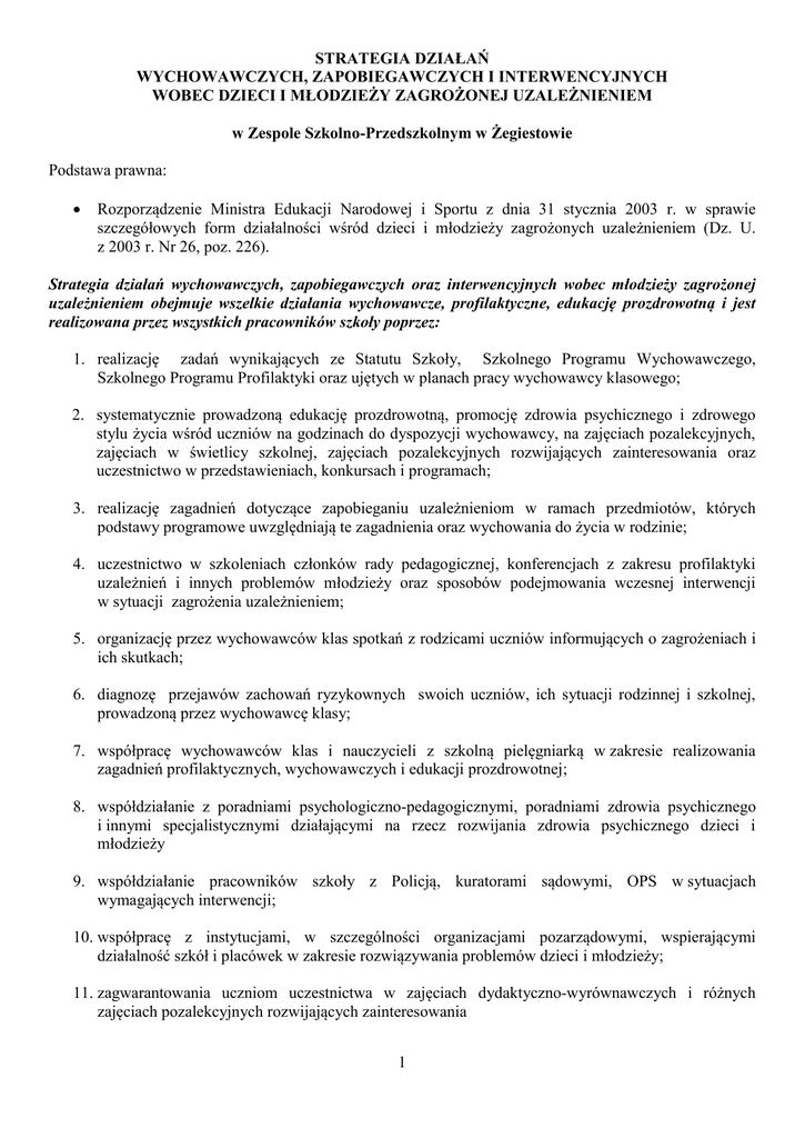 STRATEGIA DZIAŁAŃ WYCHOWAWCZYCH, ZAPOBIEGAWCZYCH I INTERWENCYJNYCH WOBEC DZIECI I MŁODZIEŻY ZAGROŻONEJ UZALEŻNIENIEM w Zespole Szkolno-Przedszkolnym w Żegiestowie Podstawa prawna: Rozporządzenie Ministra Edukacji Narodowej i Sportu z dnia 31 stycznia 2003 r. w sprawie szczegółowych form działalności wśród dzieci i młodzieży zagrożonych uzależnieniem (Dz. U. z 2003 r. Nr 26, poz. 226). Strategia działań wychowawczych, zapobiegawczych oraz interwencyjnych wobec młodzieży zagrożonej uzależnieniem obejmuje wszelkie działania wychowawcze, profilaktyczne, edukację prozdrowotną i jest realizowana przez wszystkich pracowników szkoły poprzez: 1. realizację zadań wynikających ze Statutu Szkoły, Szkolnego Programu Wychowawczego, Szkolnego Programu Profilaktyki oraz ujętych w planach pracy wychowawcy klasowego; 2. systematycznie prowadzoną edukację prozdrowotną, promocję zdrowia psychicznego i zdrowego stylu życia wśród uczniów na godzinach do dyspozycji wychowawcy, na zajęciach pozalekcyjnych, zajęciach w świetlicy szkolnej, zajęciach pozalekcyjnych rozwijających zainteresowania oraz uczestnictwo w przedstawieniach, konkursach i programach; 3. realizację zagadnień dotyczące zapobieganiu uzależnieniom w ramach przedmiotów, których podstawy programowe uwzględniają te zagadnienia oraz wychowania do życia w rodzinie; 4. uczestnictwo w szkoleniach członków rady pedagogicznej, konferencjach z zakresu profilaktyki uzależnień i innych problemów młodzieży oraz sposobów podejmowania wczesnej interwencji w sytuacji zagrożenia uzależnieniem; 5. organizację przez wychowawców klas spotkań z rodzicami uczniów informujących o zagrożeniach i ich skutkach; 6. diagnozę przejawów zachowań ryzykownych swoich uczniów, ich sytuacji rodzinnej i szkolnej, prowadzoną przez wychowawcę klasy; 7. współpracę wychowawców klas i nauczycieli z szkolną pielęgniarką w zakresie realizowania zagadnień profilaktycznych, wychowawczych i edukacji prozdrowotnej; 8. współdziałanie z poradniami psychologiczno-pedagogicznymi, poradniami zdrowia psychicznego i innymi specjalistycznymi działającymi na rzecz rozwijania zdrowia psychicznego dzieci i młodzieży 9. współdziałanie pracowników szkoły z Policją, kuratorami sądowymi, OPS w sytuacjach wymagających interwencji; 10. współpracę z instytucjami, w szczególności organizacjami pozarządowymi, wspierającymi działalność szkół i placówek w zakresie rozwiązywania problemów dzieci i młodzieży; 11. zagwarantowania uczniom uczestnictwa w zajęciach dydaktyczno-wyrównawczych i różnych zajęciach pozalekcyjnych rozwijających zainteresowania 1 12. pomoc psychologiczno – pedagogiczną obejmującą: a) indywidualne konsultacje i porady psychologiczne dla młodzieży zagrożonej uzależnieniem, b) organizowanie i prowadzenie zajęć z profilaktyki uzależnień, zajęć integrujących zespoły klasowe, c) wspieranie wychowawców klas i nauczycieli w działaniach wynikających z programu wychowawczego szkoły i programu profilaktyki oraz zapobiegających występowaniu negatywnych zachowań, d) inicjowanie różnych formy pomocy wychowawczej w środowisku szkolnym i pozaszkolnym ucznia, e) współorganizowanie wypoczynku w czasie ferii i wakacji dla uczniów, f) prowadzenie akcji informacyjnej upowszechniającej wśród dzieci i młodzieży, rodziców i nauczycieli informacji na temat: szkodliwości środków lub substancji, których używanie łączy się z zagrożeniem bezpieczeństwa i zdrowia oraz może prowadzić do uzależnień, dostępnych form pomocy dzieciom i młodzieży zagrożonych uzależnieniem, możliwości rozwiązywania problemów powodujących powstawanie uzależnień, skutków prawnych związanych z naruszeniem przepisów prawa dotyczących uzależnień. 13. działania pielęgniarki szkolnej związane z edukacją prozdrowotną; 14. dokonywanie systematycznej oceny efektów podejmowanych działań wychowawczych i zapobiegawczych. W przypadku wystąpienia podejrzenia lub zaistnienia sytuacji zagrożenia dzieci i młodzieży przyjmuje się następujące procedury postępowania: PROCEDURY POSTĘPOWANIA NAUCZYCIELI I METODY WSPÓŁPRACY SZKÓŁ Z POLICJĄ W SYTUACJACH ZAGROŻENIA DZIECI ORAZ MŁODZIEŻY PRZESTĘPCZOŚCIĄ I DEMORALIZACJĄ, W SZCZEGÓLNOŚCI NARKOMANIĄ, ALKOHOLIZMEM I PROSTYTUCJĄ Działania interwencyjne I. W przypadku, gdy nauczyciel lub inny pracownik szkoły zauważy, że uczeń pali papierosy: 1. Przekazuje informację wychowawcy klasy. 2. Wychowawca wzywa do szkoły rodziców (prawnych opiekunów) i przekazuje im informację o fakcie palenia papierosów przez ucznia. 3. Wychowawca przeprowadza z uczniem i jego rodzicami rozmowę, dotyczącą przyczyn i konsekwencji palenia papierosów. 4. Efektem rozmowy powinno być zawarcie umowy (kontraktu), w której uczeń zobowiązuje się do niepalenia papierosów, rodzice zaś do szczególnej kontroli i zainteresowania się zachowaniami dziecka. 5. W przypadku ponownego palenia papierosów, wobec ucznia przewidziane w statucie szkoły. 2 mogą być zastosowane kary 6. W przypadku powtarzającego się palenia papierosów przez ucznia, dyrektor szkoły w porozumieniu z wychowawcą podejmuje działania terapeutyczne wobec ucznia. II. W przypadku uzyskania informacji, że uczeń używa alkoholu lub innych środków uzależniających w celu wprowadzenia się w stan odurzenia, uprawia nierząd, bądź przejawia inne zachowania świadczące o demoralizacji (naruszanie zasad współżycia społecznego, popełnienie czynu zabronionego, systematyczne uchylanie się od obowiązku szkolnego lub obowiązku nauki, włóczęgostwo, udział w działalności grup przestępczych), nauczyciel powinien podjąć następujące kroki: 1. Przekazać uzyskaną informację wychowawcy klasy. 2. Wychowawca informuje o fakcie dyrektora szkoły. 3. Wychowawca wzywa do szkoły rodziców (prawnych opiekunów) ucznia i przekazuje im uzyskaną 