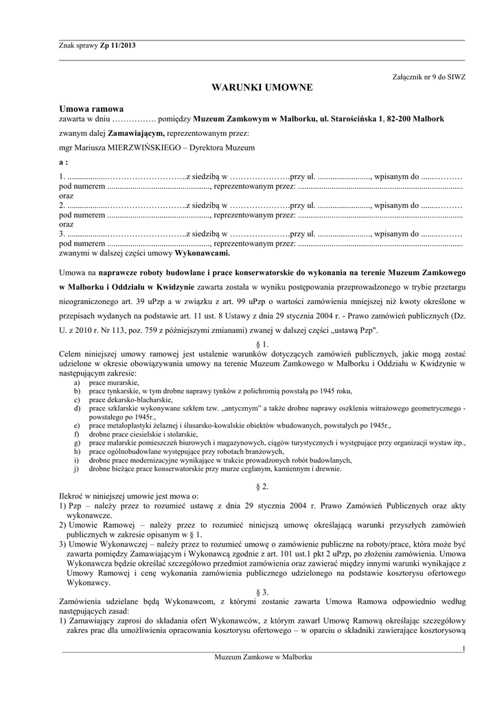 _________________________________________________________________________________ Znak sprawy Zp 11/2013 _________________________________________________________________________________ Załącznik nr 9 do SIWZ WARUNKI UMOWNE Umowa ramowa zawarta w dniu ……………. pomiędzy Muzeum Zamkowym w Malborku, ul. Starościńska 1, 82-200 Malbork zwanym dalej Zamawiającym, reprezentowanym przez: mgr Mariusza MIERZWIŃSKIEGO – Dyrektora Muzeum a: 1. ...................………………………..z siedzibą w ………………….przy ul. ........................., wpisanym do ........……… pod numerem ................................................., reprezentowanym przez: ............................................................................... oraz 2. ...................………………………..z siedzibą w ………………….przy ul. ........................., wpisanym do ........……… pod numerem ................................................., reprezentowanym przez: ............................................................................... oraz 3. ...................………………………..z siedzibą w ………………….przy ul. ........................., wpisanym do ........……… pod numerem ................................................., reprezentowanym przez: ............................................................................... zwanymi w dalszej części umowy Wykonawcami. Umowa na naprawcze roboty budowlane i prace konserwatorskie do wykonania na terenie Muzeum Zamkowego w Malborku i Oddziału w Kwidzynie zawarta została w wyniku postępowania przeprowadzonego w trybie przetargu nieograniczonego art. 39 uPzp a w związku z art. 99 uPzp o wartości zamówienia mniejszej niż kwoty określone w przepisach wydanych na podstawie art. 11 ust. 8 Ustawy z dnia 29 stycznia 2004 r. - Prawo zamówień publicznych (Dz. U. z 2010 r. Nr 113, poz. 759 z późniejszymi zmianami) zwanej w dalszej części „ustawą Pzp". § 1. Celem niniejszej umowy ramowej jest ustalenie warunków dotyczących zamówień publicznych, jakie mogą zostać udzielone w okresie obowiązywania umowy na terenie Muzeum Zamkowego w Malborku i Oddziału w Kwidzynie w następującym zakresie: a) b) c) d) e) f) g) h) i) j) prace murarskie, prace tynkarskie, w tym drobne naprawy tynków z polichromią powstałą po 1945 roku, prace dekarsko-blacharskie, prace szklarskie wykonywane szkłem tzw. „antycznym” a także drobne naprawy oszklenia witrażowego geometrycznego powstałego po 1945r., prace metaloplastyki żelaznej i ślusarsko-kowalskie obiektów wbudowanych, powstałych po 1945r., drobne prace ciesielskie i stolarskie, prace malarskie pomieszczeń biurowych i magazynowych, ciągów turystycznych i występujące przy organizacji wystaw itp., prace ogólnobudowlane występujące przy robotach branżowych, drobne prace modernizacyjne wynikające w trakcie prowadzonych robót budowlanych, drobne bieżące prace konserwatorskie przy murze ceglanym, kamiennym i drewnie. § 2. Ilekroć w niniejszej umowie jest mowa o: 1) Pzp – należy przez to rozumieć ustawę z dnia 29 stycznia 2004 r. Prawo Zamówień Publicznych oraz akty wykonawcze. 2) Umowie Ramowej – należy przez to rozumieć niniejszą umowę określającą warunki przyszłych zamówień publicznych w zakresie opisanym w § 1. 3) Umowie Wykonawczej – należy przez to rozumieć umowę o zamówienie publiczne na roboty/prace, która może być zawarta pomiędzy Zamawiającym i Wykonawcą zgodnie z art. 101 ust.1 pkt 2 uPzp, po złożeniu zamówienia. Umowa Wykonawcza będzie określać szczegółowo przedmiot zamówienia oraz zawierać między innymi warunki wynikające z Umowy Ramowej i cenę wykonania zamówienia publicznego udzielonego na podstawie kosztorysu ofertowego Wykonawcy. § 3. Zamówienia udzielane będą Wykonawcom, z którymi zostanie zawarta Umowa Ramowa odpowiednio według następujących zasad: 1) Zamawiający zaprosi do składania ofert Wykonawców, z którym zawarł Umowę Ramową określając szczegółowy zakres prac dla umożliwienia opracowania kosztorysu ofertowego – w oparciu o składniki zawierające kosztorysową ___________________________________________________________________________________________________________1 Muzeum Zamkowe w Malborku _________________________________________________________________________________ Znak sprawy Zp 11/2013 _________________________________________________________________________________ stawkę robocizny oraz odniesiony do niej narzut kosztów pośrednich i zysku w wysokości nie wyższej niż podane w ofercie złożonej w postępowaniu prowadzonym w celu zawarcia umowy ramowej 2) Oferta składana w wyniku zaproszenia nie może być mniej korzystna od oferty złożonej w postępowaniu prowadzonym w celu zawarcia Umowy Ramowej. 3) Umowa Wykonawcza zostanie zawarta z Wykonawcą, którego oferta zostanie uznana za najkorzystniejszą z zastrzeżeniem pkt 2). § 4. Umowa Ramowa jest zawarta na okres 24 miesięcy od dnia podpisania umowy z zastrzeżeniem, że terminy ustalane w Umowie Wykonawczej nie będą dłuższe niż okres obowiązywania Umowy Ramowej. 1. 2. 1. 2. 1. 2. 3. § 5. Zamawiający zastrzega, iż wartość wszystkich robót wykonywanych w ramach niniejszej umowy nie może przekroczyć łącznie kwoty ………………… PLN brutto. Wykorzystanie kwoty, o której mowa w ust. 1 powoduje wygaśnięcie niniejszej umowy bez konieczności składania odrębnych oświadczeń woli w tym zakresie. § 6. ZMIANY UMOWY Zmiany Umowy Ramowej wymagają zachowania formy pisemnej pod rygorem nieważności. Wszelkie powiadomienia i oświadczenia kierowane do Zamawiającego lub Wykonawcy pod rygorem nieważności muszą mieć formę pisemną. Strony zgodnie ustalają, że doręczenia będą następowały pod adresy wskazane na wstępie umowy, faxem na numer 55/647 08 03 oraz mailem na adres [email protected]. Każda ze stron zobowią