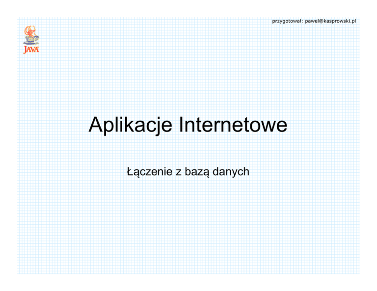 przygotował: [email protected] Aplikacje Internetowe Łączenie z bazą danych przygotował: [email protected] Podstawy • Klient • Serwer • Sterownik – Własne API (Application Programmer Interface) przygotował: [email protected] Łączenie z bazą danych • • • • • • Sterownik Protokół komunikacyjny Adres serwera Port nasłuchowy Przesłanie zapytania SQL Odebranie rezultatów przygotował: [email protected] Język Java - JDBC JDBC API pozwala na: • Ustalenie połączenia z bazą • Wysyłanie poleceń SQL • Przetwarzanie rezultatów przygotował: [email protected] Sterowniki JDBC 1) 2) 3) 4) JDBC-ODBC Bridge Native-API partly-Java driver Net-protocol all-Java driver Native-protocol all-Java driver przygotował: [email protected] Główne klasy i interfejsy JDBC • • • • • • • • • • Driver DriverManager Connection Statement, PreparedStatement, CallableStatement ResultSet DatabaseMetaData ResultSetMetaData Types SQLException SQLWarning przygotował: [email protected] Sposób działania JDBC Załaduj sterownik Class.forName( DriverClassName); Połącz się ze źródłem danych Connection con = DriverManager.getConnection( URL, Username, Password ); Stwórz polecenie Statement stmt = con.createStatement(); Zapytaj bazę danych ResultSet result = stmt.executeQuery("SELECT * FROM table1"); przygotował: [email protected] Ładowanie sterownika Statyczne: import drivername; Dynamiczne: Class.forName(”drivername”); Na przykład: com.mysql.jdbc.Driver lub com.microsoft.sqlserver.jdbc.SQLServerDriver przygotował: [email protected] Połączenie ze źródłem danych Connection con = DriverManager.getConnection ( URL, Username, Password ); URL = jdbc:<subprotocol>:<subname> <subname> = //host:port/dbname;params Na przykład: jdbc:mysql://127.0.0.1/baza lub jdbc:microsoft:sqlserver://db.xyz.pl:1433 przygotował: [email protected] Pierwszy przykład JDBC import java.sql.*; class DBExample1{ public static void main(String[] args){ try{ Class.forName("com.mysql.jdbc.Driver"); Connection con = DriverManager.getConnection("jdbc:mysql://127.0.0.1/baza", "lab","lab"); Statement stmt = con.createStatement(); ResultSet rs = stmt.executeQuery("select * from pracownicy"); while(rs.next()) System.out.println(rs.getString(1)+"|"+rs.getString(4)); con.close(); } catch(SQLException ec) {ec.printStackTrace()); } catch(ClassNotFoundException ex) {ex.printStackTrace();} } } DBExample1.java przygotował: [email protected] Ładowanie sterownika • • • • Zwykle sterownik typu 4 Ściągnięcie pliku jar ze sterownikiem Umieszczenie go na ścieżce Zmiana nazwy sterownika i url'a w programie przygotował: [email protected] Przykłady sterowników • SQL Server (http://msdn.microsoft.com/data/ref/jdbc) java -classpath ".;sqljdbc4.jar" %1 • MySQL (http://www.mysql.com/products/connector/j/) java -classpath ".;mysql-connector-java.jar" %1 • PostgreSQL (http://jdbc.postgresql.org) java -classpath ".;postgres-8.2dev-503.jdbc2ee.jar" %1 run.bat przygotował: [email protected] Zmiana sterownika import java.sql.*; class DBExample1{ public static void main(String[] args){ try{ Class.forName("com.mysql.jdbc.Driver"); Connection con = DriverManager.getConnection("jdbc:mysql://127.0.0.1/baza","lab", "lab"); Statement stmt = con.createStatement(); ResultSet rs = stmt.executeQuery("select * from pracownicy"); while(rs.next()) System.out.print(rs.getString(1)+"|"+rs.getString(4)+"\n"); con.close(); } catch(SQLException ec) { System.err.println(ec.getMessage()); } catch(ClassNotFoundException ex) {System.err.println("Cannot find driver.");} } } DBExample1.java przygotował: [email protected] Zmiana sterownika import java.sql.*; class DBExample1{ public static void main(String[] args){ try{ Class.forName("com.microsoft.sqlserver.jdbc.SQLServerDriver"); Connection con = DriverManager.getConnection("jdbc:sqlserver://localhost", "lab", "lab"); Statement stmt = con.createStatement(); ResultSet rs = stmt.executeQuery("select * from pracownicy"); while(rs.next()) System.out.print(rs.getString(1)+"|"+rs.getString(4)+"\n"); con.close(); } catch(SQLException ec) { System.err.println(ec.getMessage()); } catch(ClassNotFoundException ex) {System.err.println("Cannot find driver.");} } } DBExample1.java przygotował: [email protected] ResultSet ResultSet rs=stmt.executeQuery("select * from table"); • • • • • dostęp do jednego wiersza danych jednocześnie next() – przejście do następnego wiersza getXXX(i) – wartość i-tej kolumny Najczęściej: getInt(), getString(), getDate(), getDouble()... Informacje o strukturze danych (nazwy i typy kolumn) MetaData przygotował: [email protected] Tworzenie polecenia (Statement) Statement stmt = con.createStatement(); • executeQuery() uruchamia polecenia SQL zwracające listę wierszy jako ResultSet. • executeUpdate() uruchamia polecenia SQL modyfikujące dane lub strukturę bazy • execute() uruchamia polecenie SQL dowolnego typu przygotował: [email protected] executeUpdate int rows=stmt.executeUpdate( "update table set field=3 where id=5"); • Dla poleceń DML i DDL • Zwraca ilość przetworzonych wierszy • Zwraca zero dla poleceń DDL (CREATE TABLE itp.) przygotował: [email protected] PreparedStatement PreparedStatement pstmt = con.prepareStatement( "select * from table1 where id=? and field like ?") • • • • • Pre-kompilacja zapytań po stronie serwera Przyspiesza działanie podobnych zapytań Czytelniejszy kod Pozwala na użycie parametrów( marker ‘?’) setXXX() – ustawienie wartości parametru przygotował: [email protected] PreparedStatement // definicja polecenia PreparedStatement pstmt = con.prepareStatement( "select * from table1 where id<? and field like ?"); // ustawienie parametrów pstmt.setInt(1,20); pstmt.setString(2,"value"); // uruchomienie Rs = pstmt.executeQuery(); przygotował: [email protected] SQLException import java.sql.*; class DBExample1{ public static void main(String[] args){ try{ 