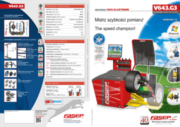 DANE TECHNICZNE / TECHNICAL FEATURES • Zasilanie / Power supply 220V 50-60Hz 1Ph • Moc silnika / Motor rating 50 W • Pobór prądu / Power Source • Prędkość obrotowa / Balancing speed 98 RPM • Średnica obręczy / Rim diameter • Średnica koła / Wheel diameter 34” (850 mm) • Szerokość obręczy / Wheel Width max 16” (415 mm) • Waga koła / Wheel Weight max 90 Kg (198 Lbs) • Dokładność / Accuracy 1 gr. • Monitor / Video LCD WYPOSAŻENIE DODATKOWE / OPTIONAL EQUIPMENT GŁÓWNE FUNKCJE / MAIN FUNCTIONS • Ustawienia użytkownika / User Setup • Programy ALU / Alu programs •AMSF-18 Albero moto 18 mm. 18 mm. Shaft for motocycle •FUL-HD Uchwyt uniwersalny samocentrujący Universal Selfcentering flange • Automatyczny Start-Stop / Automatic start-stop • Optymalizacja / Tyre matching • Autokalibracja - Autodiagnostyka / Self calibration - Self diagnostic • ALU-SE Program do ciężarków klejonych Guided application for stick-on weights • AFC Automatyczna kalibracja flanszy / Automatic Flange Calibration • MARS Minimalizacja niewyważenia resztkowego Automatic Minimization of residual Static Unbalance • ASF Specjalne funkcje ALU / ALU Special Functions • APS Automatyczne pozycjonowanie koła / Automatic Positioning System • Scanner 3D •SBC Zestaw tulei centrujących Set centering bushings WYMIARY / MEASURES 1230 mm • Wymiary / Dimensions mm 2100 x 1230 x 1780h Autoryzowany dealer / Authorized dealer 1040 mm • Opakowanie / Packing mm 1400 x 1150 x 1450h •FC Uchwyt centrujący 4/5 otworów Centering Flange 4/5 holes Reading of imbalances and total time of spin and wheel positioning in record time of 5.5 seconds. • Program MOTO / Moto program • SPLIT Funkcja rozdzielania ciężarków / Split weight function •KF Zestaw Off-road & Light Truck Kit Off-road & Light Trucks Odczyt prędkości oraz całkowity czas pomiaru wraz z ustawieniem pozycji koła poniżej 5,5 sekundy • Waga / Weight lordo/gross: 280 kg - netto/net: 240 kg Aby uzyskać więcej informacji o tym lub innych produktach odwiedź stronę: For further information about this and other products, please visit www.fasep.pl Anwa-Tech sp. z o.o. 3-go Maja 89, 05-071 Sulejówek, Polska Tel. +48 22 783 41 62, Fax +48 22 783 91 26 e-mail: [email protected] - www.fasep.pl Cod. V111 - Edizione n. 4 - Novembre 2011 •AMSF-10 Albero moto 10 mm. 10 mm. Shaft for motocycle The speed champion! 4 - 15 s. odels and options subject to change without notice. • Czas pomiaru / Working time •AMSF-HD - Pro Bike Adaptem motocyklowy 14 mm. Motorcycle Adaptor kit 14 mm. Mistrz szybkości pomiaru! 8” (200 mm) - 26” (650 mm) La Ditta si riserva di apportare modifiche alla propria produzione senza preavviso ed in qualsiasi momento. - Specifications, m WYPOSAŻENIE STANDARDOWE STANDARD EQUIPMENT WYWAŻARKI / WHEEL BALANCERS 400 W Ktoś komu można zaufać! SOMEONE YOU CAN TRUST. Odkryj ją w pełni... Innowacyjny program wyważania Innovative balancing program Discover it completely... I Doskonały system pomiaru Nearly ideal mechanical ties PL Kolorowy monitor LCD SVGA: Przyjazny dla użytkownika interfejs graficzny. PL PL LCD SVGA monitor: Automatyczny pomiar szerokości koła EMS GB User-friendly interface with buttons and icons. PL 3-sensorowy system VQI W 3-sensorowym systemie VQI, siły wywołane niewyważeniem przebiegają całkowicie przez sensory, dzięki czemu pomiar cały czas jest idealny. 8 przyciskowa klawiatura z opisanymi ikonami. VQI 3 sensors system 8 buttons key pad GB VQI 3-sensors System In 3-sensors VQI System, the centrifugal force caused by the unbalance goes completely through the sensors as there is no other mechanical tie, so measurements will be always perfect. Przegrody na ciężarki (13), stożki (4+6) i narzędzia (1). Compartments for weights (13), Jednostka sterująca PC z portem USB. GB PC Control Unit with USB port PL Cechy charakterystyczne / Distinguishing marks PODNOŚNIK KOŁA ZOBACZ JAK DZIAŁA! WATCH IT MOVING! PL GB cones (4+6) and tools (1). PL • Automatic selection of balancing mode. GB • WOW Weight saving system. GB Automatic width gauge GB with icons PL PL Osłona koła z automatyczną funkcją START-STOP po opuszczeniu lub otwarciu. GB Safety cover with automatic start-stop when closed and lower wheel guard. GB Integrated pneumatic lift. PL Automatyczny system pomiaru odległości i średnicy koła oraz montażu ciężarka. GB Automatic input/gauge to measure and apply stick-on weights PL System IFS (zintegrowany wał) zapewniający maksymalną dokładność centrowania koła. GB eccentricities with 1 mm ZOBACZ JAK DZIAŁA! WATCH IT MOVING! GB Flange holders (6) PL Specjalnie zaprojektowana obudowa ułatwiająca dostęp do przyklejenia ciężarka. GB Easy-alu basement improves access to inside of the rim to ease application of the adhesive weights Wał główny zintegrowany jest z flanszą (1), dzięki czemu niedokładności pasowania są wyeliminowane a dokładność centrowania najwyższa. Sprężyna (2) dociskająca stożek (3) zabezpieczona jest przed brudem za pomocą pokrywy. GB PL Zintegrowany pneumatyczny podnośnik koła. 3D.SCANNER Uchwyty na stożki (6) PL • Automatyczny wybór trybu wyważania. • System redukcji wagi ciężarka. IFS system (integrated-flange shaft) for maximum centering accuracy. The bell flange is integrated of the shaft (1), tolerances of coupling shaft and flange are simply radically eliminated, improving dramatically the centering accuracy. The spring (2) for centering is lodging with inner cone (3) and it is protected from the dirt. Hamulec nożny + Pneu Lock GB Pneu-lock pedal and foot lock pedal Nowa technologia G3 EXTREME wprowadza GB important new features: • Elektroniczne sterowanie silnikiem (inwerter). • Wykorzystuje cichy i wydajny 3 Ph silnik. • Bardzo szybki start, hamowanie oraz automatyczne pozycjonowanie koła. • Szybkie i dokładne elektroniczne pozycjonowanie APS2 może być sterow