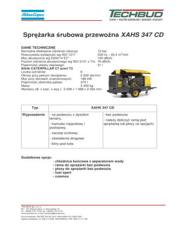Spr arka rubowa przewo na XAHS 347 CD DANE TECHNICZNE Normalne efektywne ci nienie robocze: 12 bar Rzeczywista wydajno wg ISO 1217 339 l/s – 20,4 m3/min Moc akustyczna wg 2000/14 EC” 100 dB(A) Poziom ci nienia akustycznego wg ISO 2151 z 7m: 76 dB(A) Pojemno układu olejowego: 31 l Silnik CATERPILLAR C7 acert T3 Liczba cylindrów: 6 Obroty przy pełnym obci eniu: 2 000 obr/min Moc przy obrotach znamionowych: 186 kW Pojemno zbiornika paliwa: 375 l Masa: 3 400 kg Wymiary (dł. x szer. x wys.): 5 508 x 1 988 x 2 094 mm Typ Wyposa enie XAHS 347 CD - na podwoziu z dyszlem łamany, - hamulec najazdowy i postojowy, - bez podwozia - nale y doliczy ram pod spr ark lub płozy (w opcjach) - zaczep oczkowy - o wietlenie drogowe - kliny pod koła Dodatkowe opcje: - chłodnica ko cowa z separatorem wody - rama do spr arki bez podwozia - płozy do spr arki bez podwozia - fuel xpert - cosmos TECHBUD Sp. z o. o. 65 – 127 Zielona Góra, ul. Gorzowska 12 tel. +48/68/ 470 72 50, fax +48/68/ 470 72 51, www.techbud.eu, e-mail: [email protected] Konto bankowe: DB PBC SA 80 1910 1048 2408 0151 9024 0001 Kapitał zakładowy: 51.000 zł • KRS: 0000189024 • NIP: 929-171-71-89