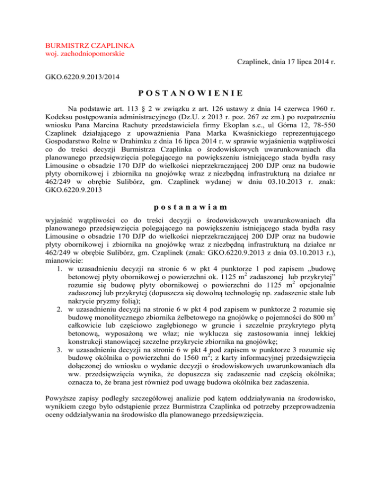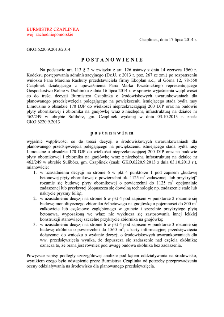 BURMISTRZ CZAPLINKA woj. zachodniopomorskie Czaplinek, dnia 17 lipca 2014 r. GKO.6220.9.2013/2014 POSTANOWIENIE Na podstawie art. 113 § 2 w związku z art. 126 ustawy z dnia 14 czerwca 1960 r. Kodeksu postępowania administracyjnego (Dz.U. z 2013 r. poz. 267 ze zm.) po rozpatrzeniu wniosku Pana Marcina Rachuty przedstawiciela firmy Ekoplan s.c., ul Górna 12, 78-550 Czaplinek działającego z upoważnienia Pana Marka Kwaśnickiego reprezentującego Gospodarstwo Rolne w Drahimku z dnia 16 lipca 2014 r. w sprawie wyjaśnienia wątpliwości co do treści decyzji Burmistrza Czaplinka o środowiskowych uwarunkowaniach dla planowanego przedsięwzięcia polegającego na powiększeniu istniejącego stada bydła rasy Limousine o obsadzie 170 DJP do wielkości nieprzekraczającej 200 DJP oraz na budowie płyty obornikowej i zbiornika na gnojówkę wraz z niezbędną infrastrukturą na działce nr 462/249 w obrębie Sulibórz, gm. Czaplinek wydanej w dniu 03.10.2013 r. znak: GKO.6220.9.2013 postanawiam wyjaśnić wątpliwości co do treści decyzji o środowiskowych uwarunkowaniach dla planowanego przedsięwzięcia polegającego na powiększeniu istniejącego stada bydła rasy Limousine o obsadzie 170 DJP do wielkości nieprzekraczającej 200 DJP oraz na budowie płyty obornikowej i zbiornika na gnojówkę wraz z niezbędną infrastrukturą na działce nr 462/249 w obrębie Sulibórz, gm. Czaplinek (znak: GKO.6220.9.2013 z dnia 03.10.2013 r.), mianowicie: 1. w uzasadnieniu decyzji na stronie 6 w pkt 4 punktorze 1 pod zapisem „budowę betonowej płyty obornikowej o powierzchni ok. 1125 m2 zadaszonej lub przykrytej” rozumie się budowę płyty obornikowej o powierzchni do 1125 m2 opcjonalnie zadaszonej lub przykrytej (dopuszcza się dowolną technologię np. zadaszenie stałe lub nakrycie pryzmy folią); 2. w uzasadnieniu decyzji na stronie 6 w pkt 4 pod zapisem w punktorze 2 rozumie się budowę monolitycznego zbiornika żelbetowego na gnojówkę o pojemności do 800 m3 całkowicie lub częściowo zagłębionego w gruncie i szczelnie przykrytego płytą betonową, wyposażoną we właz; nie wyklucza się zastosowania innej lekkiej konstrukcji stanowiącej szczelne przykrycie zbiornika na gnojówkę; 3. w uzasadnieniu decyzji na stronie 6 w pkt 4 pod zapisem w punktorze 3 rozumie się budowę okólnika o powierzchni do 1560 m2; z karty informacyjnej przedsięwzięcia dołączonej do wniosku o wydanie decyzji o środowiskowych uwarunkowaniach dla ww. przedsięwzięcia wynika, że dopuszcza się zadaszenie nad częścią okólnika; oznacza to, że brana jest również pod uwagę budowa okólnika bez zadaszenia. Powyższe zapisy podległy szczegółowej analizie pod kątem oddziaływania na środowisko, wynikiem czego było odstąpienie przez Burmistrza Czaplinka od potrzeby przeprowadzenia oceny oddziaływania na środowisko dla planowanego przedsięwzięcia. UZASADNIENIE W dniu 16 lipca 2014 r. Pan Marcin Rachuta przedstawiciel firmy Ekoplan s.c., ul Górna 12, 78-550 Czaplinek działający z upoważnienia Pana Marka Kwaśnickiego reprezentującego Gospodarstwo Rolne w Drahimku wystąpił z wnioskiem do Burmistrza Czaplinka o wyjaśnienie zapisów wydanej w dniu 03.10.2013 r. decyzji o środowiskowych uwarunkowaniach dla planowanego przedsięwzięcia polegającego na powiększeniu istniejącego stada bydła rasy Limousine o obsadzie 170 DJP do wielkości nieprzekraczającej 200 DJP oraz na budowie płyty obornikowej i zbiornika na gnojówkę wraz z niezbędną infrastrukturą na działce nr 462/249 w obrębie Sulibórz, gm. Czaplinek, w związku z niemożnością uzyskania pozwolenia na budowę obiektów inwentarskich dla Gospodarstwa Rolnego w Drahimku, z powodu niezgodności złożonego projektu budowlanego z zapisami ww. decyzji w zakresie: zadaszenia lub przykrycia oraz wielkości powierzchni płyty obornikowej, zadaszenia okólnika oraz przykrycia zbiornika na gnojówkę. Postanowienie uwzględnia w całości wniosek strony, a zatem nie wymaga uzasadnienia faktycznego i prawnego. Pouczenie Od niniejszego postanowienia służy stronom wniesienie zażalenia do Samorządowego Kolegium Odwoławczego w Koszalinie za pośrednictwem Burmistrza Czaplinka wydającego postanowienie w terminie 7 dni od daty jego dostarczenia. BURMISTRZ CZAPLINKA Adam Kośmider Otrzymują: 1. 2. 3. 4. Pan Marcin Rachuta, Ekoplan s.c., ul. Górna 12, 78-550 Czaplinek. Gospodarstwo Rolne Marek Kwaśnicki, Drahimek, 78-550 Czaplinek. Pozostałe strony postępowania zgodnie z art. 49 Kpa, w związku z art. 74 ust 3 ustawy ooś. A/a.