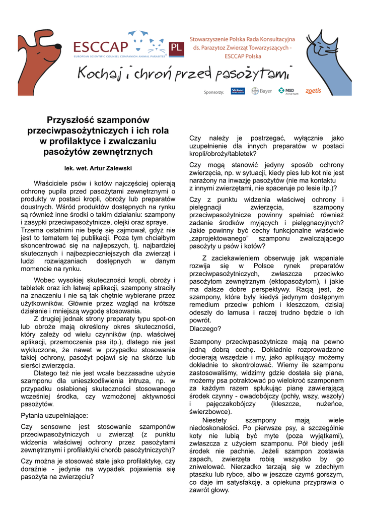 Przyszłość szamponów przeciwpasożytniczych i ich rola w profilaktyce i zwalczaniu pasożytów zewnętrznych lek. wet. Artur Zalewski Właściciele psów i kotów najczęściej opierają ochronę pupila przed pasożytami zewnętrznymi o produkty w postaci kropli, obroży lub preparatów doustnych. Wśród produktów dostępnych na rynku są również inne środki o takim działaniu: szampony i zasypki przeciwpasożytnicze, olejki oraz spraye. Trzema ostatnimi nie będę się zajmował, gdyż nie jest to tematem tej publikacji. Poza tym chciałbym skoncentrować się na najlepszych, tj. najbardziej skutecznych i najbezpieczniejszych dla zwierząt i ludzi rozwiązaniach dostępnych w danym momencie na rynku. Wobec wysokiej skuteczności kropli, obroży i tabletek oraz ich łatwej aplikacji, szampony straciły na znaczeniu i nie są tak chętnie wybierane przez użytkowników. Głównie przez wzgląd na krótsze działanie i mniejszą wygodę stosowania. Z drugiej jednak strony preparaty typu spot-on lub obroże mają określony okres skuteczności, który zależy od wielu czynników (np. właściwej aplikacji, przemoczenia psa itp.), dlatego nie jest wykluczone, że nawet w przypadku stosowania takiej ochrony, pasożyt pojawi się na skórze lub sierści zwierzęcia. Dlatego też nie jest wcale bezzasadne użycie szamponu dla unieszkodliwienia intruza, np. w przypadku osłabionej skuteczności stosowanego wcześniej środka, czy wzmożonej aktywności pasożytów. Pytania uzupełniające: Czy sensowne jest stosowanie szamponów przeciwpasożytniczych u zwierząt (z punktu widzenia właściwej ochrony przez pasożytami zewnętrznymi i profilaktyki chorób pasożytniczych)? Czy można je stosować stale jako profilaktykę, czy doraźnie - jedynie na wypadek pojawienia się pasożyta na zwierzęciu? Czy należy je postrzegać, wyłącznie jako uzupełnienie dla innych preparatów w postaci kropli/obroży/tabletek? Czy mogą stanowić jedyny sposób ochrony zwierzęcia, np. w sytuacji, kiedy pies lub kot nie jest narażony na inwazję pasożytów (nie ma kontaktu z innymi zwierzętami, nie spaceruje po lesie itp.)? Czy z punktu widzenia właściwej ochrony i pielęgnacji zwierzęcia, szampony przeciwpasożytnicze powinny spełniać również zadanie środków myjących i pielęgnacyjnych? Jakie powinny być cechy funkcjonalne właściwie „zaprojektowanego” szamponu zwalczającego pasożyty u psów i kotów? Z zaciekawieniem obserwuję jak wspaniale rozwija się w Polsce rynek preparatów przeciwpasożytniczych, zwłaszcza przeciwko pasożytom zewnętrznym (ektopasożytom), i jakie ma dalsze dobre perspektywy. Racją jest, że szampony, które były kiedyś jedynym dostępnym remedium przeciw pchłom i kleszczom, dzisiaj odeszły do lamusa i raczej trudno będzie o ich powrót. Dlaczego? Szampony przeciwpasożytnicze mają na pewno jedną dobrą cechę. Dokładnie rozprowadzone docierają wszędzie i my, jako aplikujący możemy dokładnie to skontrolować. Wiemy ile szamponu zastosowaliśmy, widzimy gdzie dostała się piana, możemy psa potraktować po wielokroć szamponem za każdym razem spłukując pianę zawierającą środek czynny - owadobójczy (pchły, wszy, wszoły) i pajęczakobójczy (kleszcze, nużeńce, świerzbowce). Niestety szampony mają wiele niedoskonałości. Po pierwsze psy, a szczególnie koty nie lubią być myte (poza wyjątkami), zwłaszcza z użyciem szamponu. Pół biedy jeśli środek nie pachnie. Jeżeli szampon zostawia zapach, zwierzęta robią wszystko by go zniwelować. Nierzadko tarzają się w zdechłym ptaszku lub rybce, albo w jeszcze czymś gorszym, co daje im satysfakcję, a opiekuna przyprawia o zawrót głowy. Szampony poprzez zawartość substancji myjących, zmniejszających napięcie powierzchniowe usuwają warstwę lipidową naskórka, w której rozpuszczają się nowoczesne leki przeciwpasożytnicze aplikowane w postaci kropli (preparaty spot-on). Brak warstwy lipidowej pełniącej naturalną rolę obronną skóry psa i kota z jednej strony skraca okres pozostawania substancji czynnej preparatu spot-on na powierzchni skóry (w przypadku zastosowania go przed kąpielą), z drugiej ogranicza możliwość skutecznego rozprzestrzeniania się substancji czynnej po skórze zwierzęcia w przypadku aplikacji preparatu w kropli niedługo po kąpieli z użyciem szamponu. Podsumowując, użycie szamponu przeciwpasożytniczego jako jedynego sposobu zabezpieczenia zwierzęcia to stosowanie metody, która daje efekt doraźny, z wykluczeniem działania długotrwałego, czyli zabezpieczającego. Innymi słowy szampon przeciwpasożytniczy działa tylko w chwili jego stosowania, natomiast nie gwarantuje ochrony na kolejne dni. Preparaty spot-on, czyli w kropli są tak skonstruowane, by przede wszystkim działać długotrwale, a zatem chronić zwierzę przed infestacją, tj. opadnięciem przez pasożyty. Zdecydowanie nie nadają się do działania natychmiastowego i doraźnego. Ich efekt działania rozwija się powoli. Potrzeba od 24 do 48 godzin by osiągnęły szczyt działania, a i to jest pochodną grubości i ciągłości warstwy lipidowej naskórka, o czym pisałem wcześniej. Można powiedzieć, że działanie szamponów, preparatów spot-on i obroży p-pasożytniczych wzajemnie się uzupełnia. Trzeba bowiem psa czasem wykąpać. Co do tego nie ma złudzeń. Pozostaje jednak pytanie, czy musi to być szampon z komponentą przeciwpasożytniczą? Szampony takie są trudno dostępne - trudniej taki środek zarejestrować (jest lekiem), trudniej rozprowadzać - sprzedawać (wymogi jak dla leków). To powoduje, że ich cena jest często wysoka. Jeśli zwierzę ma pasożyty zewnętrzne, na pewno jest to wskazaniem do zastosowania szamponu i dlatego należy mieć w domowym zestawie taki środek. Bezwzględnie jednak, po odbudowaniu warstwy lipidowej naskórka, co występuje po 24-48 godzinach należy zastosować środek zabezpieczający przed reinwazją - w