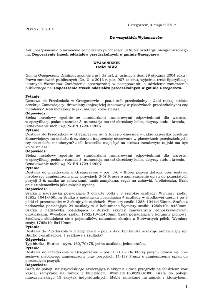 Grzegorzew, 4 maja 2015 r. RDS 271.5.2015 Do wszystkich Wykonawców Dot.: postępowania o udzielenie zamówienia publicznego w trybie przetargu nieograniczonego na: Doposażenie trzech oddziałów przedszkolnych w gminie Grzegorzew WYJAŚNIENIE treści SIWZ Gmina Grzegorzew, działając zgodnie z art. 38 ust. 2, ustawy z dnia 29 stycznia 2004 roku Prawo zamówień publicznych (Dz. U. z 2013 r. poz. 907 ze zm.), wyjaśnia treść Specyfikacji Istotnych Warunków Zamówienia sporządzonej w postępowaniu o udzielenie zamówienia publicznego na: Doposażenie trzech oddziałów przedszkolnych w gminie Grzegorzew. Pytanie: Dostawa do Przedszkola w Grzegorzewie – poz.1 stół przedszkolny – Jaki rodzaj stelaża oczekuje Zamawiający: drewniany (najczęściej stosowany w placówkach przedszkolnych) czy metalowy? Jeśli metalowy to jaki ma być kolor stelaża Odpowiedz: Stelaż metalowy zgodnie ze standardami numerowymi odpowiednimi dla wzrostu, w specyfikacji podano rozmiar 3, numeracja ma też określony kolor, dotyczy stołu i krzesła, Oznakowanie mebli wg PN-EN 1729-1:2007 Pytanie: Dostawa do Przedszkola w Grzegorzewie oz. 2 krzesło dziecięce – Jakie krzesełka oczekuje Zamawiający: na stelażu drewnianym (najczęściej stosowane w placówkach przedszkolnych) czy na stelażu metalowym? Jeśli krzesełka mają być na stelażu metalowym to jaki ma być kolor stelaża? Odpowiedz: Stelaż metalowy zgodnie ze standardami numerowymi odpowiednimi dla wzrostu, w specyfikacji podano rozmiar 3, numeracja ma też określony kolor, dotyczy stołu i krzesła, Oznakowanie mebli wg PN-EN 1729-1:2007 Pytanie: Dostawa do przedszkola w Grzegorzewie – poz. 3-6 – Której pozycji dotyczy opis zestawu meblowego zamieszczona przy pozycjach 3-6? Proszę o zamieszczenie opisu do pozostałych pozycji 3-6: szafka ze schowkami, szafa zamykana, regał na zabawki, biblioteczka. Brak opisu uniemożliwia jakąkolwiek wycenę. Odpowiedz: Szafka z nadstawką posiadająca 3 otwarte półki i 3 szerokie szuflady. Wymiary szafki: 1285x 1041x450mm Szafka z nadstawką posiadająca 4 szuflady w środkowej części i po 3 półki (4 przestrzenie) w 2 skrajnych częściach. Wymiary szafki 1285x1041x450mm. Szafka z nadstawką posiadająca 24 szuflady w 2 kolumnach Wymiary szafki: 1285x1041x450mm. Szafka z nadstawką posiadająca 6 dużych skrytek zamykanych jednoskrzydłowymi drzwiczkami. Wysokość szafki: 1752x1041x450mm Szafa posiadająca 3 kolumny pionowe. Środkowa składająca się z pojemników, natomiast skrajne z 5 otwartych półek. Wymiary szafy: 1768x1045x470mm. Pytanie: Dostawa do Przedszkola w Grzegorzewie – poz. 7 Jaki typ biurka oczekuje zamawiający np. Biurko 3-szufladowe, 1 szafkowe z szufladą? Odpowiedz: Typ biurka: Biurko – wym. 160/70/75, jedna szuflada, jedna szafka, Pytanie: Dostawa do Przedszkola w Grzegorzewie – poz. 11-13 – Do której pozycji odnosi się opis zestawu meblowego zamieszczony przy pozycjach 11-13? Proszę o zamieszczenie opisu do pozostałych pozycji. Odpowiedz: Szafa do pokoju nauczycielskiego zawierająca 6 skrytek + dwie przegrody na 20 dzienników każda, zamykane na zamek z kluczykiem. Wymiary 1830x900x380. Szafa do pokoju nauczycielskiego 15 skrytek indywidualnych. Meble zamykane na zamek z kluczykiem. 1 Wymiary 1830x900x380. Szafa do pokoju nauczycielskiego 10 indywidualnie zamykanych na zamek skrytek. Wymiary 1830x900x380. Pytanie: Dostawa do Przedszkola w Grzegorzewie – poz. 14 – rolety okienne – Który wymiar jest szerokością, a który wysokością? Proszę o sprecyzowanie sposobu montażu rolet. Czy rolety mają być montowane na oknie czy na ścianie na wnęce okiennej? Odpowiedz: Rolety okienne 2m wysokość, 1,5 szerokość, Pytanie: Dostawa do Przedszkola w Grzegorzewie - poz. 15 – zabudowy grzejników – Który wymiar jest szerokością a który wysokością? Jaka jest głębokość zabudowy, typ grzejnika, zasilanie (z prawej czy lewej strony, górne czy dolne)? Odpowiedz: Zabudowa kaloryfera, 1,5 długość, 1,2 wysokość, Pytanie: Dostawa do Przedszkola w Barłogach – poz. 20 – rolety okienne – Który wymiar jest szerokością, a który wysokością? Proszę o sprecyzowanie sposobu montażu rolet. Czy rolety mają być montowane na oknie, na kwaterze czy na ścianie na wnęce okiennej? Odpowiedz: Rolety okienne –wymiar otworuszer-247 cm , wys. 160 cm – montaż we wnęce okiennej Pytanie: Dostawa do Przedszkola w Barłogach - poz. 21 – zabudowy grzejników – Który wymiar jest szerokością a który wysokością? Jaka jest głębokość zabudowy, typ grzejnika, zasilanie (z prawej czy lewej strony, górne czy dolne)? Odpowiedz: Obudowy – głębokość 20 cm , wysokość do parapetu 88 cm , szerokość wnęki 163cm Pytanie: Dostawa do Przedszkola w Bylicach – Kolonii – poz. 22 – czy zamawiający oczekuje dostawy 8 zestawów mebli kuchennych czy 8 szafek kuchennych. Odpowiedz: Poz. 22 szafa kuchenna zakup i montaż – ma być 8 szafek w ilości określonej w opisie przedmiotu zamówienia. Pytanie: Dostawa do Przedszkola w Bylicach-Kolonii – poz.24 - stół przedszkolny – Jaki rodzaj stelaża oczekuje Zamawiający: drewniany (najczęściej stosowany w placówkach przedszkolnych) czy metalowy? Jeśli metalowy to jaki ma być kolor stelaża? Odpowiedz: Poz. 24 Stół przedszkolny - o regulowanej wysokości , stabilne metalowe nogi o trzech stopniach regulacji, po montażu zestawy nóg łącznie z blatem o gr. 25 mm. Pozwalają otrzymać stoły o dwóch różnych zakresach wysokości I-III ( 46,53,59 cm) nogi montowane do blatu za pomocą śrub w miejsce otworów – pozostałe parametry zgodnie z przedmiotem zamówienia. Pytanie: Zamawiający w opisie przedmiotu zamówienia dla: - części nr 2 meble zamieścił jedynie nazwy sugerujące daną pozycję bez wskazania wymiarów dla pozycji: 1. Stół przedszkolny 2. Krzesło dziecięce Odpowiedz: Stelaż metalowy zgodnie ze standardami numerowymi odpowiednimi dla wzrostu