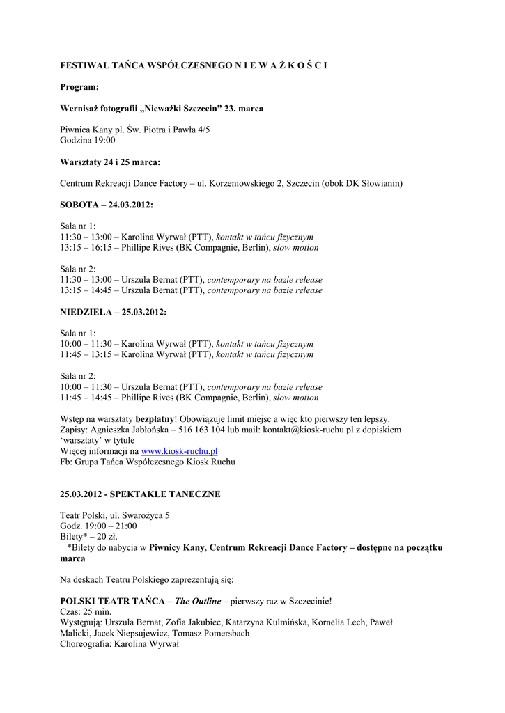 FESTIWAL TAŃCA WSPÓŁCZESNEGO N I E W A Ż K O Ś C I Program: Wernisaż fotografii „Nieważki Szczecin” 23. marca Piwnica Kany pl. Św. Piotra i Pawła 4/5 Godzina 19:00 Warsztaty 24 i 25 marca: Centrum Rekreacji Dance Factory – ul. Korzeniowskiego 2, Szczecin (obok DK Słowianin) SOBOTA – 24.03.2012: Sala nr 1: 11:30 – 13:00 – Karolina Wyrwał (PTT), kontakt w tańcu fizycznym 13:15 – 16:15 – Phillipe Rives (BK Compagnie, Berlin), slow motion Sala nr 2: 11:30 – 13:00 – Urszula Bernat (PTT), contemporary na bazie release 13:15 – 14:45 – Urszula Bernat (PTT), contemporary na bazie release NIEDZIELA – 25.03.2012: Sala nr 1: 10:00 – 11:30 – Karolina Wyrwał (PTT), kontakt w tańcu fizycznym 11:45 – 13:15 – Karolina Wyrwał (PTT), kontakt w tańcu fizycznym Sala nr 2: 10:00 – 11:30 – Urszula Bernat (PTT), contemporary na bazie release 11:45 – 14:45 – Phillipe Rives (BK Compagnie, Berlin), slow motion Wstęp na warsztaty bezpłatny! Obowiązuje limit miejsc a więc kto pierwszy ten lepszy. Zapisy: Agnieszka Jabłońska – 516 163 104 lub mail: [email protected] z dopiskiem ‘warsztaty’ w tytule Więcej informacji na www.kiosk-ruchu.pl Fb: Grupa Tańca Współczesnego Kiosk Ruchu 25.03.2012 - SPEKTAKLE TANECZNE Teatr Polski, ul. Swarożyca 5 Godz. 19:00 – 21:00 Bilety* – 20 zł. *Bilety do nabycia w Piwnicy Kany, Centrum Rekreacji Dance Factory – dostępne na początku marca Na deskach Teatru Polskiego zaprezentują się: POLSKI TEATR TAŃCA – The Outline – pierwszy raz w Szczecinie! Czas: 25 min. Występują: Urszula Bernat, Zofia Jakubiec, Katarzyna Kulmińska, Kornelia Lech, Paweł Malicki, Jacek Niepsujewicz, Tomasz Pomersbach Choreografia: Karolina Wyrwał YARON SHAMIRN – Frozen – pierwszy raz w Polsce! Czas: 13 min. Występują: Yaron Shamir, Meytal Blanaru Choreografia: Baron Shamir TEATR TAŃCA EGO VU – Współczynnik przenikania ciepła – PREMIERA! Czas: ok. 20 min. Występują: d - Eliza Hołubowska, R – Edyta Waszak, U - Weronika Fibich Choreografia: Eliza Hołubowska GRUPA TAŃCA WSPÓŁCZESNEGO KIOSK RUCHU – Litość – PREMIERA! Czas: 25 min. Występują: Agata Adamowcz, Roksana Banasiak, Agnieszka Jabłońska, Diana Kwiatkowska, Karolina Machowska, Aleksandra Lubka, Krzysztof Lubka, Jagoda Szafarkiewicz Choreografia: Krzysztof Lubka