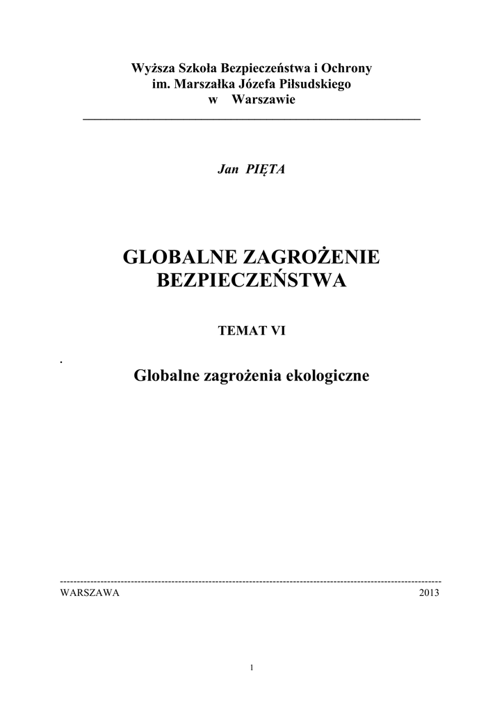 Wyższa Szkoła Bezpieczeństwa i Ochrony im. Marszałka Józefa Piłsudskiego w Warszawie _________________________________________________________ Jan PIĘTA GLOBALNE ZAGROŻENIE BEZPIECZEŃSTWA TEMAT VI . Globalne zagrożenia ekologiczne ----------------------------------------------------------------------------------------------------------------WARSZAWA 2013 1 2 Wstęp 1. Identyfikacja podstawowych pojęć …7 1.1. Pojęcie ekologii …7 1.2. Miejsce ekologii w wśród nauk przyrodniczych …7 1.3. Zakres badań ekologii …8 1.4. Działy ekologii …9 2. Czynniki środowiska warunkujące występowanie organizmów …10 2.1. Główne środowiska życia …10 2.2. Porównanie środowiska lądowego i wodnego …10 2.3. Czynniki abiotyczne …11 3. Populacja …12 3.1 Pojęcie populacji 12 3.2. Struktura i organizacja populacji …12 3.3. Interakcje między populacjami …12 4. Biocenoza …14 4.1. Pojęcie biocenozy …14 4.2. Cechy biocenozy …14 4.3. Struktura troficzna biocenozy …15 5. Ekosystem …16 5.1. Pojęcie ekosystemu …16 5.2. Budowa ekosystemu …16 6. Bezpieczeństwo ekologiczne …18 6.1 Pojęcie bezpieczeństwa ekologicznego …18 6.2. Podmiotowe rodzaje bezpieczeństwa ekologicznego …18 … 6.2.1. Bezpieczeństwo ekologiczne personalne …18 6.2.2.Bezpieczeństwo ekologiczne grupowe …19.. 7. Związek bezpieczeństwa ekologicznego z wybranymi przedmiotowymi rodzajami bezpieczeństwa …21 7.1. Związek bezpieczeństwa ekologicznego z bezpieczeństwem ekonomicznym (gospodarczym) …21 7.2. Związek bezpieczeństwa ekologicznego z bezpieczeństwem energetycznym …21 7.3. Związek bezpieczeństwa ekologicznego z bezpieczeństwem finansowym 22 8. Zagrożenia bezpieczeństwa ekologicznego …24 8.1. Pojęcie zagrożenia bezpieczeństwa ekologicznego …24 8.2. Podział zagrożeń bezpieczeństwa ekologicznego w zależności od ich źródeł …24 8.3. Podział zagrożeń bezpieczeństwa ekologicznego z punktu widzenia obronności 25 9. Katastrofa ekologiczna …26 9.1. Pojęcie katastrofy ekologicznej …26 9.2. Podział katastrof ekologicznych …26 3 4 Wstęp Globalne zagrożenie bezpieczeństwa jest przedmiotem nauczania w Wyższej Szkole Bezpieczeństwa i Ochrony na kierunku bezpieczeństwo narodowe w wymiarze 30 godzin lekcyjnych, w tym 15 godzin wykładów i 15 godzin ćwiczeń. Celem przedmiotu jest pogłębienie wiedzy, umiejętności i kompetencji studentów z zakresu teoretycznych podstaw bezpieczeństwa w wymiarze globalnym i jego podstaw prawnych oraz przygotowanie studentów do właściwej oceny i interpretacji zjawisk zachodzących w sytuacji bezpieczeństwa Polski i regionu, a także rozszerzenie zakresu ich wiedzy, umiejętności i kompetencji w odniesieniu do całej Europy i świata. Treści nauczania podzielone są na pięć jednostek leksykalnych, które obejmują następujące tematy: bezpieczeństwo i globalne źródła zagrożeń, globalne zagrożenia polityczne, globalne zagrożenia militarne, globalne zagrożenia ekonomiczne, globalne zagrożenia społeczne i globalne zagrożenia ekologiczne. W ramach problematyki dotyczącej globalnych zagrożeń ekologicznych, (tematu szóstego) wyszczególniono następujące zagadnienia: identyfikacja podstawowych pojęć z zakresu rozpatrywanej problematyki, czynniki środowiska warunkujące występowanie organizmów, populacja, biocenoza, ekosystem, bezpieczeństwo ekologiczne, związek bezpieczeństwa ekologicznego z wybranymi przedmiotowymi rodzajami bezpieczeństwa oraz zagrożenia bezpieczeństwa ekologicznego. 5 6 1. Identyfikacja podstawowych pojęć Pojęcie ekologii 1.1. Pojęcie ekologii wywodzi się z języka greckiego i składa się z dwóch członów: 1) oíkos, co oznacza ‘mieszkanie’, ‘gospodarstwo’, ‘środowisko’ i 2) lógos, co oznacza ‘słowo’, ‘umysł’, ‘rozprawa’, ‘wiedza’. Pojęcie to współcześnie definiujemy jak w tabeli 1.1. Tabela 1.1 EKOLOGIA Ekologią nazywamy naukę o strukturze i funkcjonowaniu przyrody na różnych poziomach organizacji, ekonomikę przyrody, która bada oddziaływania pomiędzy organizmami żywymi oraz środowiskiem nieożywionym. Tradycyjnie ekologię dzieli się na 2 działy: autekologię i synekologię. Między organizmami tworzącymi zbiór oraz między nimi i środowiskiem abiotycznym zachodzi wiele oddziaływań; zbiory organizmów posiadają więc cechy systemu i stąd nazywa się je systemami ekologicznymi; życie na Ziemi występuje w postaci systemów ekologicznych, które mogą trwać nieskończenie długo, a tworzące je poszczególne organizmy są wymieniane w procesach rozrodu i śmiertelności. Miejsce ekologii w wśród nauk przyrodniczych 1.2. Nauki przyrodnicze to nauki empiryczne, których przedmiotem badań są zjawiska przyrody i ustalenie praw nimi rządzących, należy do nich biologia, chemia, fizyka. Miejsce ekologii w wśród tych nauk przedstawiono w tabeli 1.2. Tabela 1.2 MIEJSCE EKOLOGII W WŚRÓD NAUK PRZYRODNICZYCH Ekologia należy do biologii – systemu nauk o żywej przyrodzie. W naukach biologicznych wyróżniamy działy podstawowe i taksonomiczne, wśród których wyróżniamy działy większe i mniejsze. Ekologia w działach podstawowych występuje obok ewolucjonizmu, fizjologii, embriologii, genetyki i innych, natomiast w działach taksonomicznych większych występuje obok zoologii i botaniki, a w działach mniejszych – wśród bakteriologii, briologii, ichtiologii, entomologii, ornitologii1 Ekologia łączy się także z innymi – wykraczającymi poza obręb biologii – naukami badającymi środowisko, jak np. biogeografia, biofizyka, chemia, klimatologia, gleboznawstwo, hydrografia, sozologia. Jest więc w pewnym sensie nauką interdyscyplinarną, łączącą zarówno dorobek biologii, jak i nauk o środowisku. Mimo tak obszernego zakresu 1 briologia - nauka o mszakach, ichtiologia – nauka o rybach, entomologia – nauka o owadach, ornitologia – nauka o ptakach. 7 jakim zajmuje 