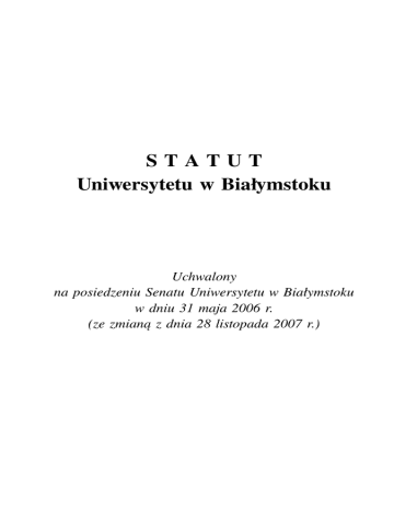 STATUT Uniwersytetu w Białymstoku Uchwalony na posiedzeniu Senatu Uniwersytetu w Białymstoku w dniu 31 maja 2006 r. (ze zmianą z dnia 28 listopada 2007 r.) SPIS TREŚCI DZIAŁ I POSTANOWIENIA OGÓLNE . . . . . . . . . . . . . . . . . 4 Rozdział 1 Tradycje i zwyczaje . . . . . . . . . . . . . . . . . . . . . . . . Rozdział 2 Uroczystości akademickie . . . . . . . . . . . . . . . . . . . . 5 7 DZIAŁ II STRUKTURA I ORGANY UNIWERSYTETU 8 Rozdział Rozdział Rozdział Rozdział Struktura Uniwersytetu . . . . . . . . . . . . . . . . . . . . . . 8 Organy Uniwersytetu . . . . . . . . . . . . . . . . . . . . . . . 11 Struktura jednostek organizacyjnych Uniwersytetu . . . . . 17 Postanowienia wspólne dotyczące organów Uniwersytetu 21 1 2 3 4 DZIAŁ III PRACOWNICY UNIWERSYTETU . . . . .. . . . . . . . . . . . . . 24 Rozdział 1 Nauczyciele akademiccy . . . . . . . . . . . . . . . . . . . . . 25 Rozdział 2 Pracownicy niebędący nauczycielami akademickimi . . . . 33 Rozdział 3 Przepisy wspólne dla pracowników Uniwersytetu . . . . . 34 DZIAŁ IV STUDIA, STUDIA DOKTORANCKIE, STUDENCI I DOKTORANCI UNIWERSYTETU . . . . . . . . . . . . 34 Rozdział Rozdział Rozdział Rozdział 1 2 3 4 DZIAŁ V Studia . . . . . . . . . . . . . . . . . . . . . . . . . . . Studenci i doktoranci . . . . . . . . . . . . . . . . . . Samorząd i organizacje studenckie i doktoranckie Komisje Dyscyplinarne . . . . . . . . . . . . . . . . . . . . . . . . . . . . . . . . . . . . 34 35 37 38 ADMINISTRACJA I GOSPODARKA UNIWERSYTETU 39 Rozdział 1 Administracja Uniwersytetu . . . . . . . . . . . . . . . . . . . 39 Rozdział 2 Gospodarka Uniwersytetu . . . . . . . . . . . . . . . . . . . . 41 DZIAŁ VI PRZEPISY PORZĄDKOWE, PRZEJŚCIOWE I KOŃCOWE . . . . . . . . . . . . . . . . . . . . . . . . . . . 42 Rozdział 1 Zgromadzenia i akcje protestacyjne . . . . . . . . . . . . . . 42 Rozdział 2 Przepisy przejściowe i końcowe . . . . . . . . . . . . . . . . 44 2 Załącznik nr 1 do Statutu Ordynacja Wyborcza Uniwersytetu w Białymstoku . . . . . . . . . 46 Rozdział Rozdział Rozdział Rozdział 1 2 3 4 Postanowienia ogólne . . . . . . . . . . . . . . . . . . Uczelniana Komisja Wyborcza . . . . . . . . . . . . Pozostałe komisje wyborcze . . . . . . . . . . . . . Wybory członków Kolegium Elektorów, Rektora, Prorektorów i Senatu . . . . . . . . . . . . . . . . . . Rozdział 5 Wybory Kolegium Elektorów Wydziału, Dziekana i Prodziekanów . . . . . . . . . . . . . . . . . . . . . Rozdział 6 Postanowienia końcowe . . . . . . . . . . . . . . . . . . . . . 46 . . . . . 48 . . . . . 49 . . . . . 51 . . . . . 54 . . . . . 56 Załącznik nr 2 do Statutu Regulamin okresowego oceniania nauczycieli akademickich . . . 57 3 DZIAŁ I POSTANOWIENIA OGÓLNE §1 1. Uniwersytet w Białymstoku, zwany dalej Uniwersytetem, utworzony Ustawą z dnia 19 czerwca 1997 r. (Dz. U. Nr 102, poz. 642) przez przekształcenie Filii Uniwersytetu Warszawskiego w Białymstoku – jest akademicką uczelnią publiczną działającą na podstawie Ustawy z dnia 27 lipca 2005 r. prawo o szkolnictwie wyższym (Dz. U. Nr 164, poz. 1365), zwanej dalej „Ustawą” oraz niniejszego Statutu. 2. Siedzibą Uniwersytetu jest miasto Białystok. 3. Uniwersytet używa w tłumaczeniu na język angielski nazwy „University of Bialystok” §2 1. Uniwersytet jest samorządną społecznością akademicką nauczycieli akademickich, studentów, doktorantów oraz pracowników niebędących nauczycielami akademickimi, kierowaną przez jego organy kolegialne i jednoosobowe. 2. Podstawowym kierunkiem działalności Uniwersytetu jest kształcenie oraz prowadzenie badań naukowych w zakresie nauk ekonomicznych, fizycznych, humanistycznych, matematycznych, prawnych przyrodniczych, społecznych i teologicznych. 3. Uniwersytet w swych działaniach kieruje się zasadami zawartymi w Wielkiej Karcie Uniwersytetów Europejskich: wolności nauczania, wolności badań naukowych, wolności twórczości artystycznej, tolerancji, dialogu i rozwagi. Uniwersytet działa na rzecz rozwoju nauki, kultury i gospodarki. Uniwersytet wykonując swe zadania kieruje się dobrem Narodu i Państwa. 4. W Uniwersytecie obowiązują powszechnie uznane reguły życzliwości i dobrych obyczajów akademickich. §3 1. Społeczność uniwersytecka uczestniczy w zarządzaniu Uniwersytetem przez wybieralne organy kolegialne i jednoosobowe. W organach kolegialnych reprezentowane są wszystkie grupy społeczności, o których mowa w § 2 ust. 1. 4 2. Istotne decyzje organów Uniwersytetu dotyczące poszczególnych grup społeczności, podejmowane są po zasięgnięciu opinii ich statutowych reprezentantów. §4 Uniwersytet stwarza sprzyjające warunki – zwłaszcza organizacjom absolwentów i przyjaciół Uniwersytetu – do prowadzenia działalności na rzecz społeczności lokalnej i regionalnej, Miasta Białegostoku i Województwa Podlaskiego, oraz pogłębiania więzi Uczelni z krajową, europejską i światową społecznością akademicką. Rozdział 1 Tradycje i zwyczaje §5 1. Godłem Uniwersytetu jest wizerunek Orła Białego Zygmuntowskiego na czerwonym tle, wpisanego w koło, z głową zwróconą w prawo i nakrytą koroną w kolorze złotym, z rozwiniętymi skrzydłami, ze złotym dziobem i szponami. Nad wizerunkiem orła widnieje sześć białych gwiazd symbolizujących liczbę wydziałów w roku utworzenia Uniwersytetu. Pod tym wizerunkiem umieszczone są białe litery U w B. W wewnętrznym otoku znajduje się łacińska nazwa Universitas Bialostocensis, pomiędzy tymi wyrazami widnieją dwie białe gwiazdy oraz zapisany cyframi arabskimi rok 1997, rok utworzenia Uniwersytetu. W zewnętrznym wąskim otoku znajdują się czarne kropki. 2. Godło Uniwersytetu jest znakiem prawnie zastrzeżonym. Może ono być umieszczone w pomieszczeniach Uniwersytetu, na Medalu Uniwersytetu, drukach i wydawnictwach Uniwersytetu oraz na odznakach przysługujących członkom społeczności akademickiej Uniwersytetu, jak