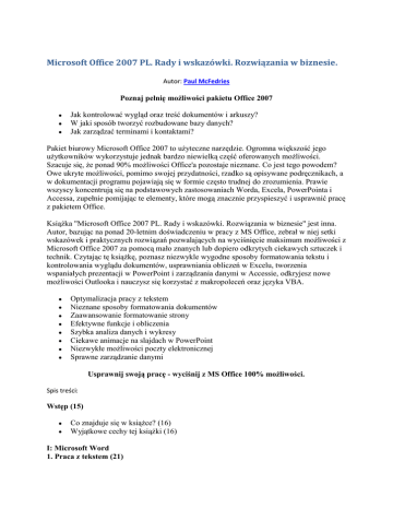 Microsoft Office 2007 PL. Rady i wskazówki. Rozwiązania w biznesie. Autor: Paul McFedries Poznaj pełnię możliwości pakietu Office 2007 Jak kontrolować wygląd oraz treść dokumentów i arkuszy? W jaki sposób tworzyć rozbudowane bazy danych? Jak zarządzać terminami i kontaktami? Pakiet biurowy Microsoft Office 2007 to użyteczne narzędzie. Ogromna większość jego użytkowników wykorzystuje jednak bardzo niewielką część oferowanych możliwości. Szacuje się, że ponad 90% możliwości Office'a pozostaje nieznane. Co jest tego powodem? Owe ukryte możliwości, pomimo swojej przydatności, rzadko są opisywane podręcznikach, a w dokumentacji programu pojawiają się w formie często trudnej do zrozumienia. Prawie wszyscy koncentrują się na podstawowych zastosowaniach Worda, Excela, PowerPointa i Accessa, zupełnie pomijając te elementy, które mogą znacznie przyspieszyć i usprawnić pracę z pakietem Office. Książka "Microsoft Office 2007 PL. Rady i wskazówki. Rozwiązania w biznesie" jest inna. Autor, bazując na ponad 20-letnim doświadczeniu w pracy z MS Office, zebrał w niej setki wskazówek i praktycznych rozwiązań pozwalających na wyciśnięcie maksimum możliwości z Microsoft Office 2007 za pomocą mało znanych lub dopiero odkrytych ciekawych sztuczek i technik. Czytając tę książkę, poznasz niezwykle wygodne sposoby formatowania tekstu i kontrolowania wyglądu dokumentów, usprawniania obliczeń w Excelu, tworzenia wspaniałych prezentacji w PowerPoint i zarządzania danymi w Accessie, odkryjesz nowe możliwości Outlooka i nauczysz się korzystać z makropoleceń oraz języka VBA. Optymalizacja pracy z tekstem Nieznane sposoby formatowania dokumentów Zaawansowanie formatowanie strony Efektywne funkcje i obliczenia Szybka analiza danych i wykresy Ciekawe animacje na slajdach w PowerPoint Niezwykłe możliwości poczty elektronicznej Sprawne zarządzanie danymi Usprawnij swoją pracę - wyciśnij z MS Office 100% możliwości. Spis treści: Wstęp (15) Co znajduje się w książce? (16) Wyjątkowe cechy tej książki (16) I: Microsoft Word 1. Praca z tekstem (21) Nagłówki tabeli w polu widzenia (22) Podsumowywanie kolumn w tabeli (23) Obliczanie podatku na fakturze (25) Podświetlanie słowa lub frazy (27) Zastosowanie Autokorekty do wstawiania własnego podpisu (28) Zastosowanie Autokorekty do wprowadzania powtarzalnych tekstów (30) Zapisywanie powtarzalnego tekstu jako bloku konstrukcyjnego typu autotekst (31) Stworzenie obszaru "kliknij i wpisz" (33) Proszenie użytkownika o wpisanie tekstu (35) Tworzenie dynamicznego wpisu Autokorekty (36) Dodawanie zastępczego tekstu do dokumentu (37) o Zastosowanie funkcji RAND (37) o Zastosowanie komendy Powtórz (38) Wstawianie łącza do dokumentu (39) o Tworzenie hiperłącza za pomocą Autokorekty (40) o Tworzenie hiperłącza od zera (41) o Wklejanie hiperłącza w Wordzie (42) Wyświetlanie liczby wyrazów w zdaniu (42) Znajdowanie najdłuższego zdania w dokumencie (44) Włączanie ukrytych symboli, kodów i tekstów (46) Tworzenie ortograficznego słownika użytkownika (47) Co dalej? (49) 2. Formatowanie (51) Szybka modyfikacja stylu Normalnego (52) Ustawianie galerii szybkich stylów, by odpowiadała charakterowi pracy (52) Zmiana formatowania planu dokumentu (55) Zaznaczanie tekstu z podobnym formatowaniem (56) Kopiowanie formatowania z jednej sekcji do innej (57) Porównywanie formatowania dwóch zaznaczonych fragmentów (57) Precyzyjne usuwanie formatowania (59) Zastępowanie jednego stylu innym (60) Formatowanie za pomocą skrótów klawiaturowych (62) Dodawanie punktorów użytkownika (65) Tworzenie list numerowanych (67) Konwertowanie słów napisanych wielkimi literami (70) Zamiana cudzysłowów zwykłych na drukarskie (71) Formatowanie pojedynczej kolumny jako tekstu odseparowanego tabulatorami (73) Zapewnienie jednorodności formatowania (74) Otaczanie obrazka tekstem (76) Dodawanie inicjału (77) Co dalej? (78) 3. Praca z dokumentami (79) Odzyskiwanie większej części utraconych dokumentów dzięki krótszej przerwie pomiędzy operacjami autoodzyskiwania (79) Automatyczne częste zapisywanie plików (80) Zamykanie dokumentu bez zapisywania (82) Zamykanie wszystkich otwartych dokumentów (84) Tworzenie kopii zapasowych podczas pracy (85) Pokazywanie większej liczby elementów na liście niedawno używanych dokumentów (87) Otwieranie ostatnio używanego dokumentu przy uruchamianiu aplikacji (87) Czyszczenie listy ostatnio używanych dokumentów (88) Tworzenie i otwieranie obszarów roboczych złożonych z dokumentów (89) Automatyczne pytanie o właściwości dokumentu (92) Tworzenie zaufanej lokalizacji dla dokumentów (93) Podgląd całkowitego czasu edycji aktualizowany w czasie rzeczywistym (95) Obliczanie należności za przepracowany czas (97) Zablokowanie formatowania dokumentu (97) Śledzenie zmian (99) Edycja ustrukturalizowana (100) Badanie dokumentu pod kątem informacji osobistych (104) Przeglądanie dwóch dokumentów obok siebie (105) Automatyczna aktualizacja wszystkich pól (107) Co dalej? (108) 4. Układ strony (109) Wyświetlanie tekstu w powiązanych polach tekstowych (109) Tworzenie odsyłaczy (111) Tworzenie indywidualnego znaku wodnego (112) Wstawianie pergaminowego tła (114) Wyświetlanie dokumentu z przypadkową teksturą tła (114) Wyświetlanie tekstu z numerami linii (116) Kontynuacja numerów w dwóch osobnych listach numerowanych (118) Wykorzystanie różnych formatów numerowania stron w jednym dokumencie (119) Wstawianie unikalnego nagłówka i stopki na pierwszej stronie (121) Zastosowanie różnych nagłówków dla stron parzystych i nieparzystych (122) Dodawanie marginesu na oprawę (122) Tworzenie poziomów konspektu przez użytkownika (124) Co dalej? (124) II: Microsoft Excel 5. Formuły i funkcje (127) Komórki przyjmujące tylko określone wartości (127) Wyszukiwanie wartości rabatu w tabeli (129) Wyszukiwanie kodu klienta (131) Generowani