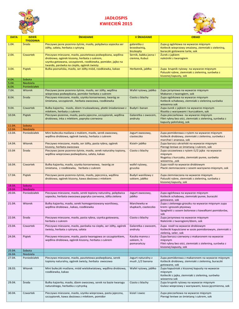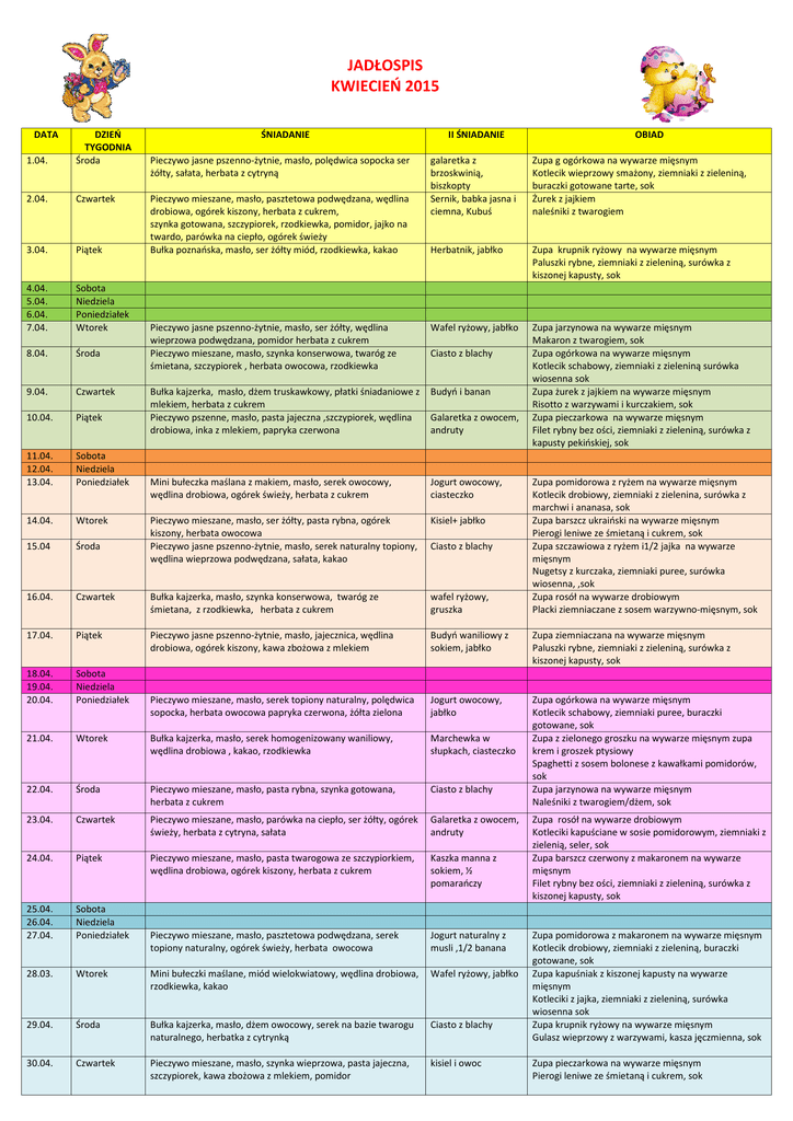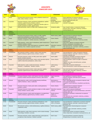 JADŁOSPIS KWIECIEŃ 2015 DATA 1.04. DZIEŃ TYGODNIA Środa 2.04. Czwartek 3.04. Piątek 4.04. 5.04. 6.04. 7.04. Sobota Niedziela Poniedziałek Wtorek 8.04. Środa 9.04. Czwartek 10.04. Piątek 11.04. 12.04. 13.04. Sobota Niedziela Poniedziałek 14.04. Wtorek 15.04 Środa 16.04. ŚNIADANIE Pieczywo jasne pszenno-żytnie, masło, polędwica sopocka ser żółty, sałata, herbata z cytryną II ŚNIADANIE OBIAD galaretka z brzoskwinią, biszkopty Sernik, babka jasna i ciemna, Kubuś Zupa g ogórkowa na wywarze mięsnym Kotlecik wieprzowy smażony, ziemniaki z zieleniną, buraczki gotowane tarte, sok Żurek z jajkiem naleśniki z twarogiem Herbatnik, jabłko Zupa krupnik ryżowy na wywarze mięsnym Paluszki rybne, ziemniaki z zieleniną, surówka z kiszonej kapusty, sok Pieczywo jasne pszenno-żytnie, masło, ser żółty, wędlina wieprzowa podwędzana, pomidor herbata z cukrem Pieczywo mieszane, masło, szynka konserwowa, twaróg ze śmietana, szczypiorek , herbata owocowa, rzodkiewka Wafel ryżowy, jabłko Bułka kajzerka, masło, dżem truskawkowy, płatki śniadaniowe z mlekiem, herbata z cukrem Pieczywo pszenne, masło, pasta jajeczna ,szczypiorek, wędlina drobiowa, inka z mlekiem, papryka czerwona Budyń i banan Zupa jarzynowa na wywarze mięsnym Makaron z twarogiem, sok Zupa ogórkowa na wywarze mięsnym Kotlecik schabowy, ziemniaki z zieleniną surówka wiosenna sok Zupa żurek z jajkiem na wywarze mięsnym Risotto z warzywami i kurczakiem, sok Zupa pieczarkowa na wywarze mięsnym Filet rybny bez ości, ziemniaki z zieleniną, surówka z kapusty pekińskiej, sok Mini bułeczka maślana z makiem, masło, serek owocowy, wędlina drobiowa, ogórek świeży, herbata z cukrem Jogurt owocowy, ciasteczko Pieczywo mieszane, masło, ser żółty, pasta rybna, ogórek kiszony, herbata owocowa Pieczywo jasne pszenno-żytnie, masło, serek naturalny topiony, wędlina wieprzowa podwędzana, sałata, kakao Kisiel+ jabłko Czwartek Bułka kajzerka, masło, szynka konserwowa, twaróg ze śmietana, z rzodkiewka, herbata z cukrem wafel ryżowy, gruszka 17.04. Piątek Pieczywo jasne pszenno-żytnie, masło, jajecznica, wędlina drobiowa, ogórek kiszony, kawa zbożowa z mlekiem Budyń waniliowy z sokiem, jabłko Zupa ziemniaczana na wywarze mięsnym Paluszki rybne, ziemniaki z zieleniną, surówka z kiszonej kapusty, sok 18.04. 19.04. 20.04. Sobota Niedziela Poniedziałek Pieczywo mieszane, masło, serek topiony naturalny, polędwica sopocka, herbata owocowa papryka czerwona, żółta zielona Jogurt owocowy, jabłko 21.04. Wtorek Bułka kajzerka, masło, serek homogenizowany waniliowy, wędlina drobiowa , kakao, rzodkiewka Marchewka w słupkach, ciasteczko 22.04. Środa Pieczywo mieszane, masło, pasta rybna, szynka gotowana, herbata z cukrem Ciasto z blachy Zupa ogórkowa na wywarze mięsnym Kotlecik schabowy, ziemniaki puree, buraczki gotowane, sok Zupa z zielonego groszku na wywarze mięsnym zupa krem i groszek ptysiowy Spaghetti z sosem bolonese z kawałkami pomidorów, sok Zupa jarzynowa na wywarze mięsnym Naleśniki z twarogiem/dżem, sok 23.04. Czwartek Pieczywo mieszane, masło, parówka na ciepło, ser żółty, ogórek świeży, herbata z cytryna, sałata Galaretka z owocem, andruty 24.04. Piątek Pieczywo mieszane, masło, pasta twarogowa ze szczypiorkiem, wędlina drobiowa, ogórek kiszony, herbata z cukrem Kaszka manna z sokiem, ½ pomarańczy 25.04. 26.04. 27.04. Sobota Niedziela Poniedziałek Pieczywo mieszane, masło, pasztetowa podwędzana, serek topiony naturalny, ogórek świeży, herbata owocowa Jogurt naturalny z musli ,1/2 banana 28.03. Wtorek Mini bułeczki maślane, miód wielokwiatowy, wędlina drobiowa, rzodkiewka, kakao Wafel ryżowy, jabłko 29.04. Środa Bułka kajzerka, masło, dżem owocowy, serek na bazie twarogu naturalnego, herbatka z cytrynką Ciasto z blachy 30.04. Czwartek Pieczywo mieszane, masło, szynka wieprzowa, pasta jajeczna, szczypiorek, kawa zbożowa z mlekiem, pomidor kisiel i owoc Pieczywo mieszane, masło, pasztetowa podwędzana, wędlina drobiowa, ogórek kiszony, herbata z cukrem, szynka gotowana, szczypiorek, rzodkiewka, pomidor, jajko na twardo, parówka na ciepło, ogórek świeży Bułka poznańska, masło, ser żółty miód, rzodkiewka, kakao Ciasto z blachy Galaretka z owocem, andruty Ciasto z blachy Zupa pomidorowa z ryżem na wywarze mięsnym Kotlecik drobiowy, ziemniaki z zielenina, surówka z marchwi i ananasa, sok Zupa barszcz ukraiński na wywarze mięsnym Pierogi leniwe ze śmietaną i cukrem, sok Zupa szczawiowa z ryżem i1/2 jajka na wywarze mięsnym Nugetsy z kurczaka, ziemniaki puree, surówka wiosenna, ,sok Zupa rosół na wywarze drobiowym Placki ziemniaczane z sosem warzywno-mięsnym, sok Zupa rosół na wywarze drobiowym Kotleciki kapuściane w sosie pomidorowym, ziemniaki z zielenią, seler, sok Zupa barszcz czerwony z makaronem na wywarze mięsnym Filet rybny bez ości, ziemniaki z zieleniną, surówka z kiszonej kapusty, sok Zupa pomidorowa z makaronem na wywarze mięsnym Kotlecik drobiowy, ziemniaki z zieleniną, buraczki gotowane, sok Zupa kapuśniak z kiszonej kapusty na wywarze mięsnym Kotleciki z jajka, ziemniaki z zieleniną, surówka wiosenna sok Zupa krupnik ryżowy na wywarze mięsnym Gulasz wieprzowy z warzywami, kasza jęczmienna, sok Zupa pieczarkowa na wywarze mięsnym Pierogi leniwe ze śmietaną i cukrem, sok