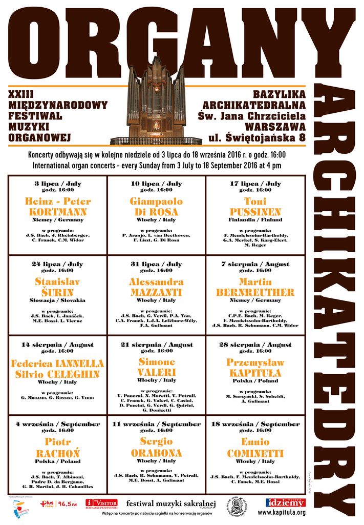 XXIII MIÊDZYNARODOWY FESTIWAL MUZYKI ORGANOWEJ Bazylika Archikatedralna Św. Jana Chrzciciela WARSZAWA ul. Świętojańska 8 Koncerty odbywają się w kolejne niedziele od 3 lipca do 18 września 2016 r. o godz. 16:00 International organ concerts - every Sunday from 3 July to 18 September 2016 at 4 pm 10 lipca / July 17 lipca / July Heinz - Peter KORTMANN Giampaolo Di ROSA Włochy / Italy Toni PUSSINEN Finlandia / Finland w programie: J.S. Bach, J. Rheinberger, C. Franck, C.M. Widor w programie: P. Araujo, L. van Beethoven, F. Liszt, G. Di Rosa w programie: F. Mendelssohn-Bartholdy, G.A. Merkel, S. Karg-Elert, M. Reger 24 lipca / July 31 lipca / July 7 sierpnia / August Stanislav Šurin Alessandra MAZZANTI Martin BERNREUTHER w programie: J.S. Bach, L. Janáček, M.E. Bossi, L. Vierne w programie: J.S. Bach, G. Verdi, P.A. Yon, C.A. Franck, L.J.A. Lefébure-Wély, F.A. Guilmant w programie: C.P.E. Bach, M. Reger, F. Mendelssohn-Bartholdy, J.S. Bach, R. Schumann, C.M. Widor 14 sierpnia / August 21 sierpnia / August 28 sierpnia / August Federica IANNELLA Silvio CELEGHIN Włochy / Italy Simone VALERI Włochy / Italy Przemysław KAPITUŁA w programie: G. Morandi, G. Rossini, G. Verdi w programie: V. Panerai, N. Moretti, V. Petrali, C. Franck, G. Valeri, C. Casini, D. Puccini, G. Verdi, G. Quirici, G. Donizetti w programie: M. Surzyński, S. Scheidt, A. Gulimant 4 września / September 11 września / September 18 września / September Piotr RACHOŃ Sergio ORABONA Ennio COMINETTI w programie: J.S. Bach, T. Albinoni, Padre D. da Bergamo, G. B. Martini, J. B. Cabanilles w programie: J.S. Bach, R. Schumann, V. Petrali, M.E. Bossi, A. Gulimant w programie: J.S. Bach, F. Mendelssohn-Bartholdy, C. Fanck, M.E. Bossi godz. 16:00 Niemcy / Germany godz. 16:00 godz. 16:00 Niemcy / Germany godz. 16:00 godz. 16:00 Polska / Poland godz. 16:00 Włochy / Italy Słowacja / Slovakia godz. 16:00 godz. 16:00 godz. 16:00 godz. 16:00 Polska / Poland godz. 16:00 Włochy / Italy Włochy / Italy Projekt współfinansuje m.st.Warszawa festiwal muzyki sakralnej FUNDACJA Wstęp na koncerty po nabyciu cegiełki na konserwację organów www.kapitula.org Ewa Chojecka 2016 3 lipca / July godz. 16:00 ARCHIKATEDRY ORGANY