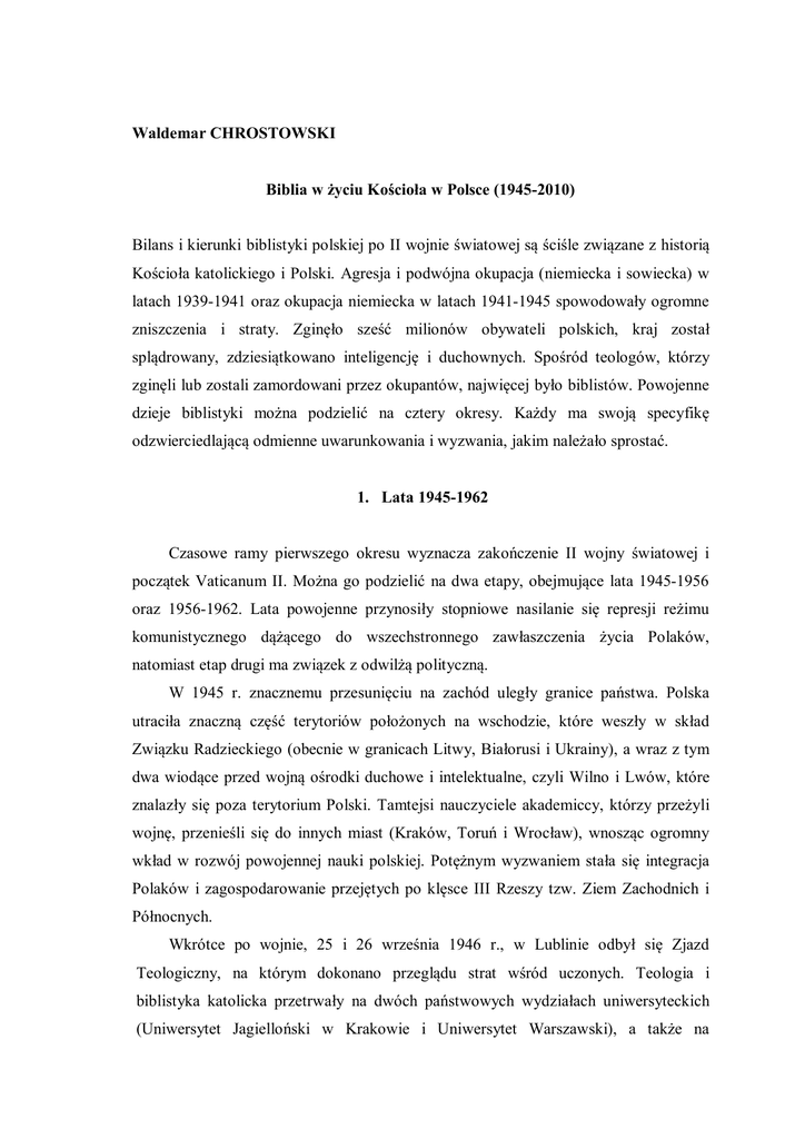 Waldemar CHROSTOWSKI Biblia w życiu Kościoła w Polsce (1945