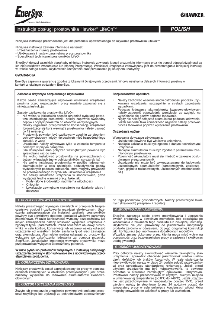 Instrukcja obsługi prostownika Hawker® LifeOnTM POLISH Niniejsza instrukcja przeznaczona jest dla personelu upoważnionego do używania prostownika LifeOn™ Niniejsza instrukcja zawiera informacje na temat: • Przeznaczenia i funkcji prostownika • Użytkowania i nastaw parametrów pracy prostownika • Specyfikacji technicznej prostowników LifeOn EnerSys® dołożył wszelkich starań aby niniejsza instrukcja zawierała jasne i zrozumiałe informacje oraz nie ponosi odpowiedzialności za ich nieprawidłowe zrozumienie lub błędną interpretację. Właściciel urządzenia zobowiązany jest do przestrzegania niniejszej instrukcji w trakcie całego okresu użytkowania urządzenia oraz przekazania jej kolejnemu nabywcy. GWARANCJA EnerSys zapewnia gwarancję zgodną z lokalnymi (krajowymi) przepisami. W celu uzyskania dalszych informacji prosimy o kontakt z lokalnym oddziałem EnerSys. Zalecenia dotyczące bezpiecznego użytkowania Każda osoba zamierzająca użytkować omawiane urządzenie powinna przed rozpoczęciem pracy uważnie zapoznać się z niniejszą instrukcją. Zasady użytkowania prostownika LifeOn: • Nie wolno w jakikolwiek sposób utrudniać cyrkulacji powietrza chłodzącego prostownik, należy zapewnić swobodny dopływ i odpływ powietrza do otworów wentylacyjnych • Należy regularnie przeprowadzać konserwację urządzenia (gromadzący się kurz wewnątrz prostownika należy usuwać co 12 miesięcy) • Prostownik powinien być użytkowany zgodnie ze stopniem ochrony obudowy i nigdy nie powinien mieć bezpośredniego kontaktu z wodą • Urządzenie należy użytkować tylko w zakresie temperatur podanym w piątym paragrafie • Siła dokręcenia śrub połączeń wewnętrznych powinna być sprawdzana raz do roku • Nie wolno instalować prostownika na powierzchniach o dużych wibracjach (np w pobliżu silników, sprężarek itp) • Nie wolno instalować prostownika w pobliżu ładowanych akumulatorów w celu uniknięcia oddziaływania gazów wydzielanych podczas ładowania, które mogłyby prowadzić do przedwczesnego zużycia lub uszkodzenia urządzenia • Nie należy instalować urządzenia w środowiskach, gdzie występują trudne warunki pracy, takie jak: • Porty (słone środowisko, nadmierna wilgotność) • Chłodnie • Lokalizacje zewnętrzne (narażenie na działanie wiatru i deszczu) 1. BEZPIECZEŃSTWO ELEKTRYCZNE Należy przestrzegać wymagań zawartych w przepisach bezpieczeństwa obsługi i użytkowania urządzeń elektrycznych. Urządzenia zabezpieczające dla instalacji zasilania prostowników powinny być prawidłowo dobrane i posiadać właściwe parametry znamionowe. W razie konieczności wymiany bezpieczników lub innych zabezpieczeń należy stosować wyłącznie urządzenia o zgodnym typie i parametrach. Przed otwarciem obudowy prostownika w celu kontroli, konserwacji lub naprawy należy odłączyć urządzenie od wszelkich źródeł zasilania tj od sieci zasilającej oraz akumulatora. Akumulator można odłączać od prostownika wyłącznie po zakończeniu ładowania za pomocą przycisku Stop/Start. Jakąkolwiek ingerencję wewnątrz prostownika może przeprowadzać wyłącznie upoważniony personel. W razie pytań lub problemów związanych z instalacją niniejszego urządzenia prosimy o skonsultowanie się z upoważnionym przedstawicielem producenta. 2. OGRANICZENIA UŻYTKOWANIA Niniejszy prostownik został zaprojektowany do pracy w pomieszczeniach zamkniętych w obiektach przemysłowych i jest przeznaczony wyłącznie do ładowania akumulatorów kwasowoołowiowych. 3. ODZYSK I UTYLIZACJA PRODUKTU Zużyte lub przestarzałe urządzenie powinno być poddane procesowi recyklingu lub utylizacji za pośrednictwem upoważnionych Bezpieczeństwo operatora • • • Należy zachować wszelkie środki ostrożności podczas użytkowania urządzenia, szczególnie w strefach zagrożenia wypadkami. Podczas ładowania akumulatorów kwasowo-ołowiowych należy zapewnić odpowiednią wentylację, ze względu na wydzielanie się gazów podczas ładowania. Nigdy nie należy odłączać akumulatora podczas ładowania. Jeżeli zachodzi taka konieczność najpierw należy przerwać proces ładowania poprzez wyłączenie prostownika. Ostrzeżenia ogólne Wymagania dotyczące użytkowania: • Urządzenie powinno być właściwie uziemione. • Napięcie zasilania musi być zgodne z danymi technicznymi urządzenia. • Napięcie akumulatora musi być zgodne z parametrami znamionowymi prostownika. • Pojemność akumulatora musi się mieścić w zakresie obsługiwanym przez prostownik • Urządzenie nie może być wykorzystywane do ładowania uszkodzonych akumulatorów (zamarzniętych, zasiarczonych, głęboko rozładowanych, uszkodzonych mechanicznie itd.) do tego podmiotów gospodarczych. Należy przestrzegać lokalnych (krajowych) przepisów i regulacji. 4. MODYFIKACJE I ULEPSZENIA EnerSys zastrzega sobie prawo modyfikowania i ulepszania swoich produktów w dowolnym momencie, bez obowiązku po wiadamiania o zmianach tego produktu lub niniejszej instrukcji. Użytkownik nie jest uprawniony do jakichkolwiek modyfikacji produktu zarówno w odniesieniu do jego oryginalnej konstrukcji jak i konfiguracji (np. montowania dodatkowych modułów). Wszelkie zmiany dokonane przez klienta mogą mieć wpływ na poprawność oraz bezpieczeństwo pracy urządzenia i skutkować utratą gwarancji. 5. ODBIÓR I MAGAZYNOWANIE Przy odbiorze należy skontrolować wizualnie zewnętrzny stan urządzenia i sprawdzić obecność jakichkolwiek śladów uszkodzeń, defektów lub braków fizycznych. W razie stwierdzenia nieprawidłowości należy w ciągu 24 godzin zgłosić przewoźnikowi oraz sprzedawcy standardową reklamację. Jeżeli przed użyciem urządzenie ma być magazynowane, to powinno pozostać w starannie zamkniętym opakowaniu fabrycznym. Prostownik należy przechowywać w czystym, suchym miejscu w umiarkowanej temperaturze (od 0°C do +40°C). Jeżeli urządze