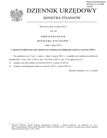 Marta Anna Maciążek 2015.07.13 15:18:06 +02'00' Warszawa, dnia 13 lipca 2015 r. Poz. 44 OBWIESZCZENIE M I N I S T R A F I N A N S Ó W 1) z dnia 7 lipca 2015 r. w sprawie średniej ceny tony miedzi oraz średniej ceny kilograma srebra za czerwiec 2015 r. Na podstawie art. 8 ust. 1 ustawy z dnia 2 marca 2012 r. o podatku od wydobycia niektórych kopalin (Dz. U. poz. 362, z 2014 r. poz. 1215 oraz z 2015 r. poz. 211) ogłasza się, że: 1) średnia cena tony miedzi za czerwiec 2015 r. wynosi 21 655 zł; 2) średnia cena kilograma srebra za czerwiec 2015 r. wynosi 1922 zł. Minister Finansów: wz. J. Cichoń 1) Minister Finansów kieruje działem administracji rządowej – finanse publiczne, na podstawie § 1 ust. 2 pkt 2 rozporządzenia Prezesa Rady Ministrów z dnia 22 września 2014 r. w sprawie szczegółowego zakresu działania Ministra Finansów (Dz. U. poz. 1256).