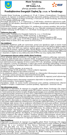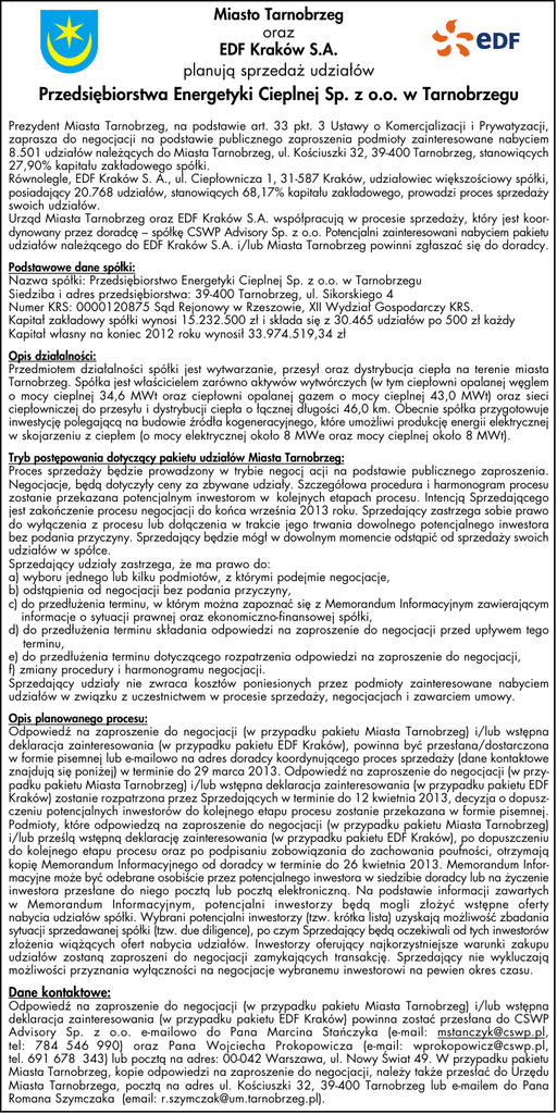 Miasto Tarnobrzeg oraz EDF Kraków S.A. planują sprzedaż udziałów Przedsiębiorstwa Energetyki Cieplnej Sp. z o.o. w Tarnobrzegu Prezydent Miasta Tarnobrzeg, na podstawie art. 33 pkt. 3 Ustawy o Komercjalizacji i Prywatyzacji, zaprasza do negocjacji na podstawie publicznego zaproszenia podmioty zainteresowane nabyciem 8.501 udziałów należących do Miasta Tarnobrzeg, ul. Kościuszki 32, 39-400 Tarnobrzeg, stanowiących 27,90% kapitału zakładowego spółki. Równolegle, EDF Kraków S. A., ul. Ciepłownicza 1, 31-587 Kraków, udziałowiec większościowy spółki, posiadający 20.768 udziałów, stanowiących 68,17% kapitału zakładowego, prowadzi proces sprzedaży swoich udziałów. Urząd Miasta Tarnobrzeg oraz EDF Kraków S.A. współpracują w procesie sprzedaży, który jest koordynowany przez doradcę – spółkę CSWP Advisory Sp. z o.o. Potencjalni zainteresowani nabyciem pakietu udziałów należącego do EDF Kraków S.A. i/lub Miasta Tarnobrzeg powinni zgłaszać się do doradcy. Podstawowe dane spółki: Nazwa spółki: Przedsiębiorstwo Energetyki Cieplnej Sp. z o.o. w Tarnobrzegu Siedziba i adres przedsiębiorstwa: 39-400 Tarnobrzeg, ul. Sikorskiego 4 Numer KRS: 0000120875 Sąd Rejonowy w Rzeszowie, XII Wydział Gospodarczy KRS. Kapitał zakładowy spółki wynosi 15.232.500 zł i składa się z 30.465 udziałów po 500 zł każdy Kapitał własny na koniec 2012 roku wynosił 33.974.519,34 zł Opis działalności: Przedmiotem działalności spółki jest wytwarzanie, przesył oraz dystrybucja ciepła na terenie miasta Tarnobrzeg. Spółka jest właścicielem zarówno aktywów wytwórczych (w tym ciepłowni opalanej węglem o mocy cieplnej 34,6 MWt oraz ciepłowni opalanej gazem o mocy cieplnej 43,0 MWt) oraz sieci ciepłowniczej do przesyłu i dystrybucji ciepła o łącznej długości 46,0 km. Obecnie spółka przygotowuje inwestycję polegającą na budowie źródła kogeneracyjnego, które umożliwi produkcję energii elektrycznej w skojarzeniu z ciepłem (o mocy elektrycznej około 8 MWe oraz mocy cieplnej około 8 MWt). Tryb postępowania dotyczący pakietu udziałów Miasta Tarnobrzeg: Proces sprzedaży będzie prowadzony w trybie negocj acji na podstawie publicznego zaproszenia. Negocjacje, będą dotyczyły ceny za zbywane udziały. Szczegółowa procedura i harmonogram procesu zostanie przekazana potencjalnym inwestorom w kolejnych etapach procesu. Intencją Sprzedającego jest zakończenie procesu negocjacji do końca września 2013 roku. Sprzedający zastrzega sobie prawo do wyłączenia z procesu lub dołączenia w trakcie jego trwania dowolnego potencjalnego inwestora bez podania przyczyny. Sprzedający będzie mógł w dowolnym momencie odstąpić od sprzedaży swoich udziałów w spółce. Sprzedający udziały zastrzega, że ma prawo do: a) wyboru jednego lub kilku podmiotów, z którymi podejmie negocjacje, b) odstąpienia od negocjacji bez podania przyczyny, c) do przedłużenia terminu, w którym można zapoznać się z Memorandum Informacyjnym zawierającym informacje o sytuacji prawnej oraz ekonomiczno-finansowej spółki, d) do przedłużenia terminu składania odpowiedzi na zaproszenie do negocjacji przed upływem tego terminu, e) do przedłużenia terminu dotyczącego rozpatrzenia odpowiedzi na zaproszenie do negocjacji, f) zmiany procedury i harmonogramu negocjacji. Sprzedający udziały nie zwraca kosztów poniesionych przez podmioty zainteresowane nabyciem udziałów w związku z uczestnictwem w procesie sprzedaży, negocjacjach i zawarciem umowy. Opis planowanego procesu: Odpowiedź na zaproszenie do negocjacji (w przypadku pakietu Miasta Tarnobrzeg) i/lub wstępna deklaracja zainteresowania (w przypadku pakietu EDF Kraków), powinna być przesłana/dostarczona w formie pisemnej lub e-mailowo na adres doradcy koordynującego proces sprzedaży (dane kontaktowe znajdują się poniżej) w terminie do 29 marca 2013. Odpowiedź na zaproszenie do negocjacji (w przypadku pakietu Miasta Tarnobrzeg) i/lub wstępna deklaracja zainteresowania (w przypadku pakietu EDF Kraków) zostanie rozpatrzona przez Sprzedających w terminie do 12 kwietnia 2013, decyzja o dopuszczeniu potencjalnych inwestorów do kolejnego etapu procesu zostanie przekazana w formie pisemnej. Podmioty, które odpowiedzą na zaproszenie do negocjacji (w przypadku pakietu Miasta Tarnobrzeg) i/lub prześlą wstępną deklarację zainteresowania (w przypadku pakietu EDF Kraków), po dopuszczeniu do kolejnego etapu procesu oraz po podpisaniu zobowiązania do zachowania poufności, otrzymają kopię Memorandum Informacyjnego od doradcy w terminie do 26 kwietnia 2013. Memorandum Informacyjne może być odebrane osobiście przez potencjalnego inwestora w siedzibie doradcy lub na życzenie inwestora przesłane do niego pocztą lub pocztą elektroniczną. Na podstawie informacji zawartych w Memorandum Informacyjnym, potencjalni inwestorzy będą mogli złożyć wstępne oferty nabycia udziałów spółki. Wybrani potencjalni inwestorzy (tzw. krótka lista) uzyskają możliwość zbadania sytuacji sprzedawanej spółki (tzw. due diligence), po czym Sprzedający będą oczekiwali od tych inwestorów złożenia wiążących ofert nabycia udziałów. Inwestorzy oferujący najkorzystniejsze warunki zakupu udziałów zostaną zaproszeni do negocjacji zamykających transakcję. Sprzedający nie wykluczają możliwości przyznania wyłączności na negocjacje wybranemu inwestorowi na pewien okres czasu. Dane kontaktowe: Odpowiedź na zaproszenie do negocjacji (w przypadku pakietu Miasta Tarnobrzeg) i/lub wstępna deklaracja zainteresowania (w przypadku pakietu EDF Kraków) powinna zostać przesłana do CSWP Advisory Sp. z o.o. e-mailowo do Pana Marcina Stańczyka (e-mail: [email protected], tel: 784 546 990) oraz Pana Wojciecha Prokopowicza (e-mail: [email protected], tel. 691 678 343) lub pocztą na adres: 00-042 Warszawa, ul. Nowy Świat 49. W przypadku pakietu Miasta Tarnobrzeg, kopie odpowiedzi 