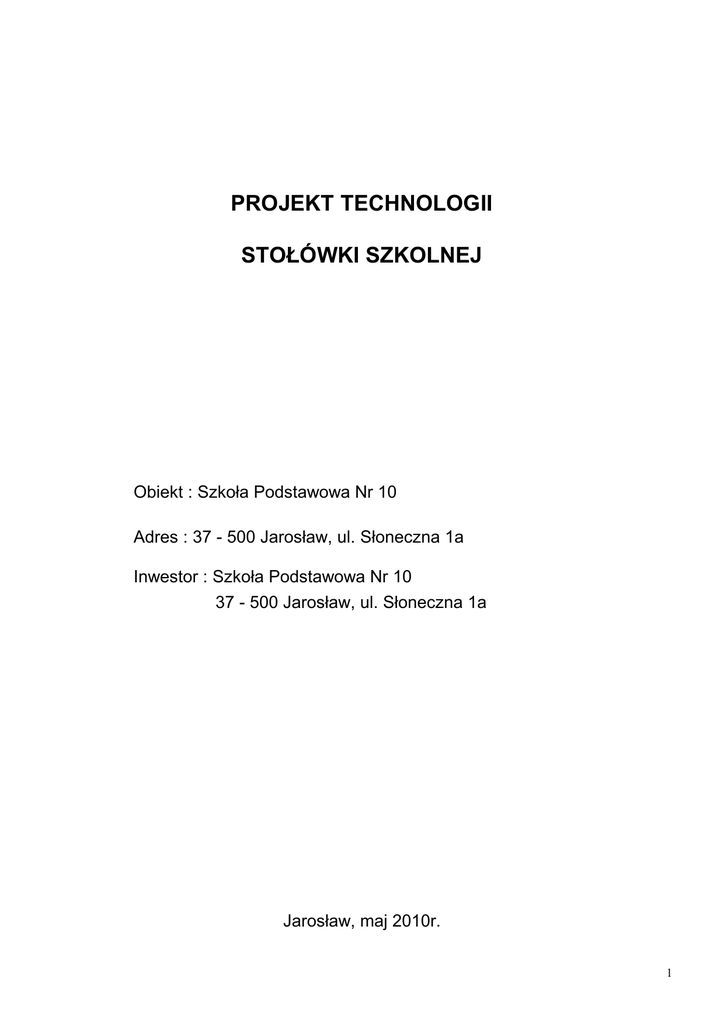 PROJEKT TECHNOLOGII STOŁÓWKI SZKOLNEJ Obiekt : Szkoła Podstawowa Nr 10 Adres : 37 - 500 Jarosław, ul. Słoneczna 1a Inwestor : Szkoła Podstawowa Nr 10 37 - 500 Jarosław, ul. Słoneczna 1a Jarosław, maj 2010r. 1 ZAWARTOŚĆ: 1. Opis techniczny 2. Wymagania technologiczne 3. WyposaŜenie technologiczne 4. Wytyczne utrzymania warunków sanitarnych w obiekcie 5. Instrukcje: - mycia i dezynfekcji pomieszczeń i urządzeń sanitarnych - mycia i dezynfekcji rąk - mycia i dezynfekcji urządzeń chłodniczych - dezynfekcja chemiczna jaj przeznaczonych do spoŜycia 6. Opracowanie graficzne rys. nr 1- rzut zespołu pomieszczeń - adaptacja rys. nr 2- rzut zespołu pomieszczeń kuchni - technologia 2 OPIS TECHNICZNY 1. Podstawa opracowania 1) projekt techniczny - architektoniczno - budowlany 2) projekt pomieszczeń budynku segmentu Ŝywieniowego 3) ustalenia zakresu opracowania z Inwestorem 4) rozporządzenie Ministra Infrastruktury z dnia 12 kwietnia 2002 r. w sprawie warunków technicznych, jakim powinny odpowiadać budynki i ich usytuowanie [Dz.U. Nr 75, poz. 690 z póź. zm.] 5) rozporządzenie Ministra Pracy i Polityki Socjalnej z dnia 26 września 1997 r. w sprawie ogólnych przepisów bezpieczeństwa i higieny pracy [jednolity tekst Dz. U. Nr 169,poz.1650] 6) rozporządzenie Ministra Zdrowia z dnia 19 grudnia 2002 r. w sprawie wymagań higieniczno sanitarnych zakładów i wymagań dotyczących higieny w procesie produkcji i w obrocie artykułami oraz materiałami i wyrobami przeznaczonymi do kontaktu z tymi artykułami [Dz. U. Nr 234, poz.234] 7) rozporządzenie Ministra Infrastruktury z dnia 3 lipca 2003 r, w sprawie szczegółowego zakresu z dnia 29 kwietnia 2004r w sprawie higieny środków spoŜywczych. 8) rozporządzenie (WE) Nr 853/2004 PARLAMENTU EUROPEJSKIEGO I RADY z dnia 29 kwietnia 2004r ustanawiające szczególne przepisy dotyczące higieny w odniesieniu do Ŝywności pochodzenia zwierzęcego (Dz. Urz. UE Nr 139 s_55 - 205) 9) rozporządzenie (WE) Nr 854/2004 PARLAMENTU EUROPEJSKIEGO I RADY z dnia 29 kwietnia 2004rustanawiąjące szczególne przepisy dotyczące organizacji urzędowych kontroli w odniesieniu do produktów pochodzenia zwierzęcego przeznaczonych do spoŜycia przez ludzi. 10) dane techniczno-technologiczne urządzeń gastronomicznych i wyposaŜenia technologicznego 11) przepisy, normy, literatura techniczna. 2. Opis stanu dotychczasowego Obecnie obiekt jest uŜytkowany jako segment Ŝywieniowy dla potrzeb szkoły. Segment Ŝywieniowy nie posiada wentylacji mechanicznej i centralnego okapu. 3. Opis projektowanego zamierzenia W budynku szkoły w części parteru znajduje się segment Ŝywieniowy. W stołówce wydawane będą posiłki dla młodzieŜy szkoły i przedszkola. 4. Zakres opracowania Projekt obejmuje opracowanie pod względem technologicznym ciągów do przygotowywania i wydawania posiłków oraz wyposaŜenia w wymagany sprzęt i urządzenia oraz wytyczne budowlane i instalacyjne do opracowań projektowych branŜowych. 3 5. Charakterystyka działalności Kuchnia będzie przygotowywać posiłki w pełnym zakresie. W działalności kuchni wystąpi 1- dostawa i magazynowanie artykułów spoŜywczych, 2- przygotowywanie surowców i wyrobów konsumpcyjnych (posiłków), 3- odbiór posiłków przez konsumentów w układzie samoobsługowym, 4- dostarczanie posiłków wózkami dla przedszkolaków, 5- zmywanie naczyń stołowych i kuchennych, 6- podawanie napojów ciepłych. 5.1 Dostarczanie produktów Produkty dzieli się na produkty łatwo ulegające zepsuciu jak nabiał, ryby oraz trwałe surowce. Produkty psujące się naleŜy magazynować w szafach chłodniczych zaś suche umieszczać na regałach lub pojemnikach. Jarzyny, warzywa i ziemniaki dostarczane będą na bieŜąco wg zapotrzebowania dziennego do obróbki brudnej. 5.2 Przygotowanie surowców Przygotowanie surowców odbywać się będzie wg wydzielonych ciągów technologicznych w przygotowalni oraz na stanowiskach roboczych w kuchni właściwej. 5.3 Obróbka cieplna w kuchni Obróbka cieplna i ostateczne przygotowywanie potraw odbywać się będzie w kuchni na poszczególnych stanowiskach roboczych. Zasadniczymi rodzajami obróbki cieplnej będzie: gotowanie, smaŜenie i pieczenie. 5.4 Wydawanie posiłków Wydawanie posiłków na sale konsumpcyjną odbywać się będzie ze stanowiska ekspedycji potraw. Posiłki dostarczane będą przez obsługę kuchni do okienka podawczego lub na wózki. Konsumenci będą podbierać posiłki na tacach. Po konsumpcji tace i naczynie stołowe będą zwracane do zmywalni naczyń stołowych przez okienko lub na wózkach. 5.5. Zmywanie naczyń W projekcie występują dwa stanowiska zmywania: - mycie naczyń kuchennych odbywać się będzie na wydzielonym stanowisku. Naczynia kuchenne po umyciu będą układane w dolnej części stołów roboczych lub na regałach. Mycie naczyń stołowych w zmywalni naczyń stołowych przy kuchni z zachowaniem następujących faz mycia: - oczyszczanie talerzy z resztek pokarmowych, - spłukiwanie pod wodą bieŜącą w zlewie, 4 - mycie i wyparzanie w zmywarce ( w temperaturze + 85 C), osuszanie, układanie w szafie przelotowej mycie tac stołowych odbywać się będzie w zmywalni naczyń stołowych w zlewie. Tace po umyciu i wysuszeniu układane będą w szafie przelotowej lub w dolnej części stołów roboczych w kuchni. 6. Wymagania szczegółowe wykończenia wnętrz pomieszczeń 6.1. Magazyn artykułów spoŜywczych suchych Podłoga szczelna, gładka, łatwo zmywalna z materiału nienasiąkliwego. Ściany malowane farbą emulsyjną z wapnem. Drzwi gładkie bez załamań, od dołu zabezpieczone przed gryzoniami WyposaŜenie: - urządzenia wentylacyjne, - gniazdka wtykowe, - regały przenośne, - waga dziesiętna. 6.2. Przechowywanie produktów łatwo psujących się Ilość urządzeń została przyjęta wg ustalonego zapotrzebowania jak dla stołówki przy zachowaniu rozdziału poszczególnych asortymentów artykułów łatwo psu