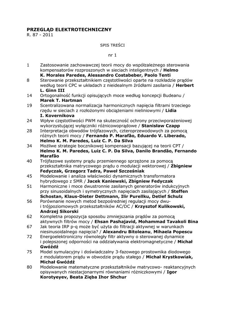 PRZEGLĄD ELEKTROTECHNICZNY R. 87 - 2011 SPIS TREŚCI nr 1 1 8 14 19 24 28 34 40 45 51 56 62 67 72 75 80 Zastosowanie zachowawczej teorii mocy do współzaleŜnego sterowania kompensatorów rozproszonych w sieciach inteligentnych / Helmo K. Morales Paredes, Alessandro Costabeber, Paolo Tenti Sterowanie przekształtnikiem częstotliwości oparte na rozkładzie prądów według teorii CPC w układach z nieidealnym źródłami zasilania / Herbert L. Ginn III Ortogonalność funkcji opisujących moce według koncepcji Budeanu / Marek T. Hartman Scentralizowana normalizacja harmonicznych napięcia filtrami trzeciego rzędu w sieciach z rozłoŜonymi obciąŜeniami nieliniowymi / Lidia I. Kovernikova Wpływ częstotliwości PWM na skuteczność ochrony przeciwporaŜeniowej wykorzystującej wyłączniki róŜnicowoprądowe / Stanisław Czapp Interpretacja obwodów trójfazowych, czteroprzewodowych za pomocą róŜnych teorii mocy / Fernando P. Marafão, Eduardo V. Liberado, Helmo K. M. Paredes, Luiz C. P. Da Silva MoŜliwe strategie bocznikowej kompensacji bazującej na teorii CPT / Helmo K. M. Paredes, Luiz C. P. Da Silva, Danilo Brandão, Fernando Marafão Trójfazowe systemy prądu przemiennego sprzęŜone za pomocą przekształtnika matrycowego prądu o modulacji wektorowej / Zbigniew Fedyczak, Grzegorz Tadra, Paweł Szcześniak Modelowanie i analiza właściwości dynamicznych transformatora hybrydowego z SMR / Jacek Kaniewski, Zbigniew Fedyczak Harmoniczne i moce dwustronnie zasilanych generatorów indukcyjnych przy sinusoidalnych i symetrycznych napięciach zasilających / Steffen Schostan, Klaus-Dieter Dettmann, Ilir Purellku, Detlef Schulz Porównanie nowych metod bezpośredniej regulacji mocy dwui trójpoziomowych przekształtników AC/DC / Krzysztof Kulikowski, Andrzej Sikorski Kompletna propozycja sposobu zmniejszania prądów za pomocą aktywnych filtrów mocy / Ehsan Pashajavid, Mohammad Tavakoli Bina Jak teoria IRP p-q moŜe być uŜyta do filtracji aktywnej w warunkach niesinusoidalnego napięcia? / Alexandru Bitoleanu, Mihaela Popescu Energoelektroniczny równoległy filtr aktywny o sterowanej dynamice i polepszonej odporności na oddziaływania elektromagnetyczne / Michał Gwóźdź Model symulacyjny i doświadczalny 3-fazowego prostownika diodowego z modulatorem prądu w obwodzie prądu stałego / Michał Krystkowiak, Michał Gwóźdź Modelowanie matematyczne przekształtników matrycowo- reaktancyjnych opisywanych niestacjonarnymi równaniami róŜniczkowymi / Igor Korotyeyev, Beata Zięba Ihor Shchur 85 91 96 101 107 112 118 123 129 130 134 137 140 144 147 153 159 165 168 173 177 Ocena kompatybilności elektromagnetycznej i sprawności systemu regulacji obciąŜenia PSMG w elektrowniach wiatrowych / Igor Korotyeyev, Beata Zięba Właściwości dynamiczne energetycznego filtru hybrydowego z filtrem pasywnym dla jednej harmonicznej / Dawid Buła, Marian Pasko Układ sterowania energetycznym filtrem aktywnym z zastosowaniem zmodyfikowanego algorytmu opartego na teorii mocy chwilowej / Krzysztof Piotr Sozański Kompensator Fryzego a transformacja Fortescue / Iurii a. Sirotin Zastosowanie zmienności napięć i prądów w lokalizacji odbiorników niespokojnych zasilanych z sieci elektroenergetycznej / Przemysław Otomański, Grzegorz Wiczyński Poprawa współczynnika mocy filtrami bezstratnymi w warunkach nieliniowych i niesinusoidalnych / Dunstano del Puerto-Flores, Romeo Ortega, Jacquelien M.A. Scherpen Sterowanie prostownika aktywnego metodą ograniczania biegunów systemu - porównanie z najnowszymi sposobami sterowania oraz jego zachowanie w warunkach zwarciowych / Carsten Heising, Martin Oettmeier, Volker Staudt , Andreas Steimel Wspomnienie o Profesorze Stanisławie Fryzem i refleksje nad Jego miejscem w teorii mocy / Leszek S. Czarnecki International School on Nonsinusoidal Currents and Compensation Analiza dokładności wyznaczania parametrów materiałów magnetycznie miękkich przy bardzo niskich częstotliwościach / Roman Gozdur, Andrzej Majocha System do pomiaru parametrów strumienia ciepła w układzie chłodzenia struktur półprzewodnikowych mocy / Jacek Gołębiowski, Roman Gozdur, Andrzej Majocha, Ewa Raj Ekstrakcja charakterystycznych cech sygnału elektrogastrograficznego przy wykorzystaniu transformaty falkowej / Zbigniew Świerczyński, Tomasz Guszkowski Śledzenie parametrów cyfrowych sygnałów sinusoidalnych z zastosowaniem filtrów adaptacyjnych / Krzysztof Duda Pojemnościowy przetwornik małych przesunięć / Janusz Janiczek Trójfazowy falownik quasi-Z do współpracy z baterią ogniw fotowoltaicznych - analiza symulacyjna i projekt / Jacek Rąbkowski, Mariusz Zdanowski, Henryk Supronowicz Analiza wielopoziomowego przekształtnika AC/DC/AC z kondensatorami o zmiennym potencjale zasilanego ze źródła jednofazowego / Sebastian Styński, Marian P. Kaźmierkowski, Dariusz Świerczyński Bezczujnikowe sterowanie generatorem klatkowym w stanach lotnego startu elektrowni wiatrowej / Janusz Szewczyk, Marek Adamowicz, Zbigniew Krzemiński Uogólniony model filtru parametrycznego drugiego rzędu / Janusz Walczak, Anna Piwowar Wybrane zagadnienia dokładności modelowania numerycznego indukcyjnych układów grzejnych / Marcin Wesołowski, Ryszard Niedbała, Adam Czaplicki, Jacek Hauser Obwody elektryczne modelujące procesy korozji elektrochemicznej warstw niklowych i kompozytowych na aluminium / Maria Trzaska Osobliwe oscylacje w układzie z unipolarnym samowzbudnym generatorem tarczowym / Zdzisław Trzaska 182 189 195 199 204 210 215 220 230 236 240 245 249 254 258 262 266 271 275 280 284 Zmniejszanie zafalowań momentu obrotowego w bezszczotkowych silnikach DC powstających przy komutacji fazy / Wael A. Salah, Dahaman Ishak, Khaleel J. Hammadi Wpływ ekscentryczności wirnika na szumy generowane w silnikach synchronicznych z magnesami trwałymi / Ali Rezig, Mohamed Rachid Mekideche, Abdesslem Djedir Transformatory probiercze, budowa, projektowanie i i