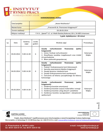 HARMONOGRAM KURSU Tytuł projektu „Nowe Możliwości” Nazwa kursu „Pracownik ds. finansowo-księgowych” Termin realizacji 03-28.03.2014 Miejsce realizacji F.H.U. „Speed” S.C. ul. Matki Boskiej Bolesnej 18 A, 34-600 Limanowa 1 godz. dydaktyczna = 45 minut Lp. 1 2 03.03.2014 04.03.2014 05.03.2014 Godziny zajęć 9.00-14.30 9.00-14.30 9.00-14.30 Liczba godzin Moduły zajęć Prowadzący 6 Zasady rachunkowości finansowej (pełna księgowość) 1. Istota i funkcje rachunkowości 2. Klasyfikacja zasobów majątkowych oraz źródeł ich pochodzenia 3. Bilans jednostki gospodarczej Katarzyna Majka 6 6 Zasady rachunkowości finansowej (pełna księgowość) 1. Podział i funkcjonowanie kont bilansowych 2. Sposoby poprawiania błędów księgowych 3. Zasady łączenia i dzielenia kont 4. Zasady funkcjonowania kont wynikowych 5. Ćwiczenia od bilansu początkowego do bilansu końcowego Zasady rachunkowości finansowej (pełna księgowość) 1. Ewidencja kosztów amortyzacji 2. Ewidencja kosztów zużycia materiałów i energii 3. Ewidencja kosztów usług obcych i podatków 4. Ewidencja kosztów wynagrodzeń i ubezpieczeń społecznych Katarzyna Majka Katarzyna Majka Strona 1 3 Data Projekt „Nowe Możliwości” współfinansowany przez Unię Europejską w ramach Europejskiego Funduszu Społecznego. Biuro projektu: ul. Barbackiego 57, 33-300 Nowy Sącz, tel.: (18) 475 16 15, e-mail: [email protected], www.irp-fundacja.pl/nowemozliwosci 5 6 7 07.03.2014 10.03.2014 11.03.2014 12.03.2014 9.00-14.30 9.00-14.30 9.00-14.30 9.00-14.30 9.00-14.30 6 6 6 6 6 Zasady rachunkowości finansowej (pełna księgowość) 1. Ewidencja przychodów operacyjnych 2. Ewidencja przychodów finansowych i zysków nadzwyczajnych 3. Pojęcie wyniku finansowego i metody jego ustalania, sporządzanie rachunku zysków i strat w wariancie kalkulacyjnym i porównawczym Zasady rachunkowości finansowej (pełna księgowość) 1. Ewidencja operacji gospodarczych od bilansu początkowego do bilansu końcowego – ćwiczenia utrwalające Ryczałt, karta podatkowa, księga przychodów i rozchodów (mała księgowość) 1. Rozliczenia podatkowe na zasadach ogólnych, ryczałtu i karty podatkowej 2. Procedura zakładania jednoosobowej działalności gospodarczej 3. Formy opodatkowania i ewidencji działalności gospodarczej w małych przedsiębiorstwach Ryczałt, karta podatkowa, księga przychodów i rozchodów (mała księgowość) 1. Zasady opodatkowania w formie, karty podatkowej, na zasadach ogólnych i przy ryczałcie ewidencjonowanym 2. Ewidencja dokumentów w księdze przychodów i w podatkowej księdze przychodów i rozchodów 3. Rejestry VAT, ewidencja wyposażenia, środków trwałych. 4. Deklaracje skarbowe i ZUS Katarzyna Majka Katarzyna Majka Katarzyna Majka Katarzyna Majka Katarzyna Majka Strona 8 06.03.2014 2 4 Zasady rachunkowości finansowej (pełna księgowość) 1. Ewidencja kosztów ze sprzedaży (WZ) 2. Ewidencja kosztów operacyjnych 3. Ewidencja kosztów finansowych i strat nadzwyczajnych 4. Ewidencja przychodów ze sprzedaży (Fa VAT) Projekt „Nowe Możliwości” współfinansowany przez Unię Europejską w ramach Europejskiego Funduszu Społecznego. Biuro projektu: ul. Barbackiego 57, 33-300 Nowy Sącz, tel.: (18) 475 16 15, e-mail: [email protected], www.irp-fundacja.pl/nowemozliwosci 11 12 13 14 14.03.2014 17.03.2014 18.03.2014 19.03.2014 20.03.2014 9.00-14.30 9.00-14.30 9.00-14.30 9.00-14.30 9.00-14.30 9.00-14.30 6 Katarzyna Majka 6 Warsztaty komputerowe – program Rewizor (pełna księgowość) 1. Dekretacja i księgowanie dowodów księgowych 2. Sporządzanie zestawienia obrotów i sald, dziennika księgowań 3. Sporządzanie rachunku zysków i strat, bilansu zamknięcia 4. Operacje na środkach trwałych (OT, LT, PK, PT) 5. Deklaracje skarbowe Katarzyna Majka 6 Warsztaty komputerowe – program Rewizor (pełna księgowość) 1. Dekretacja i księgowanie dowodów księgowych – ćwiczenia Katarzyna Majka 6 Warsztaty komputerowe – program Rewizor (pełna księgowość) 1. Dekretacja i księgowanie dowodów księgowych – ćwiczenia 2. Sporządzanie zestawienia obrotów i sald, dziennika księgowań 3. Sporządzanie rachunku zysków i strat, bilansu zamknięcia 4. Naliczanie amortyzacji środków trwałych i sporządzanie tabeli amortyzacyjnej Katarzyna Majka 6 6 Warsztaty komputerowe – program Rewizor (pełna księgowość) 1. Ćwiczenia utrwalające w programie Rewizor Warsztaty komputerowe – program Rachmistrz (mała księgowość) 1. Założenie firmy i konfiguracja parametrów 2. Założenie kartotek kontrahentów 3. Ewidencja kosztów i przychodów w KPiR 4. Operacje na środkach trwałych 5. Rejestry Vat, deklaracje skarbowe Katarzyna Majka Katarzyna Majka 3 10 13.03.2014 Strona 9 Warsztaty komputerowe – program Rewizor (pełna księgowość) 1. Założenie firmy i konfiguracja parametrów 2. Założenie kartotek kontrahentów 3. Sporządzanie planu kont i bilansu otwarcia 4. Dekretacja i księgowanie dowodów księgowych Projekt „Nowe Możliwości” współfinansowany przez Unię Europejską w ramach Europejskiego Funduszu Społecznego. Biuro projektu: ul. Barbackiego 57, 33-300 Nowy Sącz, tel.: (18) 475 16 15, e-mail: [email protected], www.irp-fundacja.pl/nowemozliwosci 15 16 17 18 19 20 21.03.2014 25.03.2014 25.03.2014 26.03.2014 27.03.2014 28.03.2014 9.00-14.30 9.00-14.30 9.00-14.30 9.00-14.30 9.00-14.30 9.00-14.30 6 6 6 6 6 6 Warsztaty komputerowe – program Rachmistrz (mała księgowość) 1. Ewidencja kosztów i przychodów w KPiR – ćwiczenia 2. Operacje na środkach trwałych Warsztaty komputerowe – program Rachmistrz (mała księgowość) 1. Ćwiczenia utrwalające w programie Rachmistrz Warsztaty komputerowe – program Gratyfikant (kadry) 1. Założenie firmy i konfiguracja parametrów 2. Założenie kartotek pracowników 3. Sporządzanie umów o pracę 4. Naliczanie wynagrodzeń i sporządzanie listy płac 5. Deklaracje skarbowe Warsztaty komputerowe 
