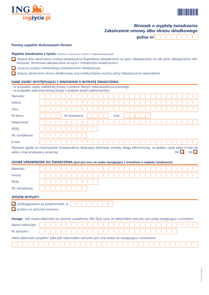 *C029* Wniosek o wypłatę świadczenia Zakończenie umowy albo okresu składkowego polisa nr ||||||| Prosimy wypełnić drukowanymi literami. Wypłata świadczenia z tytułu: (Prosimy o zaznaczenie znakiem X odpowiedniego pola) dożycia dnia zakończenia umowy ubezpieczenia (Kapitałowe ubezpieczenie na życie, Ubezpieczenie na całe życie, Ubezpieczenie młodzieżowe, Terminowe ubezpieczenie na życie z miesięcznym świadczeniem) zawarcia związku małżeńskiego (Ubezpieczenie młodzieżowe) dożycia zakończenia okresu składkowego oraz każdej kolejnej rocznicy polisy (Ubezpieczenie stypendialne) Dane osoby występującej z wnioskiem o wypłatę świadczenia - w przypadku osoby małoletniej proszę o podanie danych rodzica/opiekuna prawnego - w przypadku pełnomocnictwa proszę o podanie danych pełnomocnika Nazwisko ||||||||||||||||||||||||||||| Imiona ||||||||||||||||||||||||||||| Ulica ||||||||||||||||||||||||||||| Nr domu ||| Miejscowość ||||||||||||||||||||||||||||| PESEL |||||||||| Tel. kontaktowy E-mail ||||||||||||||||||||||||||||| Nr mieszkania ||| Kod |||| |||| |||| Wyrażam zgodę na otrzymywanie korespondencji dotyczącej złożonego wniosku drogą elektroniczną, na podany wyżej adres e-mail lub TAK NIE adres e-mail przekazany wcześniej. OSOBA UPRAWNIONA DO ŚWIADCZENIA (jeśli jest inna niż osoba występująca z wnioskiem o wypłatę świadczenia) Nazwisko ||||||||||||||||||||||||||||| Imiona ||||||||||||||||||||||||||||| PESEL |||||||||| Tel. kontaktowy |||| |||| Sposób wypłaty przeksięgowanie na polisę/wniosek nr ||||||| przelew na rachunek bankowy Uwaga: Jeśli nazwa właściciela nie zostanie uzupełniona, ING Życie uzna, że właścicielem rachunku jest osoba występująca z wnioskiem. Nazwa właściciela ||||||||||||||||||||||||||||| Nr rachunku ||||||||||||||||||||||||| Adres właściciela (uzupełnić tylko jeśli właścicielem rachunku jest inna osoba niż występująca z wnioskiem). |||||||||||||||||||||||||||||||||| R19/12.10.2012 r. Wymagane dokumenty1 urzędowy dokument potwierdzający tożsamość osoby uprawnionej do świadczenia; Ubezpieczenie młodzieżowe - w przypadku zawarcia związku małżeńskiego skrócony odpis aktu małżeństwa. oraz: • w przypadku, gdy z wnioskiem o wypłatę świadczenia występuje inna osoba niż osoba uprawniona do świadczenia wymagane jest przedstawienie dokumentu pełnomocnictwa do reprezentowania tej osoby; • rodzic/opiekun prawny składający wniosek o wypłatę świadczenia w imieniu osoby małoletniej jest zobowiązany do wykazania swojego uprawnienia do występowania w imieniu tej osoby (rodzic: skrócony odpis aktu urodzenia dziecka oraz oświadczenie o wykonywaniu pełnej władzy rodzicielskiej wobec małoletniego; opiekun prawny: zaświadczenie sądu opiekuńczego o ustanowieniu opiekunem). Dodatkowe informacje OSOBA WYSTĘPUJĄCA Z WNIOSKIEM Imię i nazwisko (czytelny podpis) PRZEDSTAWICIEL OSOBA UPRAWNIONA DO ŚWIADCZENIA (w przypadku wypełnienia wniosku w obecności Przedstawiciela) (jeśi jest inna niż osoba występująca z wnioskiem) Imię i nazwisko (czytelny podpis) Imię i nazwisko (czytelny podpis) ||||||| Nr Przedstawiciela Podpis Podpis Data Data || Nr Oddziału ||||| | || Nr telefonu Podpis Data 1 dołączyć oryginał lub kopię potwierdzoną za zgodność z oryginałem przez notariusza, organ wydający dany dokument lub osobę reprezentującą ING Życie. ING Towarzystwo Ubezpieczeń na Życie S.A.; ul. Topiel 12, 00-342 Warszawa; tel. +48 (22) 522 00 00, fax +48 (22) 522 11 11 Sąd Rejonowy dla m.st. Warszawy; XII Wydział Gospodarczy Krajowego Rejestru Sądowego KRS 25443; NIP: 527-10-02-574 Kapitał zakładowy - 41 000 000 zł, wpłacony w całości Drukuj Zapisz
