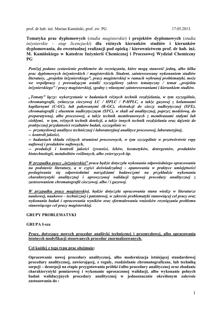 prof. dr hab. inż. Marian Kamiński, prof. zw. PG 17.05.2013. Tematyka prac dyplomowych (studia magisterskie) i projektów dyplomowych (studia inżynierskie – etap licencjacki) dla różnych kierunków studiów i kierunków dyplomowania, do ewentualnej realizacji pod opieką / kierownictwem prof. dr hab. inż. M. Kamińskiego w Katedrze Inżynierii Chemicznej i Procesowej Wydział Chemiczny PG Poniżej podano zestawienie problemów do rozwiązania, które mogą stanowić jedną, albo kilka prac dyplomowych inżynierskich / magisterskich. Student, zainteresowany wykonaniem studiów literatury, „projektu inżynierskiego”, pracy magisterskiej w ramach wybranej problematyki, może we współpracy z prowadzącym ustalić szczegółowy zakres tematyczny / temat „projektu inżynierskiego” / pracy magisterskiej, zgodny z własnymi zainteresowaniami i kierunkiem studiów. „Tematy” łączy: wykorzystanie w badaniach różnych technik rozdzielania, w tym szczególnie, chromatografii, zwłaszcza cieczowej LC / HPLC / P-HPLC, a także gazowej z kolumnami kapilarnymi (C-GC), lub pakowanymi (K-GC), ekstrakcji do cieczy nadkrytycznej (SFE), chromatografii z eluentem nadkrytycznym (SFC), w skali od analitycznej, poprzez modelową, do preparatywnej, albo procesowej, a także technik membranowych z membranami stałymi lub ciekłymi, w tym, różnych technik detekcji, a także innych technik rozdzielania oraz dążenie do praktycznej przydatności rezultatów badań, szczególnie w: -- przemysłowej analityce technicznej i laboratoryjnej analityce procesowej, laboratoryjnej, -- kontroli jakości, -- badaniach składu różnych strumieni procesowych, w tym szczególnie w przetwórstwie ropy naftowej i produktów naftowych, -- produkcji i kontroli jakości żywności, leków, kosmetyków, detergentów, produktów biotechnologii, metabolitów roślinnych, albo zwierzęcych itp. W przypadku pracy „inżynierskiej” praca będzie dotyczyła wykonania odpowiedniego opracowania na podstawie literatury, a w części doświadczalnej - opanowania w praktyce umiejętności posługiwania się odpowiednimi narzędziami badawczymi na przykładzie wykonania charakterystyki analitycznej i uproszczonej walidacji typowej procedury analitycznej z zastosowaniem chromatografii cieczowej, albo / i gazowej. W przypadku pracy magisterskiej, będzie dotyczyła opracowania stanu wiedzy w literaturze naukowej, naukowo – technicznej i patentowej, w zakresie problematyki stanowiącej cel pracy oraz wykonania badań i opracowania wyników oraz sformułowania wniosków rozwiązania problemu stanowiącego cel pracy magisterskiej. GRUPY PROBLEMATYKI GRUPA I-sza Prace, dotyczące nowych procedur analityki technicznej i przemysłowej, albo opracowania istotnych modyfikacji stosowanych procedur znormalizowanych. Cel każdej z tego typu prac obejmuje: Opracowanie nowej procedury analitycznej, albo modernizacja istniejącej standardowej procedury analitycznej, zawierającej, z reguły, rozdzielanie chromatograficzne, lub techniką sorpcji – desorpcji na etapie przygotowania próbki i/albo procedury analitycznej oraz zbadanie charakterystyki pomiarowej i wykonanie uproszczonej walidacji, albo wykonanie pełnych badań walidacyjnych procedury analitycznej w jednoznacznie określonym zakresie zastosowania do : 1 - - kontroli jakości / oceny określonej właściwości użytkowej produktu, laboratoryjnej analityki i kontroli procesowej, identyfikacji źródła pochodzenia materiału i/albo zastosowanych w produkcji procesów technologicznych, identyfikacji źródła skażenia środowiska naturalnego i metod rekultywacji, oznaczenia zawartości określonych składników, albo określonych rodzajów dodatków, określonych zanieczyszczeń, albo/i produktów metabolizmu – także na poziomie zawartości śladowych, w tym WWA, pestycydów, leków, konserwantów, plastyfikatorów, metali ciężkich itp., określenia stopnia i sposobu sfałszowania produktu, określenia stopnia degradacji oraz ewentualnej toksyczności produktu z wykorzystaniem co najmniej dwóch poniżej wymienionych technik rozdzielania oraz wybranych laboratoryjnych technik analityki procesowej, analityki technicznej, kontroli jakości: a b c d e f g NP HPLC / HILIC / RP-HPLC / GPC/SEC / IC / HIC - UV-DAD / FLD / RID / LC-FID / ELD, z przełączaniem kolumn oraz wykorzystaniem przepływu zwrotnego, z elucją stopniową, albo gradientową oraz oznaczaniem grawimetrycznym, albo/i instrumentalnym, w tym z wykorzystaniem chromatografii w skali analitycznej, albo/i preparatywnej, CGC, albo KGC – FID / TCD / ECD / FPD / NPD / o-FID, nD 70 / 15 / ρ 70 / 15 spektrofotometria UV-VIS, fluorescencja UV-VIS, TLC-FID – chromatografia cienkowarstwowa na pręcikach kwarcowych, z detekcją płomieniowo – jonizacyjną, H1-NMR niskiej częstotliwości spalania w tlenie / syntetycznym powietrzu / powietrzu / palniku wodorowym i oznaczania zawartości określonych produktów spalania różnymi technikami analitycznymi (mikrokulometria, IR, grawimetria, miareczkowanie), W celu oznaczania (w laboratorium przemysłowym, albo do realizacji określonych badań) : 1. zawartości grup węglowodorów oraz substancji polarnych (żywic), 2. zawartości grup metabolitów i określonych metabolitów, 3. zawartości tzw. wielopierścieniowych i/albo poli-cyklicznych węglowodorów aromatycznych (WWA/PCA), 4. rozkładu i średniej wartości masy molekularnej i liczby atomów węgla w materiałach, 5. zawartości określonych pierwiastków: wodoru, siarki, węgla, chlorowca organicznego i wybranych substancji chlorowco-organicznych, fosforu, azotu, wody, metali ciężkich, 6. zawartości zanieczyszczeń mineralnych, albo nierozpuszczalnych w określonym rozpuszczalniku (w tym zawartości asfaltenów), 7. zawartości wybranych organicznych substancji naturalnych, 8. zawartości wybranych organicznych substancji syntetycznych, 9. zawartości wybranych anionów nieorganicznych / organicznych, 