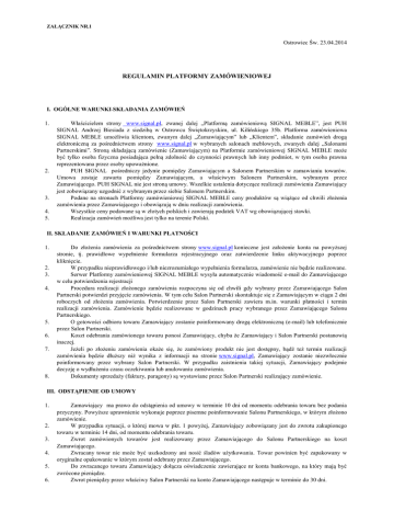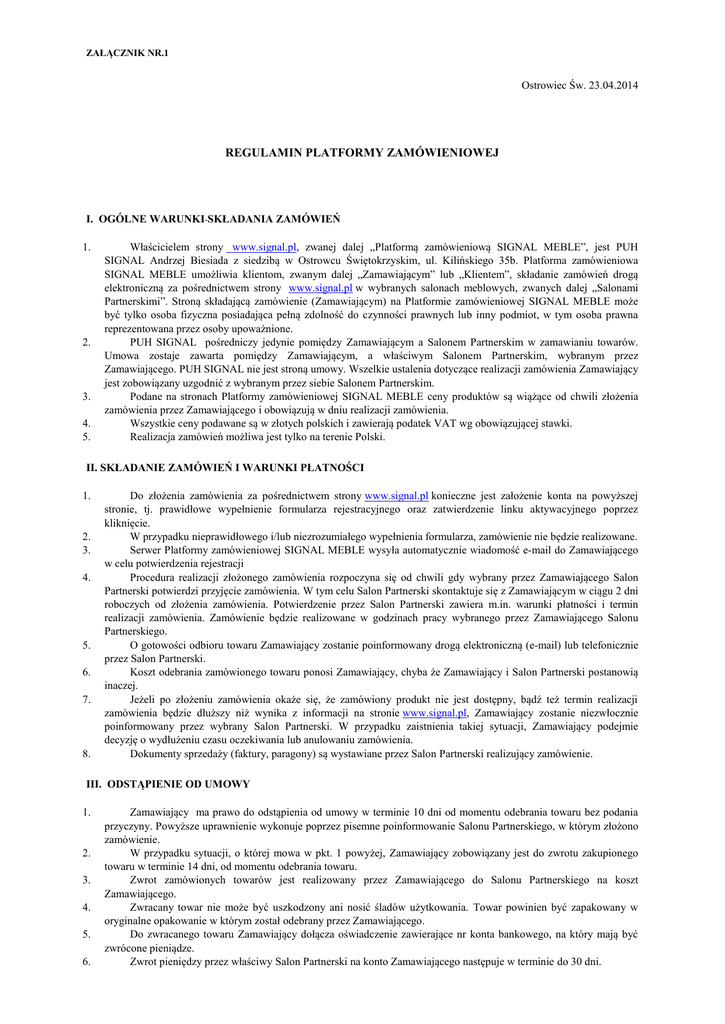 ZAŁĄCZNIK NR.1 Ostrowiec Św. 23.04.2014 REGULAMIN PLATFORMY ZAMÓWIENIOWEJ I. OGÓLNE WARUNKI SKŁADANIA ZAMÓWIEŃ 1. 2. 3. 4. 5. Właścicielem strony www.signal.pl, zwanej dalej „Platformą zamówieniową SIGNAL MEBLE”, jest PUH SIGNAL Andrzej Biesiada z siedzibą w Ostrowcu Świętokrzyskim, ul. Kilińskiego 35b. Platforma zamówieniowa SIGNAL MEBLE umożliwia klientom, zwanym dalej „Zamawiającym” lub „Klientem”, składanie zamówień drogą elektroniczną za pośrednictwem strony www.signal.pl w wybranych salonach meblowych, zwanych dalej „Salonami Partnerskimi”. Stroną składającą zamówienie (Zamawiającym) na Platformie zamówieniowej SIGNAL MEBLE może być tylko osoba fizyczna posiadająca pełną zdolność do czynności prawnych lub inny podmiot, w tym osoba prawna reprezentowana przez osoby upoważnione. PUH SIGNAL pośredniczy jedynie pomiędzy Zamawiającym a Salonem Partnerskim w zamawianiu towarów. Umowa zostaje zawarta pomiędzy Zamawiającym, a właściwym Salonem Partnerskim, wybranym przez Zamawiającego. PUH SIGNAL nie jest stroną umowy. Wszelkie ustalenia dotyczące realizacji zamówienia Zamawiający jest zobowiązany uzgodnić z wybranym przez siebie Salonem Partnerskim. Podane na stronach Platformy zamówieniowej SIGNAL MEBLE ceny produktów są wiążące od chwili złożenia zamówienia przez Zamawiającego i obowiązują w dniu realizacji zamówienia. Wszystkie ceny podawane są w złotych polskich i zawierają podatek VAT wg obowiązującej stawki. Realizacja zamówień możliwa jest tylko na terenie Polski. II. SKŁADANIE ZAMÓWIEŃ I WARUNKI PŁATNOŚCI 1. 2. 3. 4. 5. 6. 7. 8. Do złożenia zamówienia za pośrednictwem strony www.signal.pl konieczne jest założenie konta na powyższej stronie, tj. prawidłowe wypełnienie formularza rejestracyjnego oraz zatwierdzenie linku aktywacyjnego poprzez kliknięcie. W przypadku nieprawidłowego i/lub niezrozumiałego wypełnienia formularza, zamówienie nie będzie realizowane. Serwer Platformy zamówieniowej SIGNAL MEBLE wysyła automatycznie wiadomość e-mail do Zamawiającego w celu potwierdzenia rejestracji Procedura realizacji złożonego zamówienia rozpoczyna się od chwili gdy wybrany przez Zamawiającego Salon Partnerski potwierdzi przyjęcie zamówienia. W tym celu Salon Partnerski skontaktuje się z Zamawiającym w ciągu 2 dni roboczych od złożenia zamówienia. Potwierdzenie przez Salon Partnerski zawiera m.in. warunki płatności i termin realizacji zamówienia. Zamówienie będzie realizowane w godzinach pracy wybranego przez Zamawiającego Salonu Partnerskiego. O gotowości odbioru towaru Zamawiający zostanie poinformowany drogą elektroniczną (e-mail) lub telefonicznie przez Salon Partnerski. Koszt odebrania zamówionego towaru ponosi Zamawiający, chyba że Zamawiający i Salon Partnerski postanowią inaczej. Jeżeli po złożeniu zamówienia okaże się, że zamówiony produkt nie jest dostępny, bądź też termin realizacji zamówienia będzie dłuższy niż wynika z informacji na stronie www.signal.pl, Zamawiający zostanie niezwłocznie poinformowany przez wybrany Salon Partnerski. W przypadku zaistnienia takiej sytuacji, Zamawiający podejmie decyzję o wydłużeniu czasu oczekiwania lub anulowaniu zamówienia. Dokumenty sprzedaży (faktury, paragony) są wystawiane przez Salon Partnerski realizujący zamówienie. III. ODSTĄPIENIE OD UMOWY 1. 2. 3. 4. 5. 6. Zamawiający ma prawo do odstąpienia od umowy w terminie 10 dni od momentu odebrania towaru bez podania przyczyny. Powyższe uprawnienie wykonuje poprzez pisemne poinformowanie Salonu Partnerskiego, w którym złożono zamówienie. W przypadku sytuacji, o której mowa w pkt. 1 powyżej, Zamawiający zobowiązany jest do zwrotu zakupionego towaru w terminie 14 dni, od momentu odebrania towaru. Zwrot zamówionych towarów jest realizowany przez Zamawiającego do Salonu Partnerskiego na koszt Zamawiającego. Zwracany towar nie może być uszkodzony ani nosić śladów użytkowania. Towar powinien być zapakowany w oryginalne opakowanie w którym został odebrany przez Zamawiającego. Do zwracanego towaru Zamawiający dołącza oświadczenie zawierające nr konta bankowego, na który mają być zwrócone pieniądze. Zwrot pieniędzy przez właściwy Salon Partnerski na konto Zamawiającego następuje w terminie do 30 dni. IV. REKLAMACJE 1. 2. 3. 4. 5. W przypadku gdy po otrzymaniu zamówionego towaru Zamawiający wykryje wady fizyczne, Zamawiający ma prawo do złożenia reklamacji do Salonu Partnerskiego realizującego zamówienie. Podstawą do złożenia reklamacji jest pisemne zgłoszenie reklamacji do właściwego Salonu Partnerskiego, szczegółowo opisujące wady towaru. Zamawiający zobowiązany jest do dostarczenia na swój koszt wadliwego towaru do Salonu Partnerskiego, który zrealizował zamówienie wraz ze zgłoszeniem opisanym w pkt. 2 powyżej. Reklamacje będą rozpatrywane niezwłocznie, nie później niż w terminie 14 dni od dnia otrzymania zgłoszenia przez właściwy Salon Partnerski. Informacja o uznaniu lub nieuznaniu reklamacji zostanie przesłana Zamawiającemu na adres podany w zgłoszeniu reklamacyjnym. W przypadku uznania reklamacji Salon Partnerski skontaktuje się z Zamawiającym celem omówienia szczegółów. V. OCHRONA DANYCH OSOBOWYCH 1. 2. 3. 4. Zgodnie z ustawą z dnia 29 sierpnia 1997 roku o ochronie danych osobowych (tekst jednolity Dz. U. Nr 101 z 2002 r. poz. 926, z późn. zm.) dane osobowe Klientów są przechowywane w zbiorze danych PUH SIGNAL A. Biesiada , z siedzibą w Ostrowcu Św. ul. Kilińskiego 35b, 27-400 Ostrowiec Świętokrzyski oraz Salonów Partnerskich, które realizują zamówienie Dane osobowe zbierane są wyłącznie na potrzeby wystawiania dokumentów sprzedaży przez Salony Partnerskie. Dane osobowe nie będą udostępniane innym podmiotom w celach marketingowych. Każdy Klient ma prawo wglądu do swoich danych, poprawienia, żądania zaprzestania prz