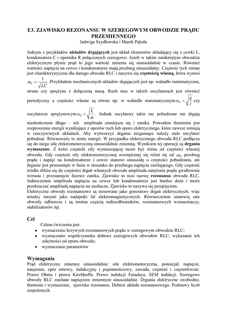 E3. ZJAWISKO REZONANSU W SZEREGOWYM OBWODZIE
