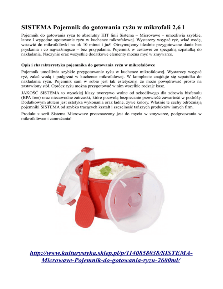 SISTEMA Pojemnik do gotowania ryżu w mikrofali 2,6 l Pojemnik do gotowania ryżu to absolutny HIT linii Sistema – Microvawe – umożliwia szybkie, łatwe i wygodne ugotowanie ryżu w kuchence mikrofalowej. Wystarczy wsypać ryż, wlać wodę, wstawić do mikrofalówki na ok 10 minut i już! Otrzymujemy idealnie przygotowane danie bez pryskania i co najważniejsze – bez przypalania. Pojemnik w zestawie ze specjalną szpatułką do nakładania. Naczynie oraz wszystkie dodatkowe elementy można myć w zmywarce. Opis i charakterystyka pojemnika do gotowania ryżu w mikrofalówce Pojemnik umożliwia szybkie przygotowanie ryżu w kuchence mikrofalowej. Wystarczy wsypać ryż, zalać wodą i podgrzać w kuchence mikrofalowej. W komplecie znajduje się szpatułka do nakładania ryżu. Pojemnik sam w sobie jest tak estetyczny, że może powędrować prosto na zastawiony stół. Oprócz ryżu można przygotować w nim wszelkie rodzaje kasz. JAKOŚĆ SISTEMA to wysokiej klasy tworzywo wolne od szkodliwego dla zdrowia bisfenolu (BPA free) oraz niezawodne zatrzaski, które pozwolą bezpiecznie przewieźć zawartość w podróży. Dodatkowym atutem jest estetyka wykonania oraz ładne, żywe kolory. Właśnie te cechy odróżniają pojemniki SISTEMA od szybko tracących kształt i szczelność tańszych produktów innych firm. Produkt z serii Sistema Microwave przeznaczony jest do mycia w zmywarce, podgrzewania w mikrofalówce i zamrażania! http://www.kulturystyka.sklep.pl/p/1140858038/SISTEMAMicrowave-Pojemnik-do-gotowania-ryzu-2600ml/ • • • • • • • • Cechy produktu: Pojemność (l): 2,6 Wysokość (mm): 164 Szerokość (mm): 216 Długość (mm): 216 Waga (kg): 0,32 Kolor: czerwony SERIA: MICROWAVE Jak przygotować ryż w garnku Sistema? Kupując produkt Sistema Microwave Rice Streamer, czyli pojemnik do gotowania ryżu w mikrofalówce otrzymasz ulotkę ze szczegółowymi wytycznymi w jaki sposób ugotować ryż. Ugotowanie ryżu w pojemniku Sistema jest banalnie proste! Wystarczy wsypać ryż, zalać wodą i włożyć na ok. 10 minut pojemnik do kuchenki mikrofalowej i już! Gotowe! Sposób przygotowania - instrukcja gotowania w pojemniku Sistema: Typ ziarna Waga Ilość wody Czas gotowania - moc mikrofali 800-900W Ryż biały 250 g 50-600 ml 8-12 min. Quinoa - komosa ryżowa 240 g 500-600 ml 11-15 min. Polenta 200 g 600-700 ml 3-5 min. Kasza kus kus 255 g 600-700 ml 3-5 min. Sistema - system innowacyjnych pojemników na żywność. Prosto z Nowej Zelandii. Sistema to marka innowacyjnych pojemników do żywności projektowanych i produkowanych w Nowej Zelandii. Marka Sistema® powstała 30 lat temu i jej produkty cieszą się ogromnym powodzeniem, szybko stając się domową ikoną, a tym samym zdobywając serca klientów i półki kuchennych szafek w milionach domów na świecie. Nasze produkty wyróżniają się nowatorskimi rozwiązaniami, oryginalnymi wzorami i kształtami a także żywymi kolorami. Plastikowe pojemniki na żywność Sistema, w tym Pojemnik do gotowania ryżu w kuchence mikrofalowej są wolne od BPA Wśród konsumentów rośnie obawa, związana z chemikaliami, a w szczególności BPA - który to związek chemiczny może spowodować skażenie lub zanieczyszczenie przechowywanej żywności lub napojów. Pojemniki oraz butelki firmy Sistema zawierają oznaczenie "BPA Free" co oznacza że są wyprodukowane z materiałów wolnych od BPA lub ołowiu oraz ww związki nie były użyte na żadnym z etapów produkcji produktów firmy Sistema. www.kulturystyka.sklep.pl