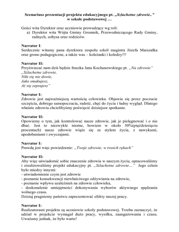 Scenariusz prezentacji projektu edukacyjnego pt. „Szlachetne zdrowie..” w szkole podstawowej … Gości wita Dyrektor oraz uczniowie prowadzący wg roli: a) Dyrektor wita Wójta Gminy Gromnik, Przewodniczącego Rady Gminy, radnych, sołtysa oraz rodziców. Narrator I: Serdecznie witamy pana dyrektora zespołu szkół magistra Józefa Marszałka oraz grono pedagogiczne, a także was – koleżanki i koledzy!!! Narrator II: Przyświecać nam dziś będzie fraszka Jana Kochanowskiego pt. „Na zdrowie” „Szlachetne zdrowie, Nikt się nie dowie, Jako smakujesz, Aż się zepsujesz” Narrator I: Zdrowie jest najważniejszą wartością człowieka. Objawia się przez poczucie szczęścia, dobrego samopoczucia, radość, chęć do życia i ładny wygląd. Dlatego właśnie zdrowiu chcielibyśmy poświęcić dzisiejsze spotkanie. Narrator II: Opowiemy o tym, jak kontrolować nasze zdrowie, jak je pielęgnować i o nie dbać. Jest to niezwykle istotne, bowiem w około 50%(pięćdziesięciu procentach) nasze zdrowie wiąże się ze stylem życia, z nawykami, upodobaniami i zwyczajami. Narrator I: Prawdą jest więc powiedzenie: „Twoje zdrowie, w twoich rękach” Narrator II: Aby więc uświadomić sobie znaczenie zdrowia w naszym życiu, opracowaliśmy i zrealizowaliśmy projekt edukacyjny pt. „Szlachetne zdrowie…” Jego celem było miedzy innymi: - uświadomienie czym jest zdrowie - poznanie konsekwencji niewłaściwego odżywiania na zdrowie, - poznanie wpływu uzależnień na zdrowie człowieka, - doskonalenie umiejętności dokonywania wyborów aktywnego spędzania wolnego czasu. Dzisiaj pragniemy państwu zaprezentować efekty naszej pracy. Narrator I: Realizatorami projektu są uczniowie szkoły podstawowej. Trzeba zaznaczyć, że udział w projekcie wymagał dużo pracy, wysiłku, zaangażowania i czasu. Uważamy jednak, że było warto! Narrator II: Wszystkie podjęte działania uświadomiły nam wartość zdrowia i zapewne pozostaną w naszej pamięci. Narrator I: Czym jest zdrowie? Zastanówmy się od czego ono zależy. Inscenizacja po angielsku: Pociąg z napisem zdrowie – „Health”, na wagonach widnieją napisy, które informują co należy robić aby je zachować. Narrator II: A więc wiemy już jakie czynniki mają wpływ na nasze zdrowie. Zobaczmy w takim razie jaki jest wpływ sposobu naszego żywienia na rozwój i funkcjonowanie naszego organizmu. Narrator I: Powiedzą nam o tym uczniowie klasy V w inscenizacji pt. „Jak jadasz takie zdrowie posiadasz” Inscenizacja klasy V „Jak jadasz takie zdrowie posiadasz” Narrator II: A oto, jaki najzdrowszy jadłospis dla ucznia proponują sami uczniowie. Uczeń odczytuje ten jadłospis z przedstawianej prezentacji multimedialnej JADŁOSPIS DLA UCZNIA Do prawidłowego rozwoju i nauki uczeń potrzebuje: wapnia, by jego kości były mocne; białek do prawidłowego wzrostu; fluoru do ochrony przed próchnicą; kwasów tłuszczowych, by zapewnić prawidłowy rozwój mózgu; żelaza, by uniknąć zmęczenia; witaminy D, która ułatwia przyswajanie fosforu i wapnia; a także witamin: A, C, B, E, by wzmocnić system odpornościowy. Dlatego na śniadanie dietetycy proponują: Jogurt z dodatkiem płatków kukurydzianych lub owsianych. Jogurt zaspokoi zapotrzebowanie na białko, żelazo, wapń, krwiotwórczą witaminę B12 i aminokwasy, dzięki którym prawidłowo funkcjonuje układ nerwowy. Do tego owoc np. banan. Do tornistra pakujemy kanapkę z pełnowartościowego razowego pieczywa z ziarnami zbóż z sałatą zieloną, wędliną najlepiej drobiową i pomidorem oraz owoc, na przykład jabłko. Na obiad proponuje się: zupę jarzynową oraz ziemniaki, surówkę z kiszonej kapusty, w skład której wchodzą witaminy: A, B, C, E, a także selen i cynk. To mur obronny dla mózgu. Do tego ryba, najlepiej morska, np. makrela czy dorsz bo chroni ona system nerwowy i mózg. Zawiera niezbędną dla komórek nerwowych witaminę A oraz witaminy z grupy B (B2, B3, B5, B6 i B12), które chronią układ nerwowy. Warto wypić również kompot z owoców. Na podwieczorek najlepsze będą sezonowe owoce: gruszki, jabłka, brzoskwinie, morele, jagody, czarne porzeczki. Wszystkie są zdrowe. Zawierają dużą dawkę witamin, które wzmacniają odporność organizmu na różne choroby, między innymi na przeziębienie. Kolacja musi być lekkostrawna, by uczeń po dniu pełnym wrażeń mógł zasnąć spokojnym snem. Kromki pieczywa razowego z dżemem oraz kakao. Zawierają cukry oraz białka. Przez cały dzień jako przekąskę można jeść orzechy, są bowiem cennym źródłem witaminy E. Wzmacniają pamięć i koncentrację. Narrator I: W naszej szkole odbyły się konkursy: Literacki pt. „Żyjmy zdrowo”, poetycki, którego tematem było zdrowie oraz konkurs wiedzy o zdrowiu. Prosimy Pana Dyrektora o rozdanie zwycięzcom dyplomów i nagród. podkład muzyczny Narrator II: Oto wiersze, które zdobyły najwyższe miejsca w konkursie na własny wiersz o zdrowie Recytacja wierszy przez uczniów Piosenka „OGÓREK” Narrator I: Wszyscy wiemy jak ważne w naszej diecie są owoce i warzywa, dlatego postanowiliśmy przygotować sałatkę. A, że języki obce wcale obce nam nie są – posłuchajcie i popatrzcie. Uczniowie przygotowują sałatkę Narrator II: Sami wiemy, jest wielu przeciwników jedzenia, szczególnie wśród najmłodszych naszych kolegów, dlatego klasa I przygotowała prezentację, w której przedstawi jak zrobić „Śniadanie dla Władka-Niejadka” – popatrzmy. Prezentacja multimedialna pt. „Śniadanie dla Władka-Niejadka” Narrator I: O tym jak ważna jest dla zdrowia higiena – spróbują nas o tym przekonać pierwszaki. Piosenka „Czyścioszek – Krakowiaczek” Narrator II: „Lepiej zapobiegać niż leczyć” – mówi stare porzekadło. Wiemy, że aby przeciwdziałać chorobom, należy podjąć walkę z zarazkami. Wiemy, że takiej walki nie możemy podejmować na własną rękę, bez konsultacji z lekar