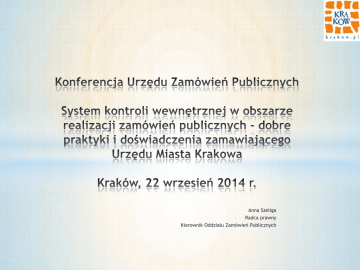 Anna Szeliga Radca prawny Kierownik Oddziału Zamówień Publicznych Problem nadmiernej dynamiki zmian ustawy prawo zamówień publicznych – trochę statystyki. Aktualnie uchwalony przez Sejm projekt zmiany ustawy jest dziewiątą nowelizacja ustawy od dnia 9 sierpnia 2013 r. tj. dnia ogłoszenia przez Marszałka Sejmu jej tekstu jednolitego. Ustawa była dotąd nowelizowana ponad 40 razy, blisko 20 razy w ciągu ostatnich czterech lat. Trwają prace nad kolejnymi nowelizacjami ustawy a jednocześnie nad generalnymi zmianami systemowymi w obszarze zamówień publicznych. Czy to mogą być jeszcze przepisy normatywnie jednoznaczne i spełniające standardy dobrego prawa? Problem nadmiernej dynamiki zmian ustawy pzp c.d. * nazbyt reaktywny/ kazuistyczny charakter zmian, * pomijanie/ ignorowanie istnienia przepisów innych ustaw, * brak możliwości ukształtowania się i ustalenia linii orzeczniczej, * poważne przeszkody w ustaleniu właściwych praktyk stosowania przepisów (uzus), * potencjalne problemy w toku kontroli (np. w trakcie kompleksowej kontroli RIO obejmującej cztery lata działalności jst), * trudności w poprawnej identyfikacji możliwości/ dopuszczalnego zakresu zmiany umowy. Zarządzanie zmianą a system kontroli wewnętrznej Prawidłowo zorganizowany system kontroli wewnętrznej, wbudowany w całokształt jednostki sfp (zwłaszcza samokontrola), ma tę przewagę nad kontrolą zewnętrzną, iż zapewnia fachową i dogłębną znajomość kontrolowanych szczegółów, działa na bieżąco, systematycznie, na co dzień, gwarantuje ciągłość i zupełność badań, umożliwia przeprowadzanie wstępnych ocen przed podejmowaniem decyzji, eliminuje żywiołowość i przypadkowość w procesach zachodzących w jednostkach, ponadto wspomaga bieżące przenoszenie wiadomości i wzajemnych doświadczeń między pracownikami. System kontroli wewnętrznej Elementy kontroli zarządczej: − środowisko wewnętrzne, − cele i zarządzanie ryzykiem − mechanizmy kontroli, − informacja i komunikacja, − monitorowanie i ocena. Spojrzenie na ww. elementy w kontekście systemu udzielania zamówień publicznych funkcjonującego u Zamawiającego. System kontroli wewnętrznej − środowisko wewnętrzne, A. Przestrzeganie wartości etycznych B. Kompetencje zawodowe C. Struktura organizacyjna D. Delegowanie uprawnień System kontroli wewnętrznej środowisko wewnętrzne c.d. Pierwszym z elementów środowiska wewnętrznego jest przestrzeganie wartości etycznych. Osoby zarządzające i pracownicy nie tylko powinni być świadomi wartości etycznych przyjętych w jednostce, ale i przestrzegać ich przy wykonywaniu powierzonych sobie zadań. Brak takiej świadomości lub nieprzestrzeganie wartości etycznych może spowodować, iż zaprojektowane mechanizmy kontroli nie będą funkcjonować tak, jak powinny (np. procedury zamówień publicznych nie będą właściwie stosowane), a tym samym ryzyka nie będą prawidłowo zabezpieczone. System kontroli wewnętrznej Środowisko wewnętrzne c.d. − kompetencje zawodowe pożądane w komórkach odpowiedzialnych za udzielanie zamówień publicznych (merytoryczne i umiejętności miękkie), − struktura organizacyjna (przejrzyste zakresy obowiązków, uprawnień i odpowiedzialności), − delegowanie uprawnień (powierzanie) – odpowiednie do wagi podejmowanych decyzji. System kontroli wewnętrznej Cele i zarządzanie ryzykiem misja, określanie celów i zadań, monitorowanie i ocena ich realizacji, identyfikacja ryzyka, jego analiza a następnie reakcja na ryzyko. Świadoma partycypacja pracowników System kontroli wewnętrznej Mechanizmy kontroli dokumentowanie systemu kontroli zarządczej, nadzór (przywództwo), ochrona zasobów a szczególnie zasobów ludzkich, szczegółowe mechanizmy kontroli dotyczące operacji finansowych i gospodarczych (w tym dokumentowanie, autoryzacja, podział kluczowych obowiązków i weryfikacja), mechanizmy kontroli dotyczące systemów informatycznych. Świadoma partycypacja pracowników System kontroli wewnętrznej Informacja i komunikacja Bieżąca informacja (analiza orzecznictwa i piśmiennictwa), Komunikacja wewnętrzna (przeglądy zarządzania, przyjmowanie od pracowników info o bieżących problemach, regularne przeglądy archiwaliów i wyciąganie wniosków zarządczych, audyty w ramach ISO), Komunikacja zewnętrzna (szkolenia, konferencje, rezultaty kontroli). System kontroli wewnętrznej Informacja i komunikacja c.d. Relacje (dynamika relacji) oraz podział zadań i kompetencji pomiędzy komórką odpowiedzialną za procedurę udzielenia zamówienia a komórką merytoryczną odpowiedzialną za opis przedmiotu zamówienia, Decyzje o wyborze trybu innego niż podstawowy, w szczególności trybu zamówienia z wolnej ręki, Decyzje o zmianie zawartej umowy. System kontroli wewnętrznej Informacja i komunikacja c.d. Obsługa i wsparcie procesu planowania zamówień publicznych, procedowania udzielania zamówień publicznych, sprawozdawania i udzielania informacji publicznej o zamówieniach udzielonych poprzez narzędzia informatyczne, wykorzystywane jednak przez kompetentnego pracownika. System kontroli wewnętrznej Monitorowanie i ocena Monitorowanie systemu kontroli zarządczej (bieżące identyfikowanie problemów), Samoocena (także na poziomie szeregowych pracowników), Audyt wewnętrzny oraz kontrole zewnętrzne, Uzyskanie przez kierownika jednostki / kierownika zamawiającego racjonalnego zapewnienia o stanie kontroli zarządczej. System kontroli wewnętrznej a zewnętrzna weryfikacja poprawności jego działania INFORMACJA PUBLICZNA Urząd Miasta Krakowa został zwycięzcą Rankingu Przejrzystości Instytucji Publicznych w ramach projektu „Obywatelski monitoring realizacji prawa do informacji publicznej". W ogólnopolskim konkursie wzięły udział 102 instytucje. Wśród nich były m.in. Kancelaria Prezydenta RP i Premiera RP, ministerstwa, urzędy marszałkowskie i urzędy miasta na prawa