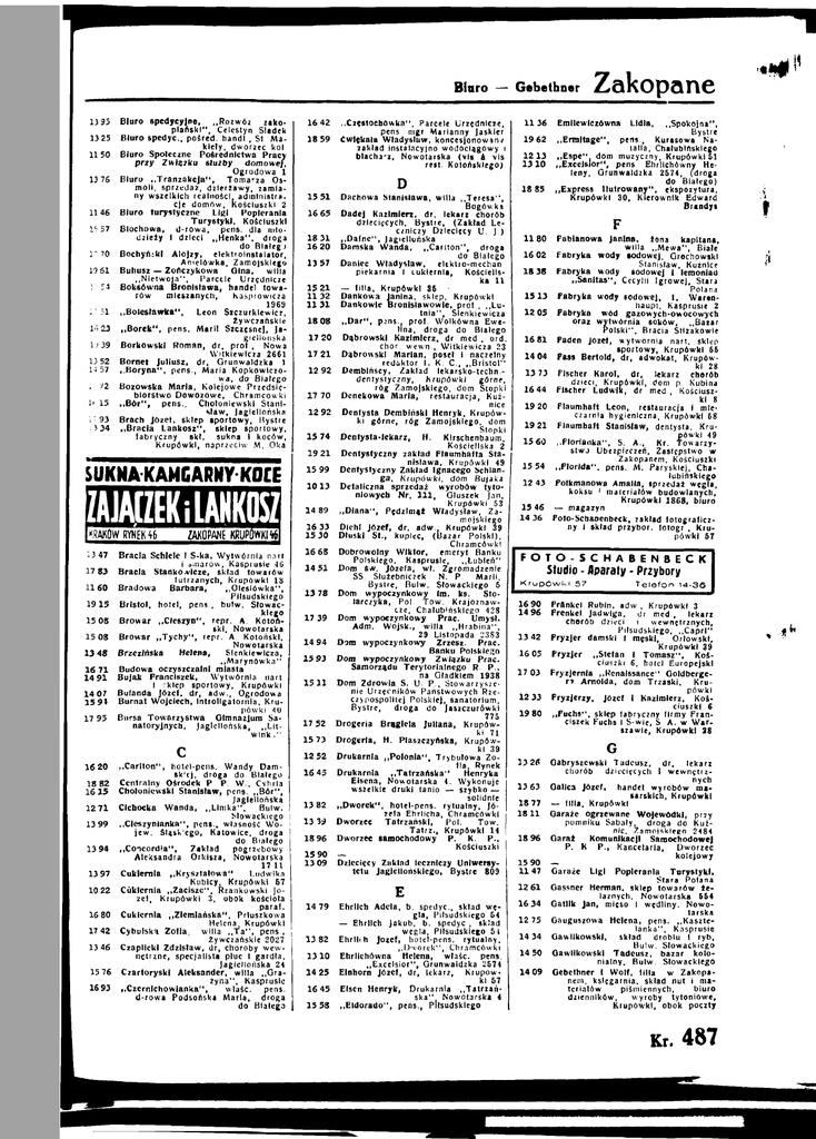 Biuro 1395 1325 1150 1376 1146 1557 1070 1961 17 54 17 51 1623 19 39 13 52 1457 15 72 1615 17 93 1334 Biuro spedycyjne, „Rozwoź zako piański", Celestyn Sladek Biuro spedyc, pośred. handl., St. Ma kiety, dworzec kol. Biuro Społeczne Pośrednictwa Pracy przy Związku służby domowej, Ogrodowa 1 Biuro „Tranzakcja", Tomasza Os moli, sprzedaż, dzierżawy, zamia ny wszelkich realności, administra cje domów, Kościuszki 2 Biuro turystyczne Ligi Popierania Turystyki, Kościuszki Blochowa, d-rowa, pens. dla mło dzieży 1 dzieci „Heńka", droga do Białego Bochyńikl Alojzy, elektrolnstalator, Anielówka, Zamojskiego Buhusz—ZoAczykowa Olna, willa „Nietwoja", Parcele Urzędnicze Boksówna Bronisława, handel towa rów mieszanych, Kasprowicza 1969 „Boleslawka", Leon Szczurkiewicz, Żywczańskle „Borek", pens. Marii Szczęsnej, Ja giellońska Borkowski Roman, dr. prol.. Nowa Witkiewicza 2661 Bornet Juliusz, dr, Grunwaldzka 1 „Boryna", pens., Maria Kopkowlczowa, do Białego Bozowska Maria, Kolejowe Przedsię biorstwo Dowozowe, Chramcówki „ B ó r " , pens., Chołoniewski Stani sław, jagiellońska Brach Józet, sklep sportowy. Bystre „Bracia Lankosz", sklep sportowy, fabryczny skł. sukna i koców, Krupówki, naprzeciw M. Oka 16 42 18 59 15 51 1665 18 31 16 20 13 57 15 21 1132 1131 18 08 17 20 17 21 12 92 17 70 12 92 15 74 19 21 SUKNA KAMGARMYKOCE ZAJĄCZEK i LANKOSZ | KRAKÓW RYNEK 46 13 47 17 83 1160 1915 15 08 15 08 13 48 16 71 14 91 14 07 15 94 17 95 ZAKOPANE KRUPÓWKI <ł6| Bracia Schlele I S-ka, Wytwórnia nart i smarów, Kasprusie 46 Bracia Stańko .vlcze, skład towarów futrzanych, Krupówki 18 Bradowa Barbara, „Olesiöwka", Piłsudskiego Bristol, hotel, pens., bulw. Słowac kiego Browar „Cieszyn", repr. A. Kotoń ski. Nowotarska Browar „Tychy", repr. A. Kotoński, Nowotarska Brzezińska Helena, Sienkiewicza, „Marynówka" Budowa oczyszczalni miasta Bujak Franciszek, Wytwórnia nart 1 rklep sportowy, Krupówki Bulanda Józet. dr, adw., Ogrodowa Burnat Wojciech, Introligatornia, Kru pówki 40 Bursa Towarzystwa Gimnazjum Sa natoryjnych, Jagiellońska, „Litwlnki" 15 99 1013 14 89 16 33 15 30 16 68 3451 13 78 17 39 14 94 1593 1511 17 52 15 73 16 20 18 82 16 15 1271 13 99 13 94 13 97 10 22 16 80 17 42 13 46 1576 1693 „Carlton", hotel-pens. Wandy Damsk'cj, droga do Białego Centralny Ośrodek P P. W., Cyhrla Chołoniewski Stanisław, pens. „ B ó r " , Jagiellońska Cichocka Wanda, „Llmka", Bulw. Słowackiego „Cieszynianka", pens., własność Wo jew. śląsk'ego, Katowice, droga do Białego „Concordia", Zakład pogrzebowy Aleksandra Orkisza, Nowotarska 17 11 Cukiernia „Kryształowa" Ludwika Kubicy. Krupówki 67 Cukiernia „Zacisze", Rzankowski Jó zef, Krupówki 3, obok kościoła paraf. Cukiernia „Ziemiańska", Prluszkowa Helena, Krupówki Cybulska Zolla, willa „ T a " , pens., Żywczańskle 2027 Czaplicki Zdzisław, dr, choroby wew nętrzne, specjalista płuc I gardła. Jagiellońska 24 Czartoryski Aleksander, willa „Gra żyna", Kasprusie „Czernlchowianka", wlaśc. pens. d-rowa Podsońska Marla, droga do Białego 12 52 16 45 13 82 13 39 18 96 1590 13 09 14 79 13 82 1310 14 25 16 45 15 58 — „Częstoehówka", Parcele Urzędnicze, pens mgr Marianny Jaskier ćwlękala Władysław, koncesjonowany zakład instalacyjno wodociągowy I blacharz. Nowotarska (vis a vis rest. Kotońskiego) Dachowa Stanisława, willa „Teresa", BogÓwka DadeJ Kazimierz, dr, lekarz chorób dziecięcych, Bystte, (Zakład Le czniczy Dziecięcy U. J.) „Dafne", jagiellońska Damska Wanda, „Carlton", droga do Białego Daniec Władysław, elektro-mechan piekarnia 1 cukiernia, Kościelis ka 1 1 — lilia, Krupówki 36 Dankowa Janina, sklep, Krupówki Dankowie Bronisławowie, prof., „Lu tnia", Sienkiewicza „ D a r " , pens., prof. Wolkówna Ewe lina, droga do Białego Dąbrowski Kazimierz, dr med., ord. chor. wewn., Witkiewicza 23 Dąbrowski Marian, poseł i naczelny redaktor I . K. C , „Bristol" Dembińscy, Zakład lekarsko-techn.dentystyczny, Krupówki górne, róg Zamojskiego, dom Stopki Denekowa Marla, restauracja, Kuź nice Dentysta Dembiński Henryk, Krupów ki górne, róg Zamojskiego, dom Stopki Denfysta-Iekarz, H. Klrschenbaum, Kościeliska 2 Dentystyczny zakład Flaumhafta Sta nisława, Krupówki 49 Dentystyczny Zakład Ignacego Schlanga, Krupówki, dom Bujaka Detaliczna sprzedaż wyrobów tyto niowych Nr. 111, Gluszek Jan, Krupówki 53 „Diana", Pędzlmął Władysław, Za mojskiego Diehl Józef, dr, adw.. Krupówki 39 Dłuski St., kupiec, (Bazar Polski), Chramcówki Dobrowolny Wiktor, emeryt Banku Polskiego, Kasprusie, „Lubień" Dom Sw. Józefa, wł. Zgromadzenie SS. Służebniczek N. P. Marli, Bystre, Bulw. Słowackiego 6 Dom wypoczynkowy Im, ks. Sto larczyka, Pol. Tow. Krajoznaw cze. Chałubińskiego 428 Dom wypoczynkowy Prac. Umysł. Adm. Wojsk., willa „Hrabina", 29 Listopada 2383 Dom wypoczynkowy Zrzesz. Prac. Banku Polskiego Dom wypoczynkowy Związku Prac. Samorządu Terytorialnego R. P , na Gładklem 1938 Dom Zdrowia S. U. P., Stowarzysze nie Urzędników Państwowych Rze czypospolitej Polskiej, sanatorium. Bystre, droga do Jaszczurówki 775 Drogeria Brąglela Juliana, Krupów ki 71 Drogeria, H. Plaszczyńska, Krupów ki 39 Drukarnia „Polonia", Trybulowa Zo ila, Rynek Drukarnia „Tatrzańska" Henryka Elsena, Nowotarska 4. Wykonuje wszelkie druki tanio — szybko — solidnie „Dworek", hotel-pens. rytualny, Jó zefa Ehrlicha, Chramcówki Dworzec Tatrzański, Pol. Tow. Tatrz., Krupówki 14 Dworzec samochodowy P. K. P., Kościuszki — Dziecięcy Zakład leczniczy Uniwersy tetu Jagiellońskiego, Bystre 809 Ehrlich Adela, b. spedyc, skład wę gla, Piłsudskiego 54 — Ehrlich Jakub, b. spedyc, skład węgla, Piłsudskiego 54 Ehrlit h Józef, hotel-pens. rytualny, ,,Dworek", Chramcówki Ehrlićhówna Helena, wlaśc. pens. „Excelsior", Grunwaldzka 2674 Einhorn Józef, dr, lekarz, Krupów ki 67 Eisen Henryk, Drukarnia „Tatrzań ska" N