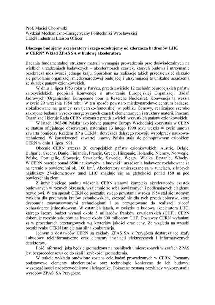 Prof. Maciej Chorowski Wydział Mechaniczno-Energetyczny Politechniki Wrocławskiej CERN Industrial Liaison Officer Dlaczego budujemy akceleratory i czego oczekujemy od zderzacza hadronów LHC w CERN? Wkład ZPAS SA w budowę akceleratora Badania fundamentalnej struktury materii wymagają prowadzenia prac doświadczalnych na wielkich urządzeniach badawczych – akceleratorach cząstek, których budowa i utrzymanie przekracza możliwości jednego kraju. Sposobem na realizacje takich przedsięwzięć okazało się powołanie organizacji międzynarodowej budującej i utrzymującej te unikalne urządzenia ze składek państw członkowskich. W dniu 1. lipca 1953 roku w Paryżu, przedstawiciele 12 zachodnioeuropejskich państw założycielskich, podpisali Konwencję o utworzeniu Europejskiej Organizacji Badań Jądrowych (Organisation Europeenne pour la Reserche Nucleaire). Konwencja ta weszła w życie 29 września 1954 roku. W ten sposób powstało międzynarodowe centrum badacze, zlokalizowane na granicy szwajcarsko-francuskiej w pobliżu Genewy, realizujące szeroko zakrojone badania wysoko energetycznych cząstek elementarnych i struktury materii. Pracami Organizacji kieruje Rada CERN złożona z przedstawicieli wszystkich państw członkowskich. W latach 1963-90 Polska jako jedyne państwo Europy Wschodniej korzystała w CERN ze statusu oficjalnego obserwatora, natomiast 13 lutego 1990 roku weszła w życie umowa zawarta pomiędzy Rządem RP a CERN i dotycząca dalszego rozwoju współpracy naukowotechnicznej. W konsekwencji zawartej umowy Polska stała się pełnoprawnym członkiem CERN w dniu 1 lipca 1991. Obecnie CERN zrzesza 20 europejskich państw członkowskich: Austrię, Belgię, Bułgarię, Czechy, Danię, Finlandię, Francję, Grecję, Hiszpanię, Holandię, Niemcy, Norwegię, Polskę, Portugalię, Słowację, Szwajcarię, Szwecję, Węgry, Wielką Brytanię, Włochy. W CERN pracuje ponad 6500 naukowców, a budynki i urządzenia badawcze rozlokowane są na terenie o powierzchni ok. 100 km2. Akceleratory umieszczane są w tunelach, z których najdłuższy 27-kilometrowy tunel LHC znajduje się na głębokości ponad 150 m pod powierzchnią ziemi. Z inżynierskiego punktu widzenia CERN stanowi kompleks akceleratorów cząstek budowanych w różnych okresach, wzajemnie ze sobą powiązanych i podlegających ciągłemu rozwojowi. W ten sposób CERN od początku swego powstania w roku 1954 stał się istotnym rynkiem dla przemysłu krajów członkowskich, szczególnie dla tych przedsiębiorstw, które dysponują zaawansowanymi technologiami i są przygotowane do realizacji zleceń o charakterze jednostkowym. W ostatnich latach, w związku z budową akceleratora LHC, którego łączny budżet wynosi około 5 miliardów franków szwajcarskich (CHF), CERN dokonuje rocznie zakupów na kwotę około 600 milionów CHF. Dostawcy CERN wyłaniani są w procedurach przetargowych wg kryteriów jakości oraz ceny. Ze względu na wysoki prestiż rynku CERN istnieje tam silna konkurencja. Jednym z dostawców CERN są zakłady ZPAS SA z Przygórza dostarczające szafy i obudowy teleinformatyczne oraz elementy instalacji elektrycznych i informatycznych detektorów. Ilość informacji jaka będzie gromadzona na nośnikach umieszczonych w szafach ZPAS jest bezprecedensowa co do skali i szybkości gromadzenia. W trakcie wykładu omówione zostaną cele badań prowadzonych w CERN. Poznamy podstawowe elementy akceleratorów oraz technologie konieczne do ich budowy, w szczególności nadprzewodnictwo i kriogenikę. Pokazane zostaną przykłady wykorzystania wyrobów ZPAS SA Przygórze.
