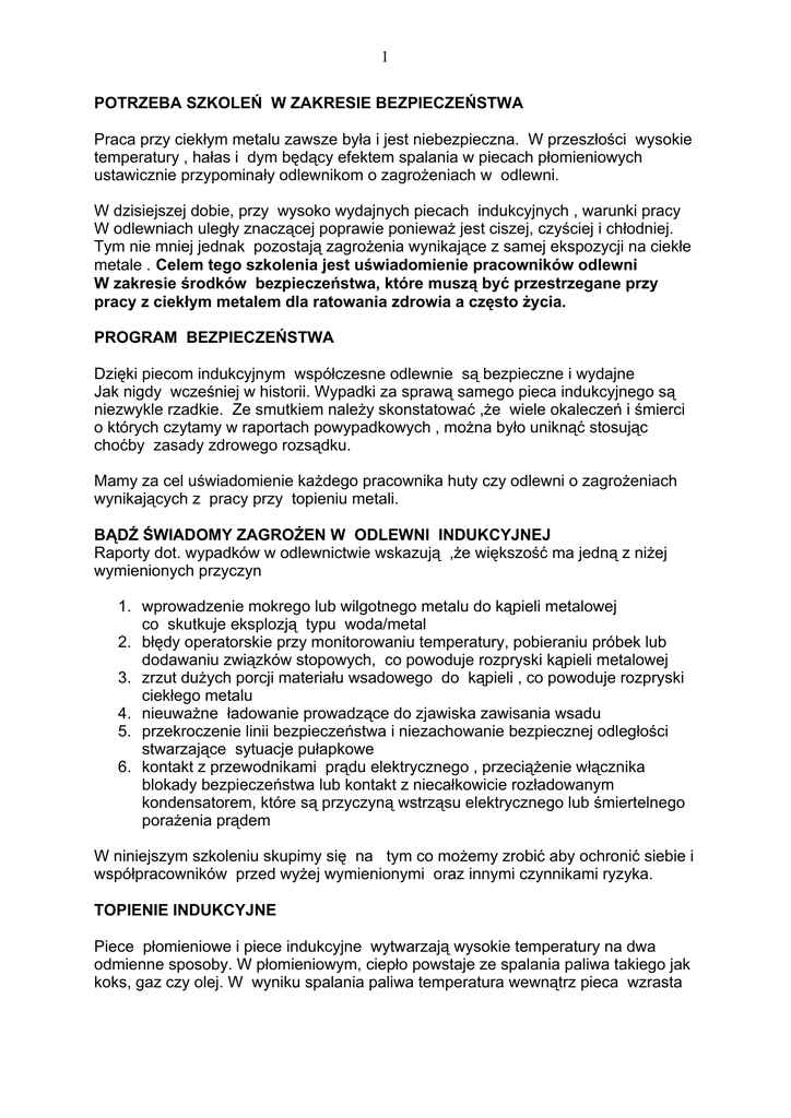 1 POTRZEBA SZKOLEŃ W ZAKRESIE BEZPIECZEŃSTWA Praca przy ciekłym metalu zawsze była i jest niebezpieczna. W przeszłości wysokie temperatury , hałas i dym będący efektem spalania w piecach płomieniowych ustawicznie przypominały odlewnikom o zagrożeniach w odlewni. W dzisiejszej dobie, przy wysoko wydajnych piecach indukcyjnych , warunki pracy W odlewniach uległy znaczącej poprawie ponieważ jest ciszej, czyściej i chłodniej. Tym nie mniej jednak pozostają zagrożenia wynikające z samej ekspozycji na ciekłe metale . Celem tego szkolenia jest uświadomienie pracowników odlewni W zakresie środków bezpieczeństwa, które muszą być przestrzegane przy pracy z ciekłym metalem dla ratowania zdrowia a często życia. PROGRAM BEZPIECZEŃSTWA Dzięki piecom indukcyjnym współczesne odlewnie są bezpieczne i wydajne Jak nigdy wcześniej w historii. Wypadki za sprawą samego pieca indukcyjnego są niezwykle rzadkie. Ze smutkiem należy skonstatować ,że wiele okaleczeń i śmierci o których czytamy w raportach powypadkowych , można było uniknąć stosując choćby zasady zdrowego rozsądku. Mamy za cel uświadomienie każdego pracownika huty czy odlewni o zagrożeniach wynikających z pracy przy topieniu metali. BĄDŹ ŚWIADOMY ZAGROŻEN W ODLEWNI INDUKCYJNEJ Raporty dot. wypadków w odlewnictwie wskazują ,że większość ma jedną z niżej wymienionych przyczyn 1. wprowadzenie mokrego lub wilgotnego metalu do kąpieli metalowej co skutkuje eksplozją typu woda/metal 2. błędy operatorskie przy monitorowaniu temperatury, pobieraniu próbek lub dodawaniu związków stopowych, co powoduje rozpryski kąpieli metalowej 3. zrzut dużych porcji materiału wsadowego do kąpieli , co powoduje rozpryski ciekłego metalu 4. nieuważne ładowanie prowadzące do zjawiska zawisania wsadu 5. przekroczenie linii bezpieczeństwa i niezachowanie bezpiecznej odległości stwarzające sytuacje pułapkowe 6. kontakt z przewodnikami prądu elektrycznego , przeciążenie włącznika blokady bezpieczeństwa lub kontakt z niecałkowicie rozładowanym kondensatorem, które są przyczyną wstrząsu elektrycznego lub śmiertelnego porażenia prądem W niniejszym szkoleniu skupimy się na tym co możemy zrobić aby ochronić siebie i współpracowników przed wyżej wymienionymi oraz innymi czynnikami ryzyka. TOPIENIE INDUKCYJNE Piece płomieniowe i piece indukcyjne wytwarzają wysokie temperatury na dwa odmienne sposoby. W płomieniowym, ciepło powstaje ze spalania paliwa takiego jak koks, gaz czy olej. W wyniku spalania paliwa temperatura wewnątrz pieca wzrasta 2 do poziomu wyższego niż temperatura topnienia materiału wsadowego w nim umieszczonego. Powoduje to rozgrzanie powierzchni materiału wsadowego, a następnie jego topienie. W piecach indukcyjnych ciepło wytwarzane jest w sposób czysty, bez spalania. Zmienny prąd elektryczny z indukcyjnego urządzenia zasilającego przepływa do pieca i przez cewkę w postaci miedzianego tunelu . Powstaje wówczas pole elektromagnetyczne, które przenika przez ogniotrwałe poszycie pieca do przewodzącego materiału wsadowego umieszczonego w jego wnętrzu. Wzbudzony prąd płynie przez materiał wsadowy wytwarzając wysoką temperaturę i powodując jego topienie . Topienie indukcyjne polega na bezpośrednim nagrzewaniu samego wsadu a nie pieca ( chociaż piec może ulec nagrzaniu stwarzając zagrożenie poparzenia). 2 rodzaje pieców indukcyjnych : bezrdzeniowe i tunelowe. ROZPRYSKI CIEKŁEGO METALU najbardziej oczywiste zagrożenie w odlewniach Mokre materiały wsadowe to najpoważniejsze zagrożenie we wszystkich odlewniach. Kiedy ciekły metal wejdzie w kontakt wodą, wilgocią lub zawierającym wodę materiałem , woda momentalnie zamienia się w parę powiększając swoją objętość 1600 razy i powodując gwałtowną eksplozję. Bez wcześniejszych sygnałów ostrzegawczych piec gwałtownie wyrzuca ciekły metal i kawałki rozgrzanego metalu stałego stwarzając zagrożenie dla pracujących tam ludzi, samego pieca, wyposażenia i pomieszczeń. Eksplozja typu woda /metal może mieć miejsce w każdego rodzaju odlewni , ale jej Skutki dla odlewni indukcyjnej mogą być poważniejsze , powstaje bowiem ryzyko dalszych eksplozji w wyniku kontaktu ciekłego metalu z wodą pochodzącą z uszkodzonego eksplozją systemu chłodzenia pieca. Przyczyną eksplozji nie musi być ciekły metal we wnętrzu pieca, ale np. zawierające wodę ,zaplombowane beczki metalowe , kontenery lub obustronnie zamknięte przewody rurowe , które załadowano do pustego ale rozgrzanego pieca. W takim przypadku siła eksplozji wyrzuci załadowany wsad I najprawdopodobniej spowoduje uszkodzenie poszycia pieca. Gwałtowana i trudna do przewidzenia natura eksplozji typu woda/metal sprawia, że noszenie ubrań ochronnych w odlewniach jest absolutnym nakazem , gdyż może zapobiec powodującym kalectwo lub śmierć poparzeniom. Usuwanie wilgoci z materiałów wtórnych W odlewniach, gdzie w większości przetapia się złom, mokry materiał wsadowy stanowi najpoważniejszy problem. Niektóre z odlewni starają się zapobiegać eksplozjom typu woda/ metal przechowując złom pod dachem przez co najmniej 3 dobę , a następnie skrupulatnie sprawdzając złomowane zamknięte pojemniki pod kątem pozostałości wilgoci. Jednak najbezpieczniejszym z możliwych rozwiązaniem , które stosowane jest w coraz większej liczbie odlewni , jest zdalna obsługa załadunku materiału wsadowego , który wcześniej poddano osuszaniu i podgrzaniu. Zdalne operowanie materiałem wsadowym pozwala operatorowi pozostać w bezpiecznej odległości od pieca lub za ekranem ochronnym podczas ładowania wsadu. Uprzednie poddanie materiału wsadowego osuszaniu i podgrzewaniu służy maksymalnie dokładnemu usunięciu z niego śladów wody i wilgoci. Zamknięte kontenery Łatwe do przeoczenia zagrożenie stanowią zaplombowane kontenery i zamknięte z obu stron przewody rurowe. Jest rzeczą oczywistą ,