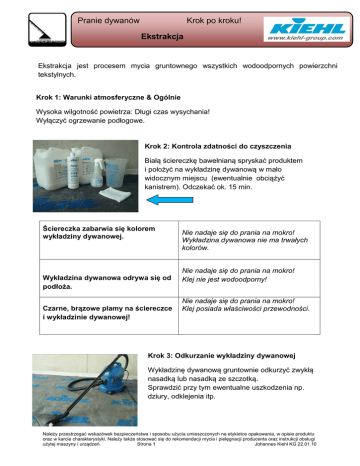 Pranie dywanów Krok po kroku! Ekstrakcja Ekstrakcja jest procesem mycia gruntownego wszystkich wodoodpornych powierzchni tekstylnych. Krok 1: Warunki atmosferyczne & Ogólnie Wysoka wilgotność powietrza: Długi czas wysychania! Wyłączyć ogrzewanie podłogowe. Krok 2: Kontrola zdatności do czyszczenia Białą ściereczkę bawełnianą spryskać produktem i położyć na wykładzinę dywanową w mało widocznym miejscu (ewentualnie obciążyć kanistrem). Odczekać ok. 15 min. Ściereczka zabarwia się kolorem wykładziny dywanowej. Wykładzina dywanowa odrywa się od podłoża. Czarne, brązowe plamy na ściereczce i wykładzinie dywanowej! Nie nadaje się do prania na mokro! Wykładzina dywanowa nie ma trwałych kolorów. Nie nadaje się do prania na mokro! Klej nie jest wodoodporny! Nie nadaje się do prania na mokro! Klej posiada właściwości przewodności. Krok 3: Odkurzanie wykładziny dywanowej Wykładzinę dywanową gruntownie odkurzyć zwykłą nasadką lub nasadką ze szczotką. Sprawdzić przy tym ewentualne uszkodzenia np. dziury, odklejenia itp. Należy przestrzegać wskazówek bezpieczeństwa i sposobu użycia umieszczonych na etykietce opakowania, w opisie produktu oraz w karcie charakterystyki. Należy także stosować się do rekomendacji mycia i pielęgnacji producenta oraz instrukcji obsługi użytej maszyny i urządzeń. Strona 1 Johannes Kiehl KG 22.01.10 Pranie dywanów Krok po kroku! Ekstrakcja Krok 4: Przygotowanie urządzenia ekstrakcyjnego Urządzenie ekstrakcyjne zmontować zgodnie z zaleceniami producenta i sprawdzić funkcjonalność. Krok 5: Dozowanie, przygotowanie roztworu roboczego Do wody należy wlać produkt czyszczący zgodnie z zaleceniami dozowania na etykietce. Zawsze stosować z zimną wodą! Krok 6: Ekstrakcja Włączyć silnik ssący/ kompresor urządzenia ekstrakcyjnego. Uruchomić dźwignię ekstraktora. Wykładzinę dywanową gruntownie spłukać, po czym zebrać brudną wodę prowadząc urządzenie równomiernie zachodzącymi na siebie torami. Po zakończeniu prania wykładzinę odkurzyć bez uruchomiania dźwigni ekstraktora, aby usunąć resztki wilgoci. W przypadku wzmożonej produkcji piany dolać kilka szpryc produktu Entschäumer do węża ssącego włączonego ekstraktora. Wskazówka! Za pomocą niskociśnieniowego zbiornika ekstraktora należy spryskać wcześniej powierzchnię roztworem roboczym, a następnie spłukać ją ekstraktorem i czystą wodą. Przedłużony czas działania roztworu roboczego na wykładzinę dywanową poprawia wyraźnie efekt czyszczenia. Krok 7: Podniesienie włosa wykładziny dywanowej Włos wykładzin welurowych podnieść miękką, czystą szczotką. Dywan pozostawić do wyschnięcia. . Krok 8: Czyszczenie narzędzi pracy Urządzenie do ekstrakcji dywanów opróżnić i wypłukać. Wytrzeć wewnątrz i na zewnątrz. Kabel wyczyścić ściereczką i sprawdzić pod kątem ewentualnych uszkodzeń. Należy przestrzegać wskazówek bezpieczeństwa i sposobu użycia umieszczonych na etykietce opakowania, w opisie produktu oraz w karcie charakterystyki. Należy także stosować się do rekomendacji mycia i pielęgnacji producenta oraz instrukcji obsługi użytej maszyny i urządzeń. Strona 2 Johannes Kiehl KG 22.01.10