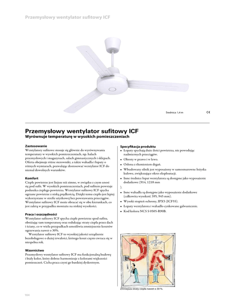 Przemysłowy wentylator sufitowy ICF Średnica: 1,4 m Przemysłowy wentylator sufitowy ICF Wyrównuje temperaturę w wysokich pomieszczeniach Zastosowanie Wentylatory sufitowe stosuje się głównie do wyrównywania temperatury w wysokich pomieszczeniach, np. halach przemysłowych i magazynach, salach gimnastycznych i sklepach. Oferta obejmuje różne sterowniki, a także wahadła i łopaty o różnych wymiarach, pozwalając dostosować wentylator ICF do niemal dowolnych warunków. Komfort Ciepłe powietrze jest lżejsze niż zimne, w związku z czym unosi się pod sufit. W wysokich pomieszczeniach, pod sufitem powstaje poduszka ciepłego powietrza. Wentylator sufitowy ICF spycha ogrzane powietrze z niską prędkością. Dzięki temu ciepło jest lepiej wykorzystane w strefie użytkowej bez powstawania przeciągów. Wentylator sufitowy ICF może obracać się w obu kierunkach, co jest zaletą w przypadku montażu na niskiej wysokości. Praca i oszczędności Wentylator sufitowy ICF spycha ciepłe powietrze spod sufitu, obniżając tam temperaturę oraz redukując straty ciepła przez dach i ściany, co w wielu przypadkach umożliwia zmniejszenie kosztów ogrzewania nawet o 30%. Wentylator sufitowy ICF to wysokiej jakości urządzenie bezobsługowe o dużej trwałości, którego koszt często zwraca się w niespełna rok. Specyfikacja produktu • Łopaty spychają duże ilości powietrza, nie powodując nadmiernych przeciągów. • Obroty w prawo i w lewo. • Osłona z tłumieniem drgań. • Wbudowany silnik jest wyposażony w samosmarowne łożyska kulowe, zwiększające okres eksploatacji. • Inne średnice łopat wentylatora są dostępne jako wyposażenie dodatkowe (914, 1218 mm ). • Inne wahadła są dostępne jako wyposażenie dodatkowe (całkowita wysokość 395, 945 mm). • Wysoki stopień ochrony, IPX5 (ICF55). • Łopaty wentylatora i wahadło cynkowane galwanicznie. • Kod koloru NCS S 0505-R90B. Wzornictwo Przemysłowy wentylator sufitowy ICF ma funkcjonalną budowę i biały kolor, który dobrze harmonizuje z kolorami większości pomieszczeń. Cicha praca czyni go bardziej dyskretnym. Zmniejsza straty ciepła nawet o 30 %. 104 Przemysłowy wentylator sufitowy ICF Dane techniczne | Typ Wentylator sufitowy ICF 3 Moc [W] Przepływ powietrza [m³/h] [V] [A] [mm] [kg] ICF20 70 13500 230V~ 0,33 545x1422 6,2 ICF55 70 13500 230V~ 0,33 545x1422 6,2 Napięcie Natężenie Wysokość x Ø Masa Stopień ochrony ICF20: (IPX0), budowa standardowa. Stopień ochrony ICF55: (IPX5), budowa bryzgoszczelna. Zatwierdzony przez IMQ i zgodny z CE. Wentylatory sufitowe Wymiary Montaż i podłączenie Wentylatory rozmieszcza się systematycznie w pomieszczeniu w jednakowych odstępach, zgodnie z poniższą tabelą, aby uzyskać jak najbardziej równomierną temperaturę. Aby dostosować wentylator do określonego pomieszczenia, należy sterować nim za pomocą regulatora prędkości. Zalecana odległość między wentylatorami Wysokość sufitu [m] 4 6 8 10 12 Odległość [m] 5 7 8 9 10 a a/2 a‘ a‘/2 Projekt i specyfikacje mogą ulec zmianie bez uprzedzenia. 105 a nik em . mi. ator . Przemysłowy wentylator sufitowy ICF Opcje sterowania Prędkość wentylatorów sufitowych należy regulować, aby uzyskać optymalne rozprzestrzenienie ciepła i zapobiegać przeciągom. Kierunek obrotów wentylatora można odwrócić do pracy latem. Modele CAR15 i CFR1R mają tę funkcję, a pozostałe wymagają przełącznika, który podłącza się szeregowo za sterowaniem, stosując kabel 4x1,5 mm². • CAR15, automatyczne sterowanie prędkością wentylatorów, dla maks. 15 wentylatorów, zmienne • CFR1R, sterowanie 5-stopniowe 1 wentylatorem, zmienne • RE5, sterowanie 5-stopniowe maks. 12 wentylatorami • PE1, płynne sterowanie prędkością maks. 2 wentylatorów. • PE2,5 - płynne sterowanie prędkością maks. 6 wentylatorów. Akcesoria Akcesoria CAR15 CFR1R CAR15, automatyczne sterowanie prędkością wentylatora Automatyczne sterowanie prędkością wentylatora przez czujnik zewnętrzny, odpowiednio do różnicy temperatur między sufitem i podłogą. Wbudowany przełącznik zmiany kierunku obrotów. Sterowanie maks. 15 wentylatorami. IP33. CFR1R, sterowanie 5-stopniowe Sterowanie 5-stopniowe. Wbudowany przełącznik zmiany kierunku obrotów. Sterowanie maks. 1 wentylatorem. IPX0. RE5, sterowanie 5-stopniowe Sterowanie 5-stopniowe. Sterowanie maks. 12 wentylatorami. IP54. RE5 PE1/PE2,5 CFAP200, krótkie wahadło Całkowita wysokość wentylatora 395 mm. CFAP750, długie wahadło Całkowita wysokość wentylatora 945 mm. CFB900, łopaty wentylatora Średnica wentylatora 914 mm. Kompletny zestaw 3 łopat wentylatora. CFB1200, łopaty wentylatora Średnica wentylatora 1 218 mm. Kompletny zestaw 3 łopat wentylatora. PE1/PE2,5 , płynny regulator prędkości wentylatora 1-fazowy tyrystorowy ręczny regulator do płynnej regulacji prędkości obrotów wentylatora oraz sterowania on/off.Regulator do montażu zewnętrznego (IP54) albo do wbudowania (IP44). PE1 może sterować maksymalnie 2 wentylatorami. PE2,5 może sterować maksymalnie 6 wentylatorami. Typ Opis WxSxG [mm] CAR15 Automatyczne sterowanie prędkością wentylatorów 210x210x100 CFR1R Sterowanie 5-stopniowe 1 wentylatorem 120x120x60 PE1 Płynny regulator prędkości do maks. 2 wentylatorów, montaż zewnetrzny (IP54) albo do wbudowania (IP44) 82x82x65 PE2,5 Płynny regulator prędkości do maks. 6 wentylatorów, montaż zewnętrzny (IP54) albo do wbudowania (IP44) 82x82x65 CAR15 Automatyczne sterowanie prędkością wentylatorów 210x210x100 RE5 Sterowanie 5-stopniowe 12 wentylatorami 200x105x105 CFAP200 Krótkie wahadło, całkowita wysokość 395 mm CFAP750 Długie wahadło, całkowita wysokość 945 mm CFB900 Łopaty wentylatora, średnica wentylatora 914 mm CFB1200 Łopaty wentylatora, średnica wentylatora 1 218 mm 106 Przemysłowy wentylator sufitowy ICF Schematy połączeń ICF Okablowanie sterowania prędkością wentylat