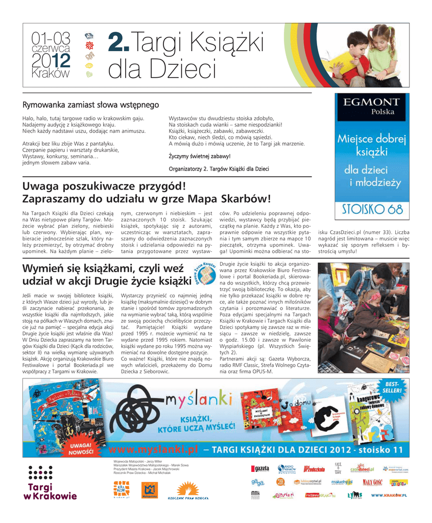 F]HUZFD .UDNöZ 7DUJL.VLÈĝNL GOD']LHFL Rymowanka zamiast słowa wstępnego Halo, halo, tutaj targowe radio w krakowskim gaju. Nadajemy audycję z książkowego kraju. Niech każdy nadstawi uszu, dodając nam animuszu. Atrakcji bez liku zbije Was z pantałyku. Czerpanie papieru i warsztaty drukarskie, Wystawy, konkursy, seminaria… jednym słowem zabaw varia. Wystawców stu dwudziestu stoiska zdobyło, Na stoiskach cuda wianki – same niespodzianki! Książki, książeczki, zabawki, zabaweczki. Kto ciekaw, niech śledzi, co mówią sąsiedzi. A mówią dużo i mówią uczenie, że to Targi jak marzenie. Życzymy świetnej zabawy! Organizatorzy 2. Targów Książki dla Dzieci Uwaga poszukiwacze przygód! Zapraszamy do udziału w grze Mapa Skarbów! Na Targach Książki dla Dzieci czekają na Was nietypowe plany Targów. Możecie wybrać plan zielony, niebieski lub czerwony. Wybierając plan, wybieracie jednocześnie szlak, który należy przemierzyć, by otrzymać drobny upominek. Na każdym planie – zielo- nym, czerwonym i niebieskim – jest zaznaczonych 10 stoisk. Szukając książek, spotykając się z autorami, uczestnicząc w warsztatach, zapraszamy do odwiedzenia zaznaczonych stoisk i udzielania odpowiedzi na pytania przygotowane przez wystaw- Wymień się książkami, czyli weź udział w akcji Drugie życie książki Jeśli macie w swojej bibliotece książki, z których Wasze dzieci już wyrosły, lub jeśli zaczynacie nabierać przekonania, że wszystkie książki dla najmłodszych, jakie stoją na półkach w Waszych domach, znacie już na pamięć – specjalna edycja akcji Drugie życie książki jest właśnie dla Was! W Dniu Dziecka zapraszamy na teren Targów Książki dla Dzieci (Kącik dla rodziców, sektor II) na wielką wymianę używanych książek. Akcję organizują Krakowskie Biuro Festiwalowe i portal Bookeriada.pl we współpracy z Targami w Krakowie. Wystarczy przynieść co najmniej jedną książkę (maksymalnie dziesięć) w dobrym stanie i spośród tomów zgromadzonych na wymianie wybrać taką, którą wspólnie ze swoją pociechą chcielibyście przeczytać. Pamiętajcie! Książki wydane przed 1995 r. możecie wymienić na te wydane przed 1995 rokiem. Natomiast książki wydane po roku 1995 można wymieniać na dowolne dostępne pozycje. Co ważne! Książki, które nie znajdą nowych właścicieli, przekażemy do Domu Dziecka z Sieborowic. :RMHZRGD0DïRSROVNL-HU]\0LOOHU 0DUV]DïHN:RMHZöG]WZD0DïRSROVNLHJR0DUHN6RZD 3UH]\GHQW0LDVWD.UDNRZD-DFHN0DMFKURZVNL 5]HF]QLN3UDZ']LHFND0LFKDï0LFKDODN ców. Po udzieleniu poprawnej odpowiedzi, wystawcy będą przybijać pieczątkę na planie. Każdy z Was, kto poprawnie odpowie na wszystkie pytania i tym samym zbierze na mapce 10 pieczątek, otrzyma upominek. Uwaga! Upominki można odbierać na stoDrugie życie książki to akcja organizowana przez Krakowskie Biuro Festiwalowe i portal Bookeriada.pl, skierowana do wszystkich, którzy chcą przewietrzyć swoją biblioteczkę. To okazja, aby nie tylko przekazać książki w dobre ręce, ale także poznać innych miłośników czytania i porozmawiać o literaturze. Poza edycjami specjalnymi na Targach Książki w Krakowie i Targach Książki dla Dzieci spotykamy się zawsze raz w miesiącu – zawsze w niedzielę, zawsze o godz. 15.00 i zawsze w Pawilonie Wyspiańskiego (pl. Wszystkich Świętych 2). Partnerami akcji są: Gazeta Wyborcza, radio RMF Classic, Strefa Wolnego Czytania oraz firma OPUS-M. isku CzasDzieci.pl (numer 33). Liczba nagród jest limitowana – musicie więc wykazać się sporym refleksem i bystrością umysłu! 2 2. Targi Książki dla Dzieci Od Cai Lun'a przez Gutenberga na Targi Spotkania z historią podczas 2. Targach Książki dla Dzieci? Dlaczego nie! Zapraszamy na Warsztaty czerpania papieru i Warsztaty drukarskie! Firma KALANDER, chcąc przybliżyć dawne rzemiosła, przygotowała dla zwiedzających 2. Targi Książki dla Dzieci prezentacje produkcji papieru czerpanego, jak to dawniej za Chińczyka Cai Lun'a bywało. By młoda dziatwa poznała trud rzemiosła, samemu próbując ciężkiej pracy papieru ręcznego czerpania, firma KALANDER trudu nie będzie żałowała, by kartka idealna powstała i by mogła ją dziatwa na pamiątkę zabrać. Ale co to za arkusz bez treści i znaków, by książka powstała trza liter i treści. Dlatego odbędzie się również prezentacja czarnej sztuki archaicznego druku, jak to za Gutenberga czasów bywało. Kto będzie odważny i sprytem się wykaże, pamiątkowy dyplom na prasie odciśnie, by pamięć o rzemiosłach i Targach Książki dla Dzieci pozostała, nie tylko w pamięci, ale i na papierze. Zapraszamy na stoisko nr 69. Wyjątkowe urodziny! Zapraszamy na przyjęcie urodzinowe, które odbędzie się pierwszego dnia Targów Książki dla Dzieci w sali seminaryjnej w godzinach 11:00-13:00. Program przyjęcia: przygotowanie i ozdobienie tortu dla Koziołka Matołka, tworzenie laurek i kartek urodzinowych, konkurs wiedzy o „Przygodach Koziołka Matołka”, wręczenie wcześniej przygotowanych laurek i podarunków dla Koziołka, przyjęcie urodzinowe, zabawy z Koziołkiem Matołkiem i z bajkowymi wróżkami. Jest bez wątpienia najsłynniejszym bajkowym obieżyświatem. Sympatyczny, nieco łatwowierny, czasem niezdarny, ale przede wszystkim dobrotliwie naiwny. Koziołek Matołek, kultowa postać polskiej bajki, zawita w czerwcu do Krakowa, by w trakcie 2. Targów Książki dla Dzieci świętować swoje 79. urodziny. Przed użyciem zgnieść! Lubisz podróżować? Masz mało miejsca w walizce? Mapy Crumpled City są dla Ciebie stworzone! Miasto, choć bywa dżunglą, jest dla ludzi. Mapa nie musi być nudna i brzydka – mówią nam projektanci – a korzystanie z niej może być świetną przygodą. I nawet jeśli trochę się sfrustrujesz, gubiąc kierunki, możesz zawsze „za karę” zmiąć tę mapę w kulkę – nie będzie miała nic przeciwko! Jak to możliwe? Odwiedź stoisko Creme de la