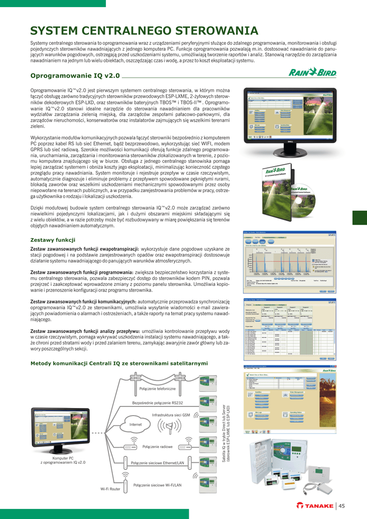 SYSTEM CENTRALNEGO STEROWANIA Systemy centralnego sterowania to oprogramowania wraz z urządzeniami peryferyjnymi służące do zdalnego programowania, monitorowania i obsługi pojedynczych sterowników nawadniających z jednego komputera PC. Funkcje oprogramowania pozwalają m.in. dostosować nawadnianie do panujących warunków pogodowych, ostrzegają przed uszkodzeniami systemu, umożliwiają tworzenie raportów i analiz. Stanowią narzędzie do zarządzania nawadnianiem na jednym lub wielu obiektach, oszczędzając czas i wodę, a przez to koszt eksploatacji systemu. Oprogramowanie IQ v2.0 Oprogramowanie IQ™v2.0 jest pierwszym systemem centralnego sterowania, w którym można łączyć obsługę zarówno tradycyjnych sterowników przewodowych ESP-LXME, 2-żyłowych sterowników dekoderowych ESP-LXD, oraz sterowników bateryjnych TBOS™ i TBOS-II™. Oprogramowanie IQ™v2.0 stanowi idealne narzędzie do sterowania nawadnianiem dla pracowników wydziałów zarządzania zielenią miejską, dla zarządców zespołami pałacowo-parkowymi, dla zarządców nieruchomości, konserwatorów oraz instalatorów zajmujących się wszelkimi terenami zieleni. Wykorzystanie modułów komunikacyjnych pozwala łączyć sterowniki bezpośrednio z komputerem PC poprzez kabel RS lub sieć Ethernet, bądź bezprzewodowo, wykorzystując sieć WIFI, modem GPRS lub sieć radiową. Szerokie możliwości komunikacji oferują funkcje zdalnego programowania, uruchamiania, zarządzania i monitorowania sterowników zlokalizowanych w terenie, z poziomu komputera znajdującego się w biurze. Obsługa z jednego centralnego stanowiska pomaga lepiej zarządzać systemem i obniża koszty jego eksploatacji, minimalizując konieczność częstego przeglądu pracy nawadniania. System monitoruje i rejestruje przepływ w czasie rzeczywistym, automatycznie diagnozuje i eliminuje problemy z przepływem spowodowane pękniętymi rurami, blokadą zaworów oraz wszelkimi uszkodzeniami mechanicznymi spowodowanymi przez osoby niepowołane na terenach publicznych, a w przypadku zarejestrowania problemów w pracy, ostrzega użytkownika o rodzaju i lokalizacji uszkodzenia. Dzięki modułowej budowie system centralnego sterowania IQ™v2.0 może zarządzać zarówno niewielkimi pojedynczymi lokalizacjami, jak i dużymi obszarami miejskimi składającymi się z wielu obiektów, a w razie potrzeby może być rozbudowywany w miarę powiększania się terenów objętych nawadnianiem automatycznym. Zestawy funkcji Zestaw zawansowanych funkcji ewapotranspiracji: wykorzystuje dane pogodowe uzyskane ze stacji pogodowej i na podstawie zarejestrowanych opadów oraz ewapotranspiracji dostosowuje działanie systemu nawadniającego do panujących warunków atmosferycznych. Zestaw zawansowanych funkcji programowania: zwiększa bezpieczeństwo korzystania z systemu centralnego sterowania, pozwala zabezpieczyć dostęp do sterowników kodem PIN, pozwala przejrzeć i zaakceptować wprowadzone zmiany z poziomu panelu sterownika. Umożliwia kopiowanie i przenoszenie konfiguracji oraz programu sterownika. Zestaw zawansowanych funkcji komunikacyjnych: automatycznie przeprowadza synchronizację oprogramowania IQ™v2.0 ze sterownikami, umożliwia wysyłanie wiadomości e-mail zawierających powiadomienia o alarmach i ostrzeżeniach, a także raporty na temat pracy systemu nawadniającego. Zestaw zawansowanych funkcji analizy przepływu: umożliwia kontrolowanie przepływu wody w czasie rzeczywistym, pomaga wykrywać uszkodzenia instalacji systemu nawadniającego, a także chroni przed stratami wody i przed zalaniem terenu, zamykając awaryjnie zawór główny lub zawory poszczególnych sekcji. Metody komunikacji Centrali IQ ze sterownikami satelitarnymi Połączenie telefoniczne Infrastruktura sieci GSM Internet Połączenie radiowe Komputer PC z oprogramowaniem IQ v2.0 Połączenie sieciowe Ethernet/LAN Satelita IQ w trybie Direct lub Server (sterownik ESP-LXME lub ESP-LXD) Bezpośrednie połączenie RS232 Połączenie sieciowe Wi-Fi/LAN Wi-Fi Router 45