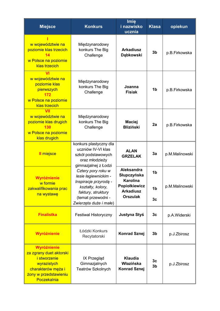 Miejsce I w województwie na poziomie klas trzecich 14 w Polsce na poziomie klas trzecich VI w województwie na poziomie klas pierwszych 172 w Polsce na poziomie klas trzecich VII w województwie na poziomie klas drugich 130 w Polsce na poziomie klas drugich II miejsce Wyróżnienie w formie zakwalifikowania prac na wystawę Imię i nazwisko ucznia Klasa opiekun Międzynarodowy konkurs The Big Challenge Arkadiusz Dąbkowski 3b p.B.Firkowska Międzynarodowy konkurs The Big Challenge Joanna Fisiak 1b p.B.Firkowska Międzynarodowy konkurs The Big Challenge Maciej Bliziński 2a p.B.Firkowska ALAN GRZELAK 3a p.M.Malinowski Konkurs konkurs plastyczny dla uczniów IV-VI klas szkół podstawowych oraz młodzieży gimnazjalnej z Łodzi Cztery pory roku w lesie łagiewnickim Inspiracje przyrodą kształty, kolory, faktury, struktury (temat przewodni Zwierzęta duże i małe) Aleksandra Słupczyńska Karolina Popiołkiewicz Arkadiusz Orszulak 1b 1b p.M.Malinowski 3c Finalistka Festiwal Historyczny Justyna Styś 3c p.A.Widerski Wyróżnienie Łódzki Konkurs Recytatorski Konrad Sznej 3b p.J.Zbirosz Wyróżnienie za zgrany duet aktorski i stworzenie wyrazistych charakterów męża i żony w przedstawieniu Poczekalnia IX Przegląd Gimnazjalnych Teatrów Szkolnych Klaudia Włazińska Konrad Sznej 3c 3b p.J.Zbirosz