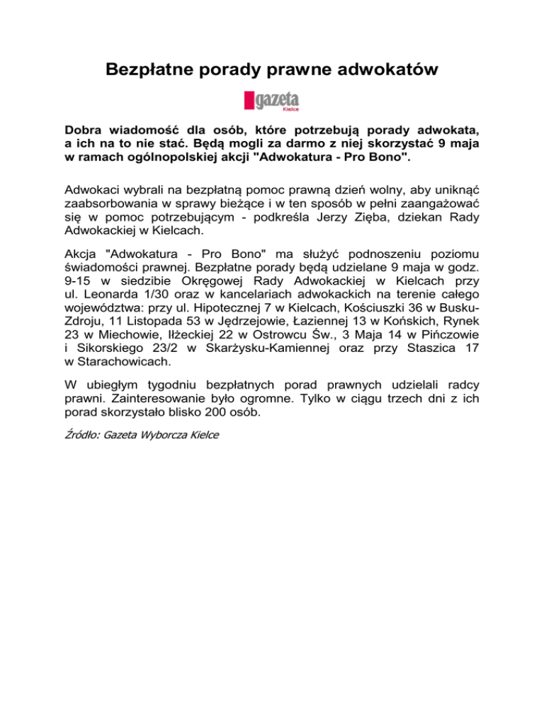 Bezpłatne porady prawne adwokatów Dobra wiadomość dla osób, które potrzebują porady adwokata, a ich na to nie stać. Będą mogli za darmo z niej skorzystać 9 maja w ramach ogólnopolskiej akcji "Adwokatura - Pro Bono". Adwokaci wybrali na bezpłatną pomoc prawną dzień wolny, aby uniknąć zaabsorbowania w sprawy bieżące i w ten sposób w pełni zaangażować się w pomoc potrzebującym - podkreśla Jerzy Zięba, dziekan Rady Adwokackiej w Kielcach. Akcja "Adwokatura - Pro Bono" ma służyć podnoszeniu poziomu świadomości prawnej. Bezpłatne porady będą udzielane 9 maja w godz. 9-15 w siedzibie Okręgowej Rady Adwokackiej w Kielcach przy ul. Leonarda 1/30 oraz w kancelariach adwokackich na terenie całego województwa: przy ul. Hipotecznej 7 w Kielcach, Kościuszki 36 w BuskuZdroju, 11 Listopada 53 w Jędrzejowie, Łaziennej 13 w Końskich, Rynek 23 w Miechowie, Iłżeckiej 22 w Ostrowcu Św., 3 Maja 14 w Pińczowie i Sikorskiego 23/2 w Skarżysku-Kamiennej oraz przy Staszica 17 w Starachowicach. W ubiegłym tygodniu bezpłatnych porad prawnych udzielali radcy prawni. Zainteresowanie było ogromne. Tylko w ciągu trzech dni z ich porad skorzystało blisko 200 osób. Źródło: Gazeta Wyborcza Kielce