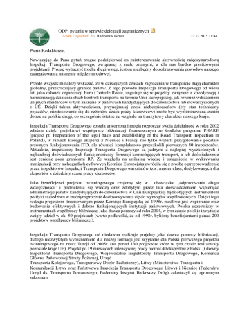 ODP: pytania w sprawie delegacji zagranicznych Alvin Gajadhur do: Radosław Gruca 22.12.2015 11:44 Panie Redaktorze, Nawiązując do Pana pytań pragnę podziękować za zainteresowanie aktywnością międzynarodową Inspekcji Transportu Drogowego, związanej z mało znanymi, a dla nas bardzo prestiżowymi projektami. Proszę wybaczyć trochę długi wstęp, jest on niezbędny do zobrazowania powodów naszego zaangażowania na arenie międzynarodowej. Przede wszystkim należy wskazać, że w dzisiejszych czasach zagrożenia w transporcie mają charakter globalny, przekraczający granice państw. Z tego powodu Inspekcja Transportu Drogowego od wielu lat, jako członek organizacji Euro Controle Route, angażuje się w projekty związane z koordynacją i harmonizacją działania służb kontroli transportu na terenie Unii Europejskiej, jak również wdrażaniem unijnych standardów w tym zakresie w państwach kandydujących do członkostwa lub stowarzyszonych z UE. Dzięki takim aktywnościom, przynajmniej część niebezpieczeństw (zły stan techniczny pojazdów, niestosowanie się do reżimów czasu pracy kierowców) może być wyeliminowana zanim dotrze na polskie drogi, co szczególnie istotne ze względu na tranzytowy charakter naszego kraju. Inspekcja Transportu Drogowego została utworzona i mogła rozpocząć swoją działalność w roku 2002 właśnie dzięki projektowi współpracy bliźniaczej finansowanym ze środków programu PHARE (projekt pt. Preparation of the legal basis and establishing of the Road Transport Inspection in Poland), w ramach którego eksperci z Niemiec i Francji nie tylko wsparli przygotowanie podstaw prawnych funkcjonowania ITD, ale również kompleksowo przeszkolili pierwszych 80 inspektorów. Aktualnie, inspektorzy Inspekcji Transportu Drogowego są jednymi z najlepiej wyszkolonych i najbardziej doświadczonych funkcjonariuszy formacji kontrolujących transport, a ich doświadczenie jest cenione poza granicami RP. Ze względu na unikalną wiedzę i osiągnięcia w wykrywaniu manipulacji przy tachografach cyfrowych Komisja Europejska zwróciła się z prośbą o przeprowadzenie przez inspektorów Inspekcji Transportu Drogowego warsztatów tzw. master class, dedykowanych dla ekspertów z dziedziny czasu pracy kierowców. Jako beneficjenci projektu twinningowego czujemy się w obowiązku „odpracowania długu wdzięczności” i podzielenia się wiedzą oraz zdobytym przez lata doświadczeniem wspierając administracje państw kandydujących do członkostwa w Unii Europejskiej bądź objętych instrumentem polityki sąsiedztwa w trudnym procesie dostosowywania się do wymogów wspólnotowych. Dzięki tego rodzaju projektom finansowanym przez Komisję Europejską od 1998r. możliwe jest wspieranie oraz budowanie efektywnych i dobrze funkcjonujących instytucji państwowych. Polska uczestniczy w instrumentach współpracy bliźniaczej jako dawca pomocy od roku 2004, w tym czasie polskie instytucje wzięły udział w ok. 50 projektach (warto podkreślić, że od 1998r. byliśmy beneficjentami ponad 200 projektów współpracy bliźniaczej). Inspekcja Transportu Drogowego od niedawna realizuje projekty jako dawca pomocy bliźniaczej, dlatego niezwykłym wyróżnieniem dla naszej formacji jest wygranie dla Polski pierwszego projektu twinningowego na rzecz Turcji od 2005r. (na ponad 130 projektów które w tym czasie realizowały pozostałe kraje UE). Projekt po 19 miesiącach intensywnej pracy niemal 40 ekspertów z Polski (Główny Inspektorat Transportu Drogowego, Wojewódzkie Inspektoraty Transportu Drogowego, Komenda Główna Państwowej Straży Pożarnej, Urząd Transportu Kolejowego, Transportowy Dozór Techniczny), Litwy (Ministerstwo Transportu i Komunikacji Litwy oraz Państwowa Inspekcja Transportu Drogowego Litwy) i Niemiec (Federalny Urząd ds. Transportu Towarowego, Federalny Instytut Badawczy Dróg) zakończył się ogromnym sukcesem. Głównym celem projektu była promocja rozwoju przyjaznego środowisku, bezpiecznego i zrównoważonego transportu w Turcji oraz harmonizacja tureckiego prawa z przepisami Unii Europejskiej w szczególności w zakresie Dyrektyw 2008/68/WE oraz 95/50/WE, a także wzmocnienie zdolności instytucjonalnej Ministerstwa Transportu, Gospodarki Morskiej i Komunikacji w dziedzinie przewozu towarów niebezpiecznych. Istotnym jest, że do czasu rozpoczęcia aktywności w ramach projektu, pomimo upływu kilku lat od podpisania przez Turcję Umowy ADR, w Turcji nie istniał kompleksowy system szkoleń, certyfikacji ani kontroli towarów niebezpiecznych. Dodatkowo, utworzony specjalnie do koordynowania tej tematyki Dyrektoriat Generalny nie dysponował wystarczająco wyszkolonym personelem mogącym wesprzeć proces implementacji regulacji związanych z transportem towarów niebezpiecznych. W ramach projektu przeprowadzono kompleksowe analizy prawa, przygotowano projekty zmian legislacyjnych, rozporządzeń kontrolnych dostosowujących prawodawstwo tureckie do wymogów Unii Europejskiej, przygotowano programy szkolenia kierowców, doradców ds. bezpieczeństwa przewozów towarów niebezpiecznych oraz służb kontrolnych, zaprojektowano kompleksowy system monitoringu i nadzoru nad przewozem drogowym towarów niebezpiecznych oraz przeszkolono ponad 400 pracowników administracji tureckiej. Jest to jedynie wycinek najważniejszych aktywności podjętych w trakcie trwania projektu. Celem wyjazdu do Turcji, o który pyta Pan Redaktor było wzięcie udziału w ostatnim posiedzeniu komitetu sterującego projektu (jeden z kluczowych obowiązków Lidera Projektu – wynikający z podpisanej umowy o współpracy bliźniaczej, funkcję Lidera Projektu pełni Główny Inspektor Transportu Drogowego) oraz oficjalnym zamknięciu projektu (tzw. closing event) z udziałem przedstawicieli administracji tureckiej, w tym Wiceministra Transportu, Gospodarki Morskiej i Komunikacji Turcji, Delegacji Unii Europejskiej w Ankarze oraz Ambasadorów Rzeczpo