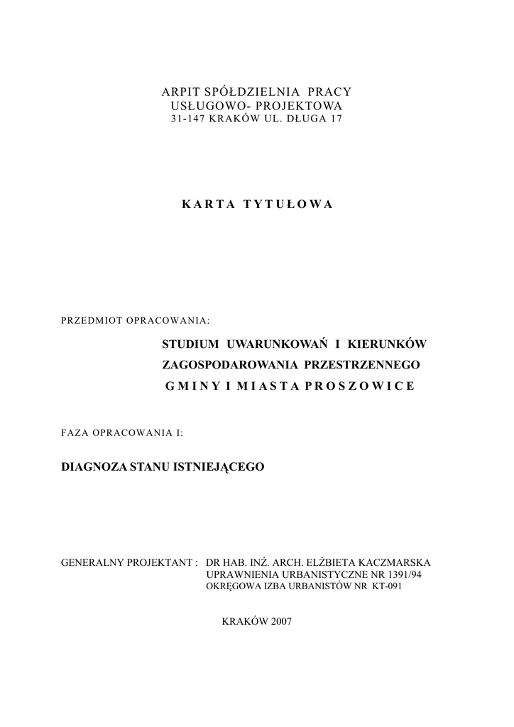 ARPIT SPÓŁDZIELNIA PRACY USŁUGOWO- PROJEKTOWA 31-147 KRAKÓW UL. DŁUGA 17 KARTA TYTUŁOWA PRZEDM IOT OPRACOWANIA: STUDIUM UWARUNKOWAŃ I KIERUNKÓW ZAGOSPODAROWANIA PRZESTRZENNEGO GMI NY I MI ASTA PROS ZOWI CE FAZA OPRACOWANIA I: DIAGNOZA STANU ISTNIEJĄCEGO GENERALNY PROJEKTANT : DR HAB. INś. ARCH. ELśBIETA KACZMARSKA UPRAWNIENIA URBANISTYCZNE NR 1391/94 OKRĘGOWA IZBA URBANISTÓW NR KT-091 KRAKÓW 2007 SPIS TREŚCI: 1.WSTĘP .......................................................................................................................... 1.1 PODSTAWA PRAWNA OPRACOWANIA .......................................................... 1.2. WPROWADZENIE ............................................................................................... 2. MATERIAŁY WEJŚCIOWE ....................................................................................... 3. GMINA I MIASTO NA TLE REGIONU ..................................................................... 3.1.POŁOśENIE MIASTA I GMINY........................................................................... 3.2. OGÓLNA CHARAKTERYSTYKA GMINY........................................................ 4. ŚRODOWISKO PRZYRODNICZE ............................................................................ 4.1. ZASOBY ŚRODOWISKA PRZYRODNICZEGO I WARUNKI EKOFIZJOGRAFICZNE ................................................................................................. 4.2. OCHRONA ZASOBÓW PRZYRODNICZYCH .................................................. 4.2.1.Gleby ................................................................................................................. 4.2.2 Lasy ................................................................................................................... 4.2.3 Pomniki przyrody i zabytkowe parki ............................................................... 4.2.4. ZłoŜa surowców ............................................................................................... 4.3. DIAGNOZA STANU I FUNKCJONOWANIA ŚRODOWISKA ....................... 4.4. OKREŚLENIE UWARUNKOWAŃ EKOFIZJOGRAFICZNYCH .................... 5. SPOŁECZNO- GOSPODARCZE UWARUNKOWANIA ROZWOJU GMINY I MIASTA ........................................................................................................................ CZĘŚĆ A- GMINA .......................................................................................................... 5.1 DEMOGRAFIA ...................................................................................................... 5.1.1. Sytuacja ludnościowa ....................................................................................... 5.1.2. Procesy demograficzne i struktura wiekowa ludności ..................................... 5.2. GOSPODARKA ..................................................................................................... 5.2.1. Podmioty gospodarcze ...................................................................................... 5.2.2. Struktura zatrudnienia ....................................................................................... 5.3. INFRASTRUKTURA SPOŁECZNA..................................................................... 5.3.1. Oświata i wychowanie ...................................................................................... 5.3.2. Kultura .............................................................................................................. 5.3.3. Ochrona zdrowia i opieka połeczna .................................................................. 5.3.4. Sport, rekreacja i turystyka ............................................................................... 5.3.5. Inne placówki usługowe oraz placówki komercyjne ........................................ 5.3.6. Podsumowanie .................................................................................................. 5.4. DZIAŁALNOŚĆ ROLNICZA ............................................................................... 5.4.1. Struktura gruntów rolnych i uwarunkowania agrarne ...................................... 5.4.2. Przydatność rolnicza gleb ................................................................................. 5.4.3. Charakter produkcji rolniczej ........................................................................... 5.4.4. Uwarunkowania rozwoju rolnictwa .................................................................. 5.5. LEŚNICTWO ......................................................................................................... CZĘŚĆ B- MIASTO ........................................................................................................ 5.6. DEMOGRAFIA ..................................................................................................... 5.6.1. Sytuacja ludnościowa ....................................................................................... 5.6.2. Procesy demograficzne i struktura wiekowa ludności ..................................... 5.7. GOSPODARKA .................................................................................................... 5.7.1. Podmioty gospodarcze ..................................................................................... 5.7.2. Struktura zatrudnienia ...................................................................................... 5.7.3. Rolnictwo i leśnictwo ....................................................................................... 4 4 4 6 9 9 9 11 11 11 11 12 12 14 14 16 19 19 19 19 21 26 26 28 29 29 31 31 32 32 33 35 35 37 38 39 40 41 41 41 42 44 44 47 47 1 5.8. INFRASTRUKTURA SPOŁECZNA ................................................................... 5.8.1. Oświata i wychowanie ...................................................................................... 5.8.2. Ochrona zdrowia i opieka społeczna ................................................................ 5.8.3. Kultura………