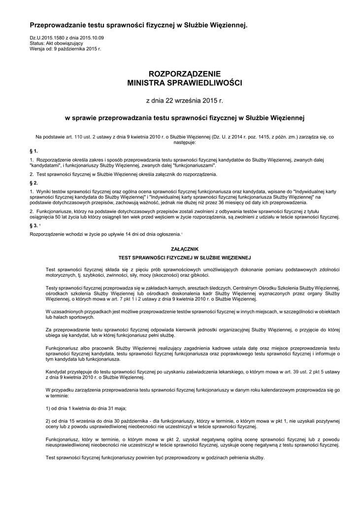 Przeprowadzanie testu sprawności fizycznej w Służbie Więziennej. Dz.U.2015.1580 z dnia 2015.10.09 Status: Akt obowiązujący Wersja od: 9 października 2015 r. ROZPORZĄDZENIE MINISTRA SPRAWIEDLIWOŚCI z dnia 22 września 2015 r. w sprawie przeprowadzania testu sprawności fizycznej w Służbie Więziennej Na podstawie art. 110 ust. 2 ustawy z dnia 9 kwietnia 2010 r. o Służbie Więziennej (Dz. U. z 2014 r. poz. 1415, z późn. zm.) zarządza się, co następuje: § 1. 1. Rozporządzenie określa zakres i sposób przeprowadzania testu sprawności fizycznej kandydatów do Służby Więziennej, zwanych dalej "kandydatami", i funkcjonariuszy Służby Więziennej, zwanych dalej "funkcjonariuszami". 2. Test sprawności fizycznej w Służbie Więziennej określa załącznik do rozporządzenia. § 2. 1. Wyniki testów sprawności fizycznej oraz ogólna ocena sprawności fizycznej funkcjonariusza oraz kandydata, wpisane do "Indywidualnej karty sprawności fizycznej kandydata do Służby Więziennej" i "Indywidualnej karty sprawności fizycznej funkcjonariusza Służby Więziennej" na podstawie dotychczasowych przepisów, zachowują ważność, jednak nie dłużej niż przez 36 miesięcy od daty ich przeprowadzenia. 2. Funkcjonariusze, którzy na podstawie dotychczasowych przepisów zostali zwolnieni z odbywania testów sprawności fizycznej z tytułu osiągnięcia 50 lat życia lub którzy osiągnęli ten wiek przed wejściem w życie rozporządzenia, są zwolnieni z udziału w teście sprawności fizycznej. § 3. 1 Rozporządzenie wchodzi w życie po upływie 14 dni od dnia ogłoszenia.1 ZAŁĄCZNIK TEST SPRAWNOŚCI FIZYCZNEJ W SŁUŻBIE WIĘZIENNEJ Test sprawności fizycznej składa się z pięciu prób sprawnościowych umożliwiających dokonanie pomiaru podstawowych zdolności motorycznych, tj. szybkości, zwinności, siły, mocy (skoczności) oraz gibkości. Testy sprawności fizycznej przeprowadza się w zakładach karnych, aresztach śledczych, Centralnym Ośrodku Szkolenia Służby Więziennej, ośrodkach szkolenia Służby Więziennej lub ośrodkach doskonalenia kadr Służby Więziennej wyznaczonych przez organy Służby Więziennej, o których mowa w art. 7 pkt 1 i 2 ustawy z dnia 9 kwietnia 2010 r. o Służbie Więziennej. W uzasadnionych przypadkach jest możliwe przeprowadzenie testów sprawności fizycznej w innych miejscach, w szczególności w obiektach lub halach sportowych. Za przeprowadzenie testu sprawności fizycznej odpowiada kierownik jednostki organizacyjnej Służby Więziennej, o przyjęcie do której ubiega się kandydat, lub w której funkcjonariusz pełni służbę. Funkcjonariusz albo pracownik Służby Więziennej realizujący zagadnienia kadrowe ustala datę oraz miejsce przeprowadzenia testu sprawności fizycznej kandydata, testu sprawności fizycznej funkcjonariusza oraz poprawkowego testu sprawności fizycznej i informuje o tym kandydata lub funkcjonariusza. Kandydat przystępuje do testu sprawności fizycznej po uzyskaniu zaświadczenia lekarskiego, o którym mowa w art. 39 ust. 2 pkt 5 ustawy z dnia 9 kwietnia 2010 r. o Służbie Więziennej. W przypadku zarządzenia przeprowadzenia testu sprawności fizycznej funkcjonariuszy w danym roku kalendarzowym przeprowadza się go w terminie: 1) od dnia 1 kwietnia do dnia 31 maja; 2) od dnia 15 września do dnia 30 października - dla funkcjonariuszy, którzy w terminie, o którym mowa w pkt 1, nie uzyskali pozytywnej oceny lub z powodu usprawiedliwionej nieobecności nie uczestniczyli w teście sprawności fizycznej. Funkcjonariusz, który w terminie, o którym mowa w pkt 2, uzyskał negatywną ogólną ocenę sprawności fizycznej lub z powodu nieusprawiedliwionej nieobecności nie uczestniczył w teście sprawności fizycznej, uzyskuje ocenę negatywną z testu sprawności fizycznej. Test sprawności fizycznej funkcjonariuszy powinien być przeprowadzony w godzinach pełnienia służby. Wyniki testu sprawności fizycznej kandydata oraz ogólna ocena sprawności fizycznej kandydata powinny być udokumentowane i zawierać następujące informacje: imię i nazwisko, datę urodzenia oraz grupę wiekową, miejsce i datę przeprowadzenia testu, wyniki poszczególnych prób oraz sumę uzyskanych punktów i ocenę. Wyniki testu sprawności fizycznej funkcjonariusza oraz ogólna ocena sprawności fizycznej funkcjonariusza powinny być udokumentowane i zawierać następujące informacje: imię i nazwisko, numer identyfikacyjny funkcjonariusza, datę urodzenia oraz grupę wiekową i dział służby, miejsce i datę przeprowadzenia testu, wyniki poszczególnych prób oraz sumę uzyskanych punktów i ocenę. W przypadku skierowania funkcjonariusza na badania profilaktyczne, wyniki testu sprawności fizycznej funkcjonariusza przedstawia się lekarzowi sprawującemu profilaktyczną opiekę zdrowotną wobec funkcjonariuszy. I. SPOSÓB PRZEPROWADZANIA TESTU SPRAWNOŚCI FIZYCZNEJ Do przeprowadzenia testu sprawności fizycznej ustala się podział na następujące grupy wiekowe: 1) I - do 29 lat; 2) II - 30-39 lat; 3) III - 40-49 lat; 4) IV - 50 i więcej lat. II. OPIS PRZEPROWADZANIA POSZCZEGÓLNYCH PRÓB SPRAWNOŚCIOWYCH, NORMY I OCENY SPRAWNOŚCI Poziom sprawności fizycznej ocenia się na podstawie wyników przeprowadzonych prób sprawnościowych. Próby należy przeprowadzać w następującej kolejności: 1) moc (skoczność) - skok w dal z miejsca; 2) siła - rzut piłką lekarską 2 kg przodem; 3) gibkość - skłon tułowia w przód (postawa stojąca); 4) zwinność - bieg zygzakiem w prostokącie 3x5 m; 5) szybkość: a) bieg wahadłowy 10 x 10 - mężczyźni, b) bieg wahadłowy 6 x 10 - kobiety, c) bieg wahadłowy 6 x 10 - kobiety i mężczyźni dział ochrony od 50 roku życia. 1. PRÓBA MOCY (SKOCZNOŚCI) - SKOK W DAL Z MIEJSCA 1) sposób wykonania (przyrządy i przybory: kreda, taśma miernicza): badany staje w małym rozkroku z ustawionymi równolegle stopami przed wyznaczoną linią, następnie pochyla tułów d
