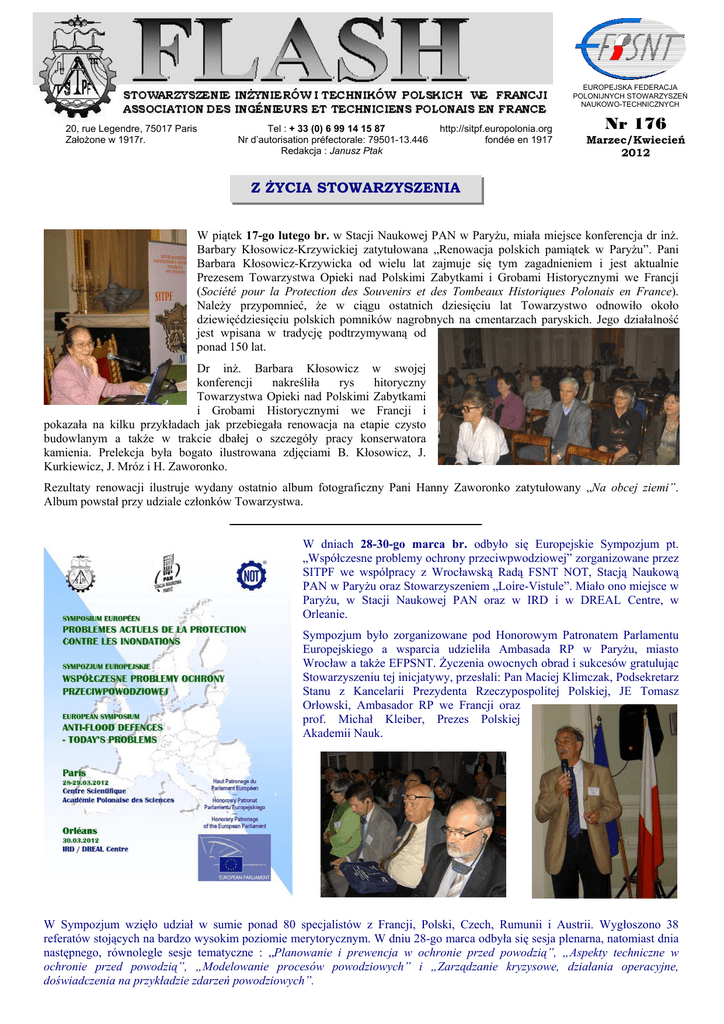 EUROPEJSKA FEDERACJA POLONIJNYCH STOWARZYSZEŃ NAUKOWO-TECHNICZNYCH 20, rue Legendre, 75017 Paris Założone w 1917r. Tel : + 33 (0) 6 99 14 15 87 Nr d’autorisation préfectorale: 79501-13.446 Redakcja : Janusz Ptak http://sitpf.europolonia.org fondée en 1917 Nr 176 Marzec/Kwiecień 2012 Z ŻYCIA STOWARZYSZENIA W piątek 17-go lutego br. w Stacji Naukowej PAN w Paryżu, miała miejsce konferencja dr inż. Barbary Kłosowicz-Krzywickiej zatytułowana „Renowacja polskich pamiątek w Paryżu”. Pani Barbara Kłosowicz-Krzywicka od wielu lat zajmuje się tym zagadnieniem i jest aktualnie Prezesem Towarzystwa Opieki nad Polskimi Zabytkami i Grobami Historycznymi we Francji (Société pour la Protection des Souvenirs et des Tombeaux Historiques Polonais en France). Należy przypomnieć, że w ciągu ostatnich dziesięciu lat Towarzystwo odnowiło około dziewięćdziesięciu polskich pomników nagrobnych na cmentarzach paryskich. Jego działalność jest wpisana w tradycję podtrzymywaną od ponad 150 lat. Dr inż. Barbara Kłosowicz w swojej konferencji nakreśliła rys hitoryczny Towarzystwa Opieki nad Polskimi Zabytkami i Grobami Historycznymi we Francji i pokazała na kilku przykładach jak przebiegała renowacja na etapie czysto budowlanym a także w trakcie dbałej o szczegóły pracy konserwatora kamienia. Prelekcja była bogato ilustrowana zdjęciami B. Kłosowicz, J. Kurkiewicz, J. Mróz i H. Zaworonko. Rezultaty renowacji ilustruje wydany ostatnio album fotograficzny Pani Hanny Zaworonko zatytułowany „Na obcej ziemi”. Album powstał przy udziale członków Towarzystwa. W dniach 28-30-go marca br. odbyło się Europejskie Sympozjum pt. „Współczesne problemy ochrony przeciwpwodziowej” zorganizowane przez SITPF we wspólpracy z Wrocławską Radą FSNT NOT, Stacją Naukową PAN w Paryżu oraz Stowarzyszeniem „Loire-Vistule”. Miało ono miejsce w Paryżu, w Stacji Naukowej PAN oraz w IRD i w DREAL Centre, w Orleanie. Sympozjum było zorganizowane pod Honorowym Patronatem Parlamentu Europejskiego a wsparcia udzieliła Ambasada RP w Paryżu, miasto Wrocław a także EFPSNT. Życzenia owocnych obrad i sukcesów gratulując Stowarzyszeniu tej inicjatywy, przesłali: Pan Maciej Klimczak, Podsekretarz Stanu z Kancelarii Prezydenta Rzeczypospolitej Polskiej, JE Tomasz Orłowski, Ambasador RP we Francji oraz prof. Michał Kleiber, Prezes Polskiej Akademii Nauk. W Sympozjum wzięło udział w sumie ponad 80 specjalistów z Francji, Polski, Czech, Rumunii i Austrii. Wygłoszono 38 referatów stojących na bardzo wysokim poziomie merytorycznym. W dniu 28-go marca odbyła się sesja plenarna, natomiast dnia następnego, równolegle sesje tematyczne : „Planowanie i prewencja w ochronie przed powodzią”, „Aspekty techniczne w ochronie przed powodzią”, „Modelowanie procesów powodziowych” i „Zarządzanie kryzysowe, działania operacyjne, doświadczenia na przykładzie zdarzeń powodziowych”. Zostały zorganizowane dwie debaty „okrągłego stołu” pod wspólnym hasłem „Jak żyć z powodziami?”, ukierunkowane na dwa zagadnienia „Kompleksowe, innowacyjne i ekonomiczne zarządzanie ochroną przeciwpowodziową na skalę krajową i europejską” oraz „Aspekt techniczny i technologiczny ochrony przeciwpowodziowej”. Wykazały one zbieżność problemów wśród przedstawicieli krajów obecnych na Sympozjum a tym samym na możliwości współpracy międzynarodowej. Jednodniowy wyjazd do IRD i DREAL Centre w Orleanie, gdzie uczestnicy mogli się dodatkowo zapoznać się z funkcjonowaniem centrum zarządzania wezbraniami w czasie rzeczywistym oraz spotkać się z tamtejszymi specjalistami i wymienić doświadczenia, przyczynił się znacznej mierze do wzmocnienia bezpośrednich kontaktów, co było celem Sympozjum. Nie obyło się bez części mniej studyjnych jakimi bez wątpienia były: przyjęcie uczestników przez J.E. Ambasadora T.Orłowskiego w salonach Ambasady RP oraz kolacja połączona ze spacerem statkiem po Sekwanie. Wnioski z Sympozjum sporządzone przez polsko-francuską Komisję Wnioskową zostaną przesłane do kompetentnych władz polskich i francuskich. W uznaniu wybitnego wkładu w organizację i wsparcie inicjatywy SITPF, Złote Odznaki SITPF otrzymali: mgr inż. Zbigniew Gąsowski ze Stowarzyszenia „Loire-Vistule”, Członek SITPF dr hab. inż.. Jerzy Niziński oraz Prezes Wrocławskiej Rady FSNT NOT, dr hab. inż. Czesław Szczegielniak. Pełne sprawozdanie stanowi przedmiot specjalnego wydania „Biuletynu Sympozjum”. Z ŻAŁOBNEJ KARTY W dniu 7-go marca br. tragiczną śmiercią zginął w Moskwie Marc Kleniewski, syn naszego Kolegi Andrzeja Kleniewskiego, Członka SITPF i Kawalera Legii Honorowej. Szczere wyrazy współczucia naszemu Koledze składają Prezes i Zarząd SITPF AGENDA SITPF W sobotę 28-go kwietnia br. odbędzie się w Stacji Naukowej PAN w Paryżu Walne Zebranie SITPF. Zebranie rozpoczenie się punktualnie o godz. 14:30. Prosimy zatem Koleżanki i Kolegów o punktualne przybycie, gdyż po ropoczęciu zebrania nie będziemy mogli zapewnić serwisu otwierania drzwi wejściowych, obowiązek który spada na SITPF z uwagi na fakt, że w sobotę serwis ten nie może być zapewniony przez personel Stacji PAN. W tym roku Zebranie będzie połączone z wyborami nowych władz SITPF: Prezesa, Zarządu, Komisji Rewizyjnej i Sądu Koleżeńskiego. Zapraszamy zatem Koleżanki i Kolegów do aktywnego włączenia się w życie Stowarzyszenia. APEL DO CZŁONKÓW I SYMPATYKÓW Jakkolwiek rok 2011 już dawno dobiegł końca, wielu członków nie uregulowało jeszcze składki za rok ubiegły. W związku z powyższym, Zarząd pozwala sobie przypomnieć Członkom Aktywnym Stowarzyszenia, o obowiazku uregulowania składki członkowskiej w wysokosci 45 € za rok 2011 oraz 50 € w 2012 r., zgodnie z uchwałą Walnego Zebrania z kwietnia 2011 r. Natomiast, Członkom Wspierającym i tym Sympatykom, którzy chcieliby wznowić swoje wsparcie, 
