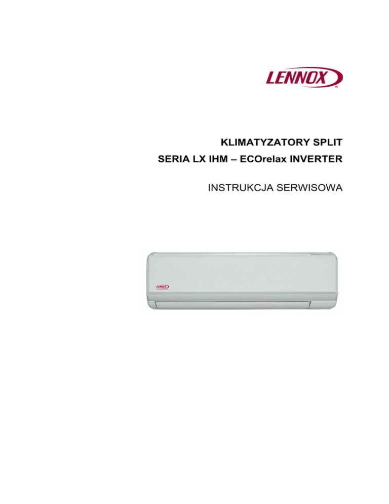 KLIMATYZATORY SPLIT SERIA LX IHM – ECOrelax INVERTER INSTRUKCJA SERWISOWA SPIS TREŚCI 1. Środki ostrożności 1.1 Środki bezpieczeństwa 1.2 Ostrzeżenia 2. Funkcje 3. Wymiary 3.1 Jednostka wewnętrzna 3.2 Jednostka zewnętrzna 4. Schemat obiegu chłodniczego 5. Schemat elektryczny 5.1 Jednostka wewnętrzna 5.2 Jednostka zewnętrzna 6. Instrukcja instalacji 6.1 Tabela siły dokręcania kluczem dynamometrycznym 6.2 Podłączenie kabli 6.3 Długość i wzniesienie instalacji rurowej 6.4 Pierwsza instalacja 6.5 Dodawanie czynnika chłodniczego po kilkuletnim użytkowaniu systemu 6.6 Powtórna instalacja po naprawie jednostki wewnętrznej 6.7 Powtórna instalacja po naprawie jednostki zewnętrznej 7. Charakterystyka pracy 8. Funkcje elektroniczne 8.1 Skróty 8.2 Funkcje wyświetlacza 8.3 Główne zabezpieczenia 8.4 Tryby pracy i funkcje 9. Rozwiązywanie problemów 9.1 Błędy na wyświetlaczu jednostki wewnętrznej 9.2 Diagnoza i rozwiązanie problemu 1. Środki ostrożności 1.1 Środki bezpieczeństwa Aby zapobiec obrażeniom ciała użytkownika, innych osób lub zniszczeniu mienia, należy przestrzegać poniższych środków ostrożności. Nieprawidłowa obsługa wynikająca z ignorowania instrukcji może spowodować obrażenia lub zniszczenia. Przed serwisowaniem urządzenia należy zapoznać się z niniejsza instrukcją. 1.2 Ostrzeżenia Instalacja Nie używać automatycznego bezpiecznika który jest wadliwy lub ma zbyt niskie wartości prądowe. Istnieje ryzyko pożaru lub porażenia prądem. Aby wykonać instalację elektryczną należy skontaktować się z dealerem, sprzedawcą, wykwalifikowanym elektrykiem lub autoryzowanym serwisem. Nie demontować i nie reperować urządzenia, gdyż istnieje ryzyko pożaru lub porażenia prądem. Zawsze uziemić produkt. Istnieje ryzyko pożaru lub porażenia prądem. Zainstalować i zabezpieczyć panel oraz pokrywę skrzynki sterującej. Istnieje ryzyko pożaru lub porażenia prądem. Zawsze instalować dedykowany obwód i bezpiecznik. Nieprawidłowe podłączenie lub instalacja może spowodować pożar lub porażenie prądem. Zastosować wyłącznik z bezpiecznikiem o właściwych parametrach. Istnieje ryzyko pożaru lub porażenia prądem. Nie wolno modyfikować lub przedłużać kabla zasilającego. Istnieje ryzyko pożaru lub porażenia prądem. Nie wolno samodzielnie (przez Użytkownika) instalować, demontować lub ponownie instalować urządzenia. Istnieje ryzyko pożaru, porażenia prądem elektrycznym, wybuchu lub obrażeń. Należy zachować ostrożność podczas rozpakowywania i instalacji produktu. Ostre krawędzie mogą spowodować obrażenia, należy zachować szczególną ostrożność w przypadku krawędzi lameli na skraplaczu i parowniku. W przypadku instalacji, zawsze skontaktować się z dealerem, lub autoryzowanym serwisem. Nie należy instalować produktu na wadliwej podstawie montażowej. Upewnić się, że miejsce montażu nie pogarsza się z czasem. Jeżeli podstawa zapadnie się, klimatyzator może spaść razem z nią, powodując uszkodzenia mienia, uszkodzenia produktu i obrażenia ciała. Nie dopuszczać do pracy klimatyzatora przez długi czas, gdy wilgotność powietrza jest bardzo wysoka, a drzwi lub okno jest otwarte. Upewnić się, aby podczas pracy przewód zasilający nie został uszkodzony lub wyciągnięty. Istnieje ryzyko pożaru lub porażenia prądem. Nie należy umieszczać żadnych przedmiotów na przewodzie zasilającym. Istnieje ryzyko pożaru lub porażenia prądem. Nie wkładać ani wyjmować wtyczki zasilania z gniazda podczas pracy urządzenia. Istnieje ryzyko pożaru lub porażenia prądem. Nie dotykać urządzenia (podczas pracy) mokrymi rękami. Nie ustawiać nagrzewnic lub innych urządzeń w pobliżu kabla zasilającego. Istnieje ryzyko pożaru i porażenia prądem elektrycznym. Nie wolno dopuścić do przedostania się wody do elementów elektrycznych. Może to spowodować pożar, awarię urządzenia, lub porażenie prądem. Nie wolno przechowywać lub używać łatwopalnych gazów lub materiałów w pobliżu urządzenia. Istnieje ryzyko pożaru lub awarii urządzenia. Nie wolno używać urządzenia w szczelnie zamkniętym pomieszczeniu przez długi czas. Może wystąpić niedobór tlenu. Jeśli wystąpi wyciek łatwopalnego gazu, wyłączyć gaz i otworzyć okno w celu wentylacji przed włączeniem urządzenia. Jeśli z urządzenia wydostają się dziwne dźwięki lub dym, wyłączyć urządzenie wyłącznikiem głównym lub odłączyć kabel zasilający. Istnieje ryzyko porażenia prądem lub pożaru. Podczas burzy lub huraganu wyłączyć urządzenie i zamknąć okno. Jeśli to możliwe, należy usunąć urządzenie przed nadejściem huraganu. Istnieje ryzyko uszkodzenia mienia, uszkodzenia produktu lub porażenia prądem. Nie należy otwierać kratki na wlocie podczas pracy urządzenia. (Nie dotykać filtra elektrostatycznego, jeśli urządzenie jest weń wyposażone). Istnieje ryzyko obrażeń ciała, porażenia prądem elektrycznym lub uszkodzenia produktu. Jeśli produkt zamoknie, skontaktować się z autoryzowanym serwisem. Istnieje ryzyko pożaru lub porażenia prądem. Należy uważać, aby woda nie dostała się do środka urządzenia. Istnieje ryzyko pożaru, porażenia prądem lub uszkodzenie produktu. Od czasu do czasu należy przewietrzyć produkt, gdy pracuje razem z piecem, itd. Istnieje ryzyko pożaru lub porażenia prądem. Wyłączyć główne zasilanie w czasie czyszczenia lub konserwacji urządzenia. Istnieje ryzyko porażenia prądem. Jeśli produkt nie będzie używany przez dłuższy czas, należy odłączyć kabel zasilający lub wyłączyć bezpiecznik. Istnieje ryzyko uszkodzenia lub niezamierzonego włączenia się urządzenia. Należy dopilnować, aby nikt nie mógł nadepnąć lub upaść na jednostkę zewnętrzną. Może to spowodować obrażenia ciała i uszkodzenie urządzenia. UWAGI DOTYCZĄCE ŚRODKÓW OSTROŻNOŚCI Po instalacji lub naprawie urządzen