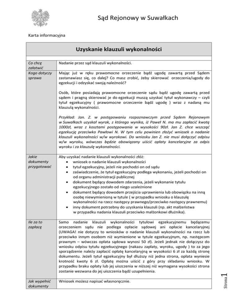 Sąd Rejonowy w Suwałkach Karta informacyjna Uzyskanie klauzuli wykonalności Co chcę załatwić Kogo dotyczy sprawa Nadanie przez sąd klauzuli wykonalności. Mając już w ręku prawomocne orzeczenie bądź ugodę zawartą przed Sądem zastanawiasz się, co dalej? Co masz zrobić, żeby skierować orzeczenia/ugody do egzekucji i odzyskać swoją należność? Osób, które posiadają prawomocne orzeczenie sądu bądź ugodę zawartą przed sądem i pragną skierować je do egzekucji muszą uzyskać tytuł wykonawczy – czyli tytuł egzekucyjny ( prawomocne orzeczenie bądź ugodę ) wraz z nadaną mu klauzulą wykonalności. Aby uzyskać nadanie klauzuli wykonalności złóż: wniosek o nadanie klauzuli wykonalności tytuł egzekucyjny, jeżeli nie pochodzi on od sądu zaświadczenie, że tytuł egzekucyjny podlega wykonaniu, jeżeli pochodzi on od organu administracji publicznej dokument będący dowodem zdarzenia, jeżeli wykonanie tytułu egzekucyjnego zostało od niego uzależnione dokument będący dowodem przejścia uprawnienia lub obowiązku na inną osobę niewymienioną w tytule ( w przypadku wniosku o klauzulę wykonalności na rzecz następcy prawnego/przeciwko następcy prawnemu) inny dokument potrzebny do uzyskania klauzuli (np. akt małżeństwa w przypadku nadania klauzuli przeciwko małżonkowi dłużnika). Ile za to zapłacę Samo nadanie klauzuli wykonalności tytułowi egzekucyjnemu będącemu orzeczeniem sądu nie podlega opłacie sądowej ani opłacie kancelaryjnej (UWAGA! nie dotyczy to wniosków o nadanie klauzuli wykonalności na rzecz lub przeciwko innym osobom niż wymienione w tytule egzekucyjnym, np. następcom prawnym – wówczas opłata sądowa wynosi 50 zł). Jeżeli jednak nie dołączysz do wniosku odpisu tytułu egzekucyjnego (nakazu zapłaty, wyroku, ugody ) to za jego sporządzenie należy zapłacić opłatę kancelaryjną w wysokości 6 zł za każdą stronę dokumentu. Jeżeli tytuł egzekucyjny był dłuższy niż jedna strona, opłata wyniesie krotność kwoty 6 zł. Opłatę można uiścić z góry przy składaniu wniosku. W przypadku braku opłaty lub jej uiszczenia w niższej niż wymagana wysokości strona zostanie wezwana do jej uiszczenia bądź uzupełnienia. Jak wypełnić dokumenty Wniosek możesz napisać własnoręcznie. Strona Jakie dokumenty przygotować 1 Przykład: Jan. Z. w postępowaniu rozpoznawczym przed Sądem Rejonowym w Suwałkach uzyskał wyrok, z którego wynika, iż Paweł N. ma mu zapłacić kwotę 1000zł, wraz z kosztami postępowania w wysokości 90zł. Jan Z. chce wszcząć egzekucję przeciwko Pawłowi N. W tym celu powinien złożyć wniosek o nadanie klauzuli wykonalności w/w wyrokowi. Do wniosku Jan Z. nie musi dołączyć odpisu w/w wyroku, wówczas będzie obowiązany uiścić opłaty kancelaryjne za odpis wyroku i za klauzulę wykonalności. Sąd Rejonowy w Suwałkach Kiedy złożyć dokumenty Dokumenty złóż po uprawomocnieniu się orzeczenia sądu, z którego wynika, że masz prawo dochodzić od kogoś należności. Gdzie złożyć wniosek Sądem właściwym do nadania klauzuli jest: w przypadku tytułu pochodzącego od sądu (wyrok, nakaz zapłaty, postanowienie, ugoda) właściwym jest sąd pierwszej instancji, przed którym sprawa się toczy albo sąd drugiej instancji (jeżeli akta sprawy tam się znajdują); w przypadku tytułu pochodzącego od sądu administracyjnego lub innego orzeczenia, ugody lub aktu (które z mocy ustawy podlegają wykonaniu w drodze egzekucji sądowej) właściwym jest sąd rejonowy w okręgu, którego dłużnik ma miejsce zamieszkania lub siedzibę. Gdy tego nie można ustalić właściwym jest sąd rejonowy w okręgu, którego ma być wszczęta egzekucja; w przypadku orzeczenia sądu zagranicznego właściwym jest sąd okręgowy w okręgu, którego dłużnik ma miejsce zamieszkania lub siedzibę. Gdy tego nie można ustalić właściwym jest sąd okręgowy w okręgu, którego ma być wszczęta egzekucja. Ile czasu ma sąd na odpowiedź Wniosek o nadanie klauzuli powinien być rozpoznany niezwłocznie, nie później niż w terminie 3 dni od dnia jego zgłoszenia, ewentualnie od dnia usunięcia jego braków jeżeli wniosek był nimi dotknięty. Jednakże nadanie klauzuli po tym terminie jest skuteczne i nie może być podważone. Podstawa prawna art. 776-795 Kodeksu postępowania cywilnego, a szczegóły techniczne zawarto w § 180-188 regulaminu sądowego ustawa z dnia 28 lipca 2005 roku o kosztach sądowych sprawach cywilnych (tekst jednolity Dz. U. z 2014 roku poz. 1025) Strona 2 Przedstawione wyżej treści mają charakter informacyjny i nie mogą stanowić wykładni prawa